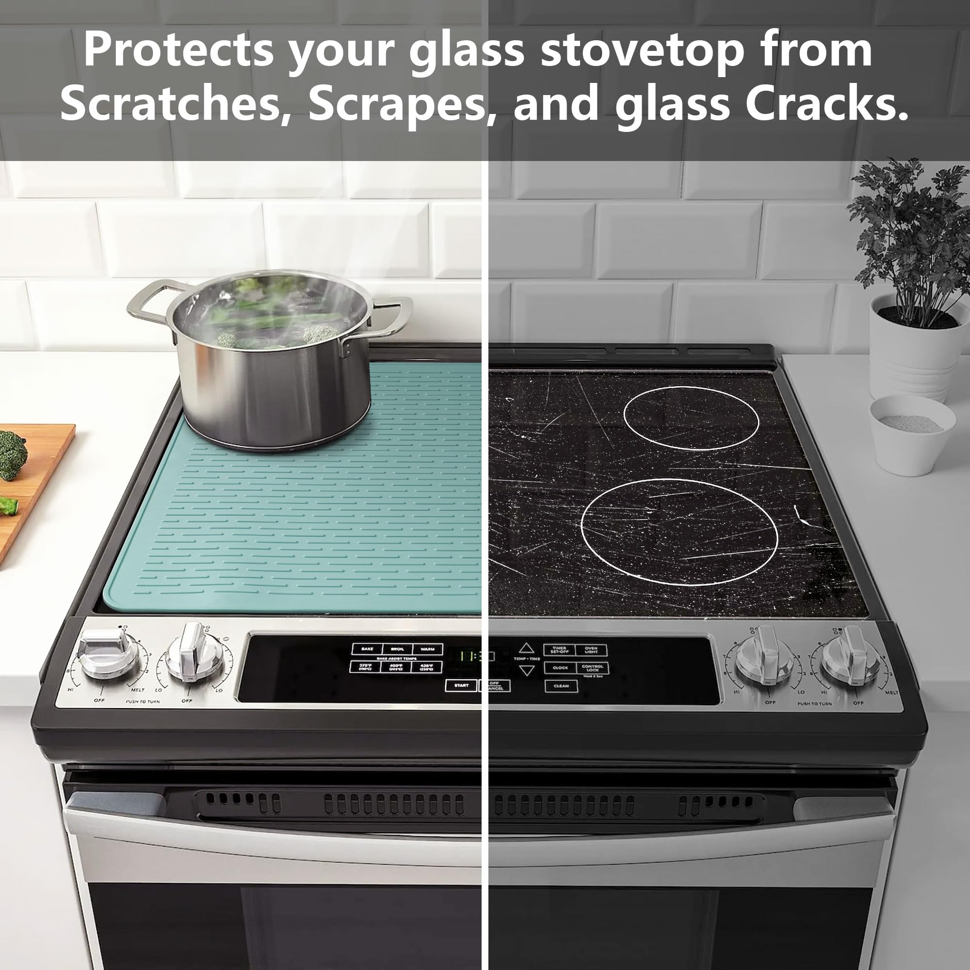 Glass Top Stove Cover:This extra large 28" x 20" inches silicone stove cover for glass top electric stove is perfect for protecting your electric stove top, kitchen counter top, electric cooktop, table, or washer-dryer top from scratches, spills, stains, scrapes, and dirt. It keeps the surface clean and tidy while providing an expandable workbench for food preparation.