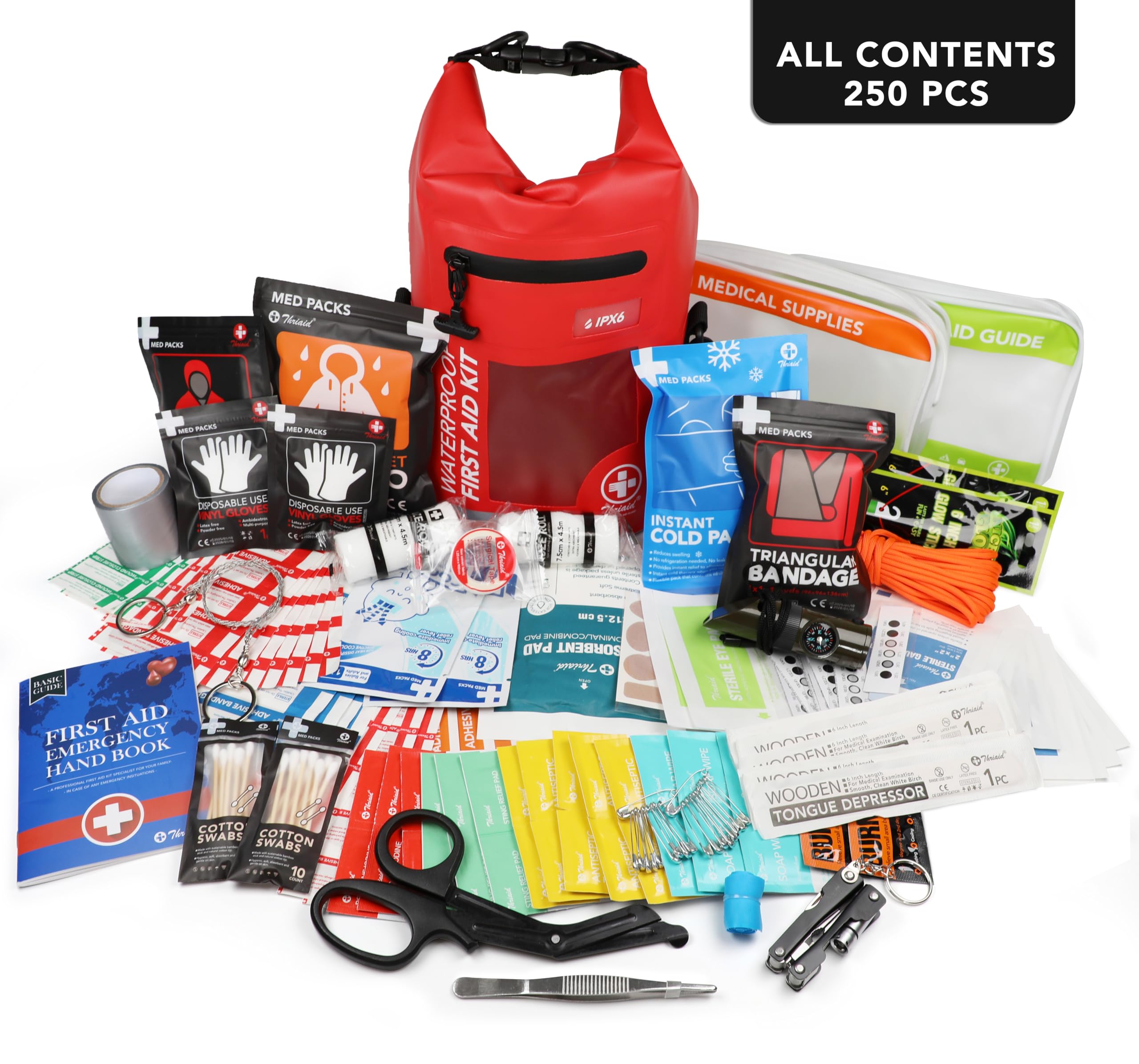 EFFICIENT MEDICAL ITEMS & SURVIVAL TOOLS ▶ Equipped with 250 PCS professional-grade medical items and efficient outdoor tools such as Mylar Blanket, Aluminum Plated Poncho, Multi-Functional Whistle & Compass, Multi-Functional Pliers, Duct Tape 5m, Survival Paracord Rope 10m, Glow Stick, Instant Cold Pack, etc. Meets international medical standards, 100% latex free.