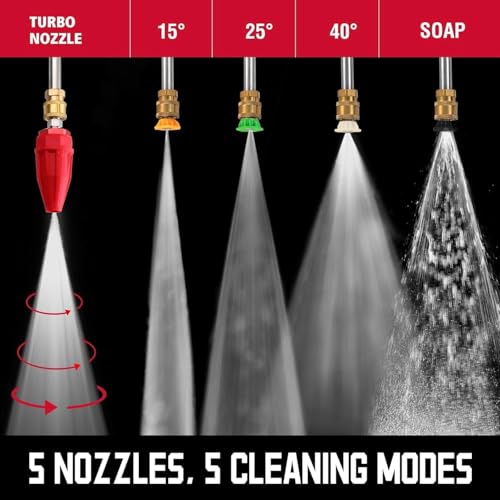 5 Spray Tips Included – For All Surface Types – Comes with 15°, 25°, 40°, foam, and lotus-shaped fan spray nozzles, this pressure washer handles every cleaning need, from heavy grime on walls to gentle foam for outdoor furniture.