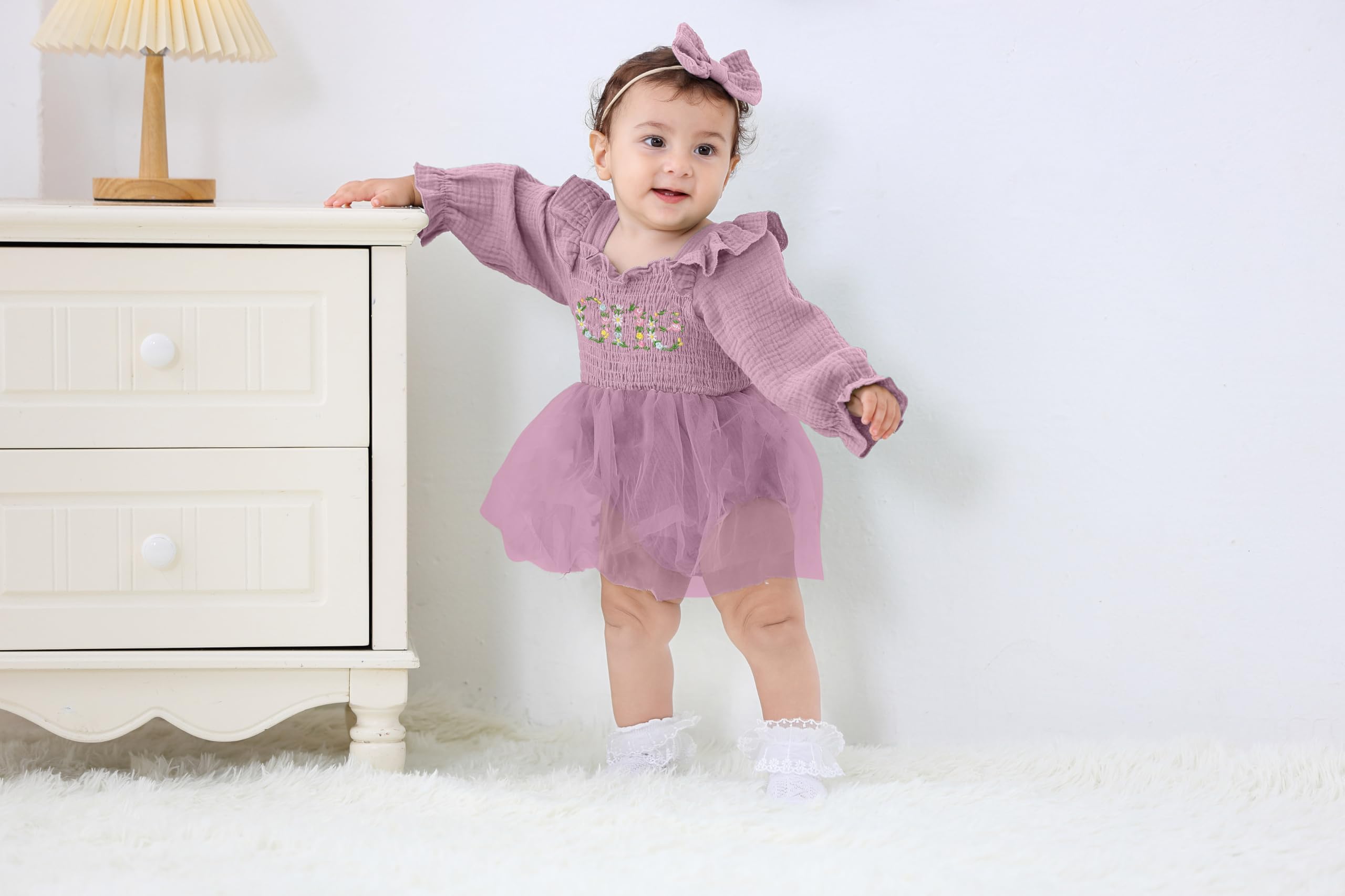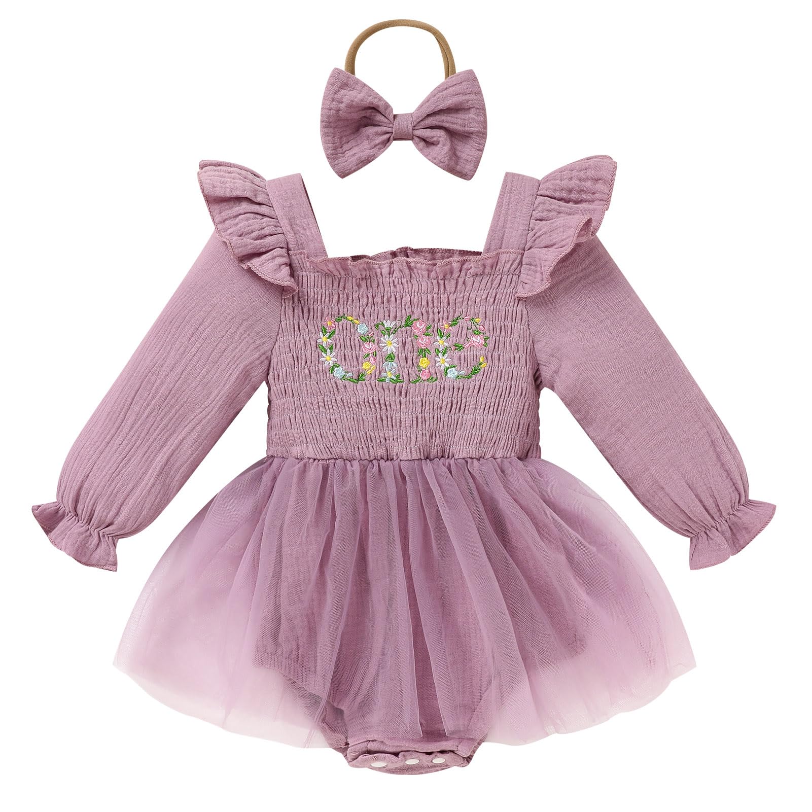 Design: Newborn baby girl playwear romper dress with long sleeve, solid color, multi-layered tulle, Snap leg openings for easy diaper changes, easier morning for novice mother.Cute princess 1st birthday outfit, fashionable and adorable embroidery ONE printed themed birthday clothes perfect for creating beautiful memory of her first birthday.