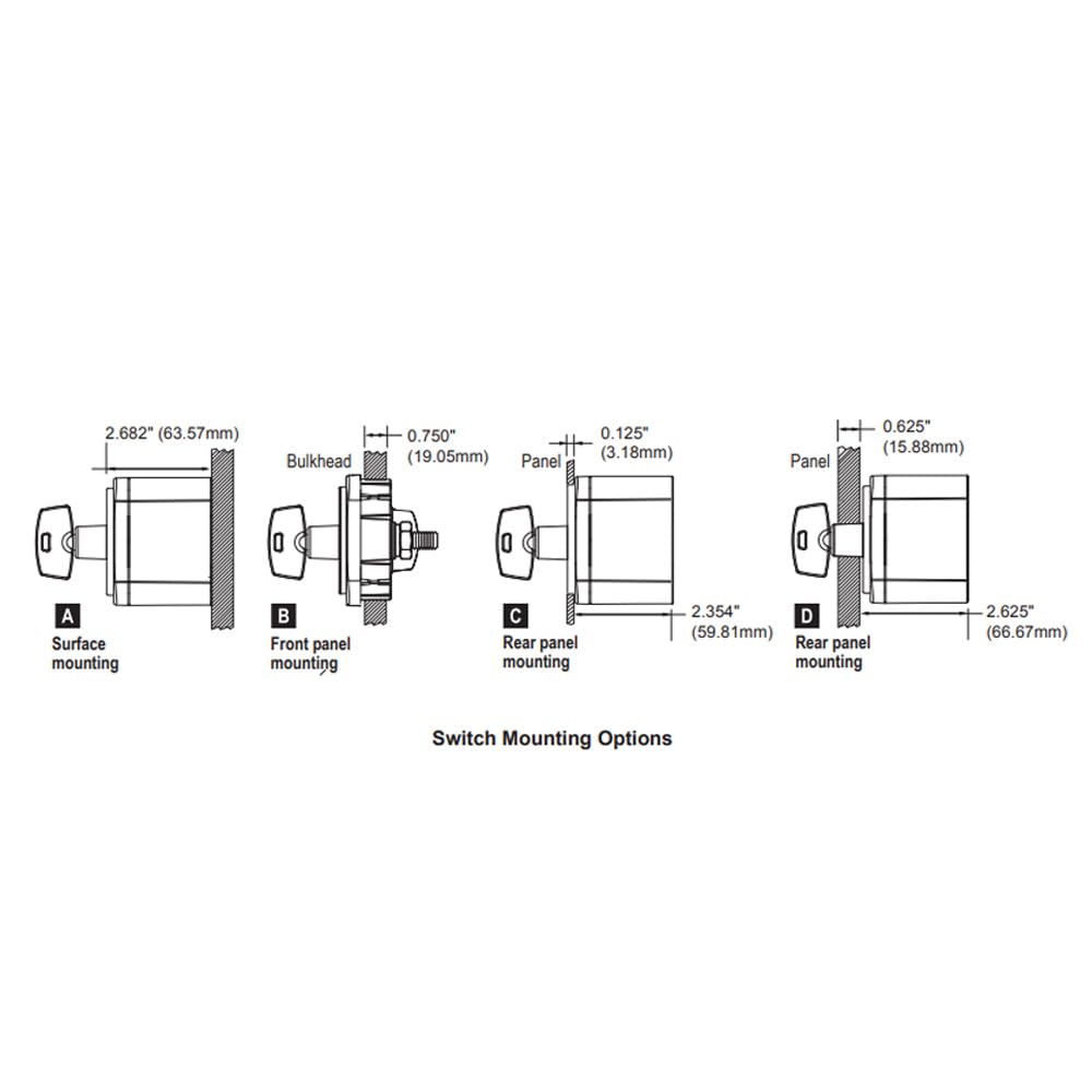 This compact battery switch is designed to manage a single battery connected to a single load group and supports flexible installation in a variety of panel or engine room layouts. Its small footprint and three available mounting options make it suitable for areas with limited space. The switch includes ignition protection for use in gasoline powered engine compartments, allowing safe placement in locations that require protected components. The tactile surface of the switch face and the removable knob help support operation in low light conditions and contribute to preventing unintended power flow during electrical system service. Tin plated copper terminal studs are built as a single piece and provide sufficient length for connecting multiple cables while supporting secure fastening. With its combination of protective features, connection capacity, and adaptable mounting options, this switch offers a practical solution for managing basic battery control needs in marine electrical systems.