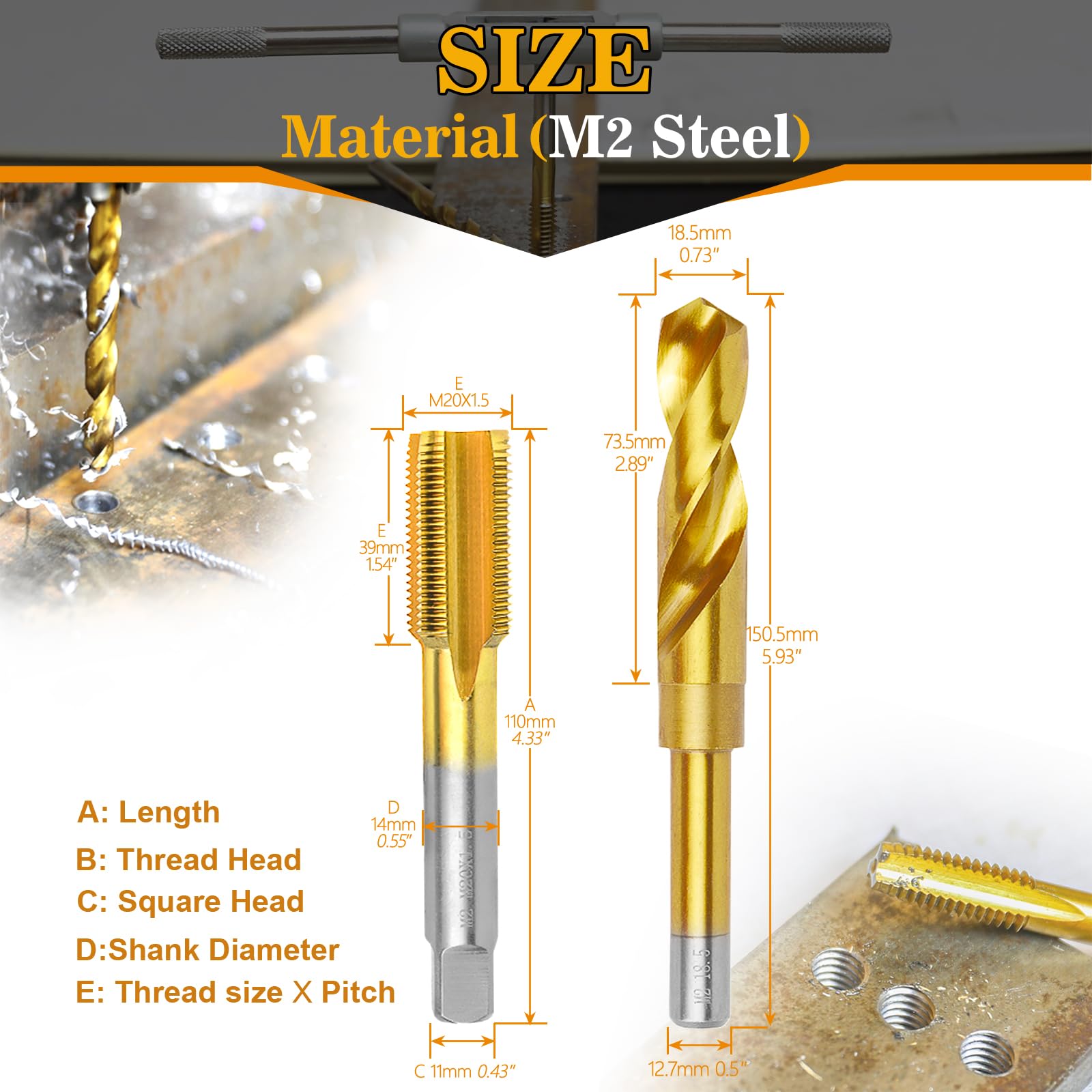 【Size】Include M20x1.5 M2 steel tap and 18.5mm M2 HSS drill bit with round shank,all stored in a storage box for easy carrying.