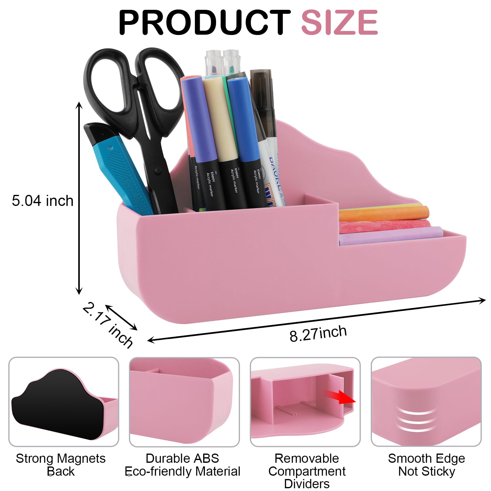 Upgraded Magnetic Pen Holder:Magnetic marker holder adopts adjustable divider design,there are a movable divider and 2 slots inside. There is also an extended small compartment that can hold small clips, chalk, or sticky notes.Magnetic dry erase marker holder's dimensions is 8.27L x 2.17W x 5.04H inches,you can choose your storage Organizer of different sizes as you like.