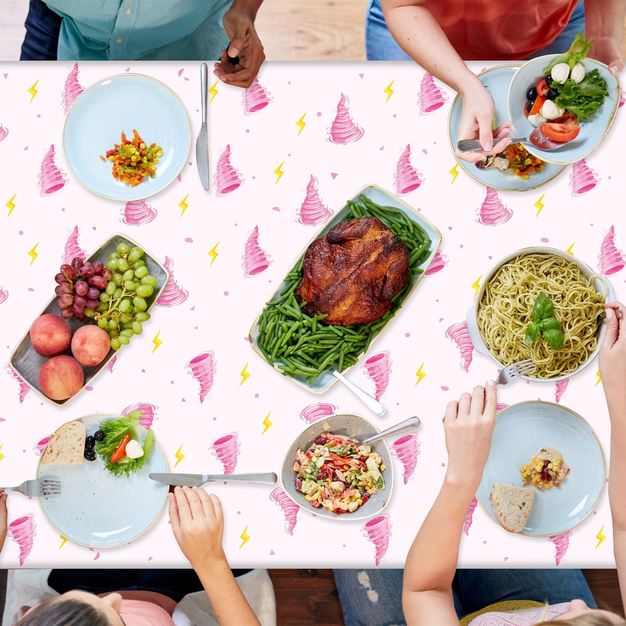 Fitting Size: Our cute tornado birthday table covers measure approximately 87 x 51 inches, which is enough to cover any standard 8-foot rectangular table and is ideal for medium-sized tables of many shapes. Additionally, the tornado themed tablecloths can be cut to a size more suitable for smaller tables and are available in ample quantities for all birthday party table decorating and changing needs.