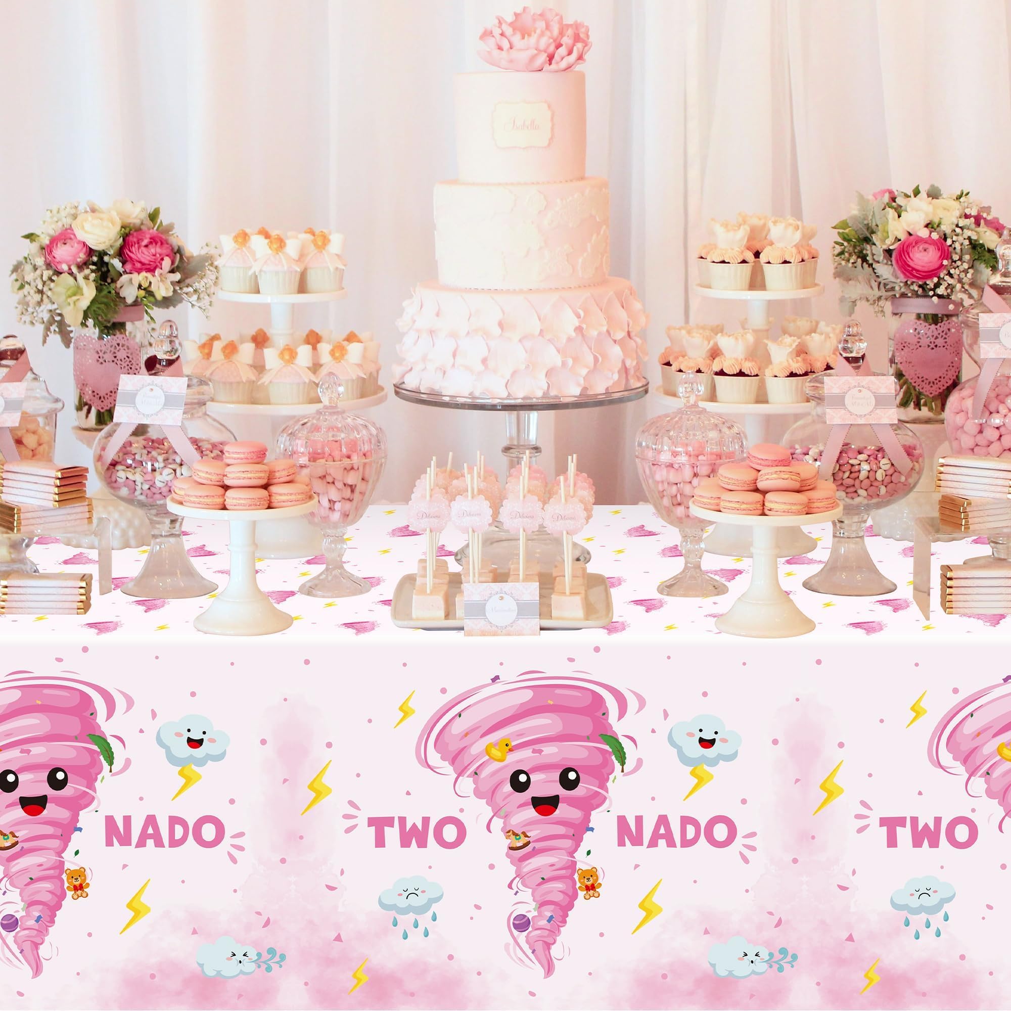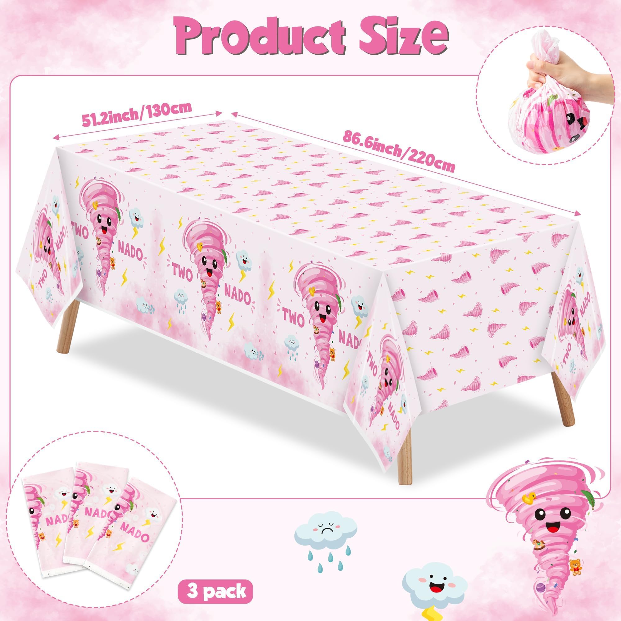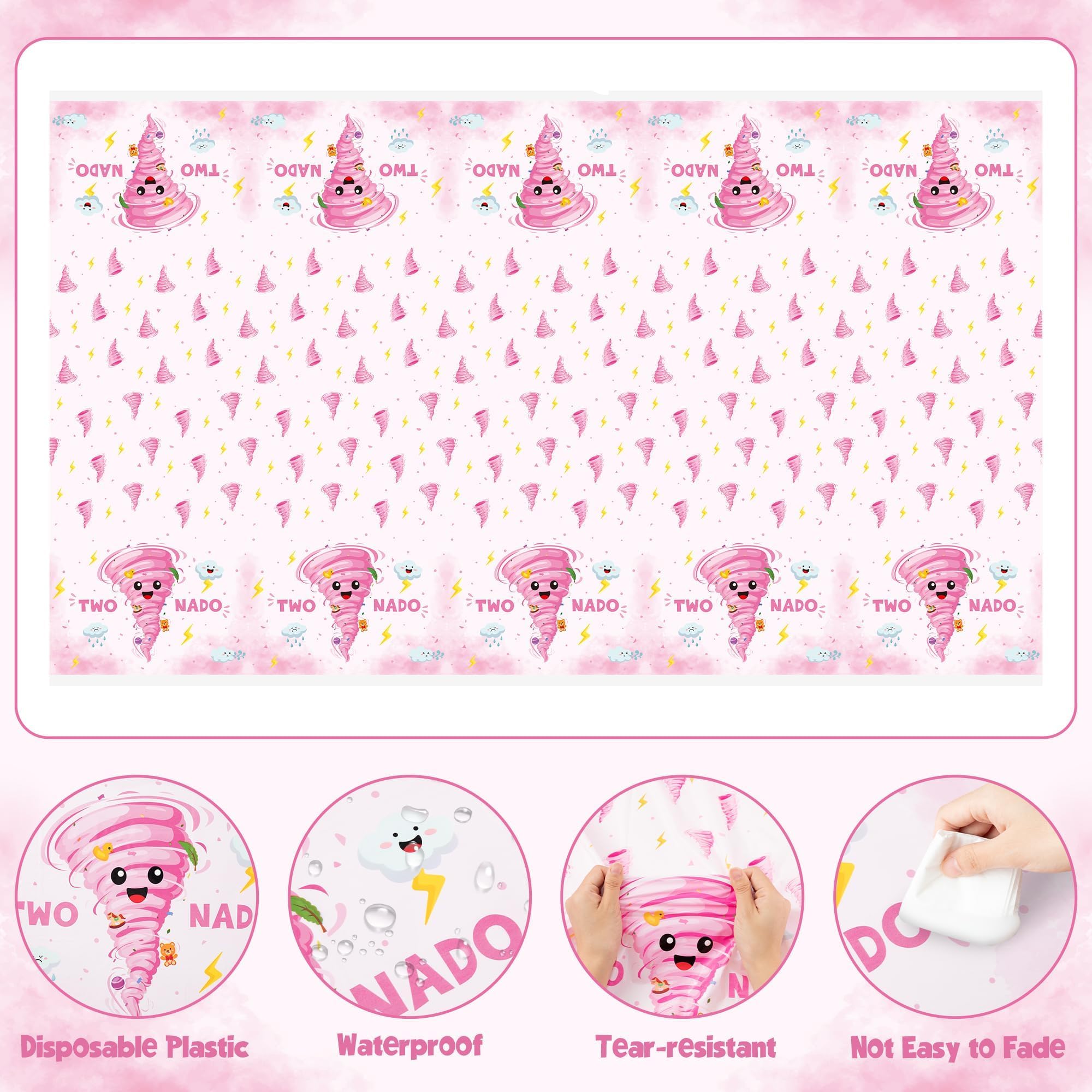 Pink Two Nado Patterns: Our two nado birthday party tablecloths are designed with a cute and funny two nado theme, which can easily create a joyful and fun atmosphere for your party. Unique and fun designs not only add attraction, but also make your theme party stand out.