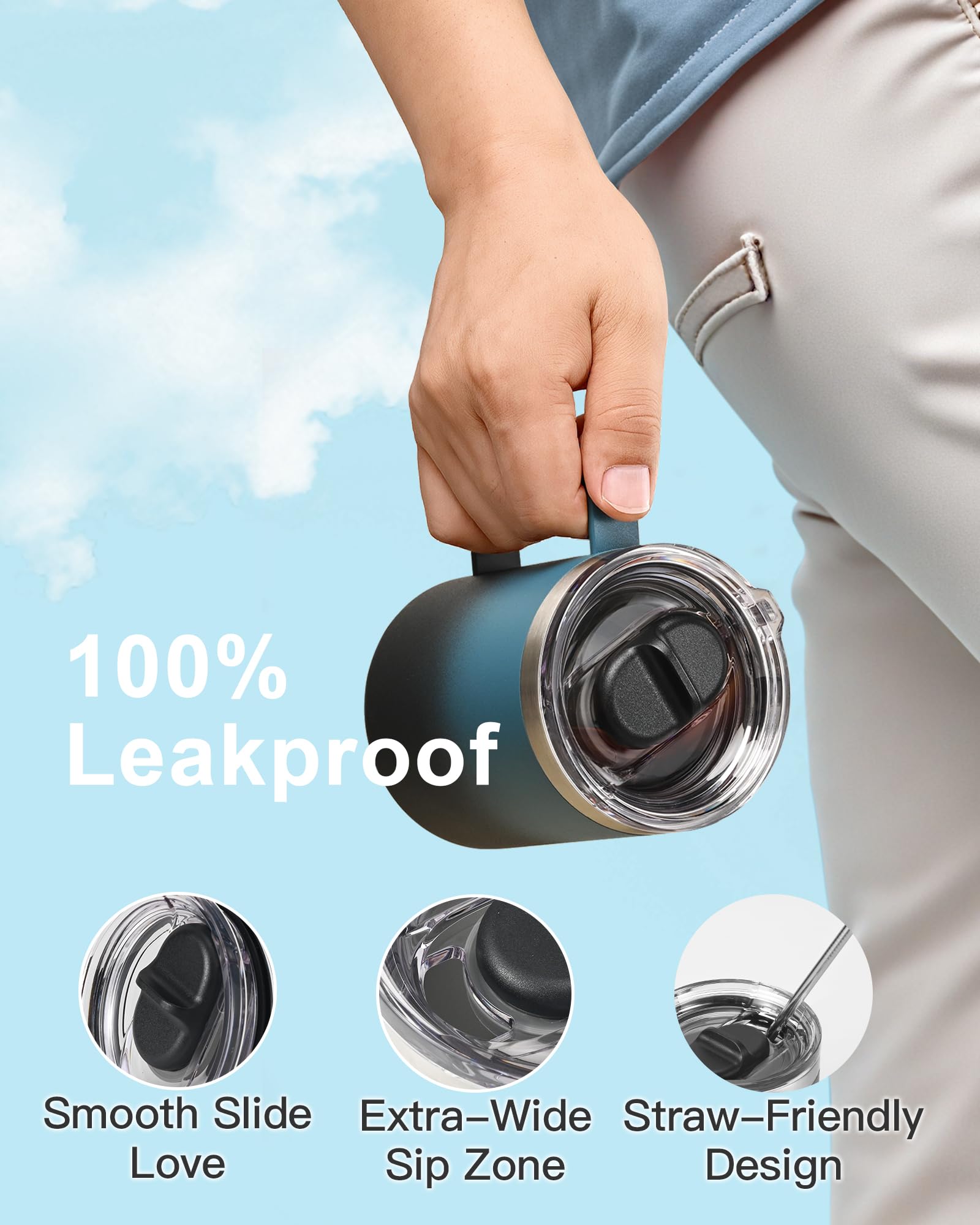 100% Leak-Proof Slider Lid: Exclusive slider lid glides smoothly,settled and locks securely with an airtight seal, staying 100% leak-free even when inverted. Youβll love the effortless sliding action that makes sipping on the go a breeze. Stainless steel coffee mugβs wide-mouth design with soft straws lets you sip comfortably, whether youβre using a straw or drinking straight from the cup!