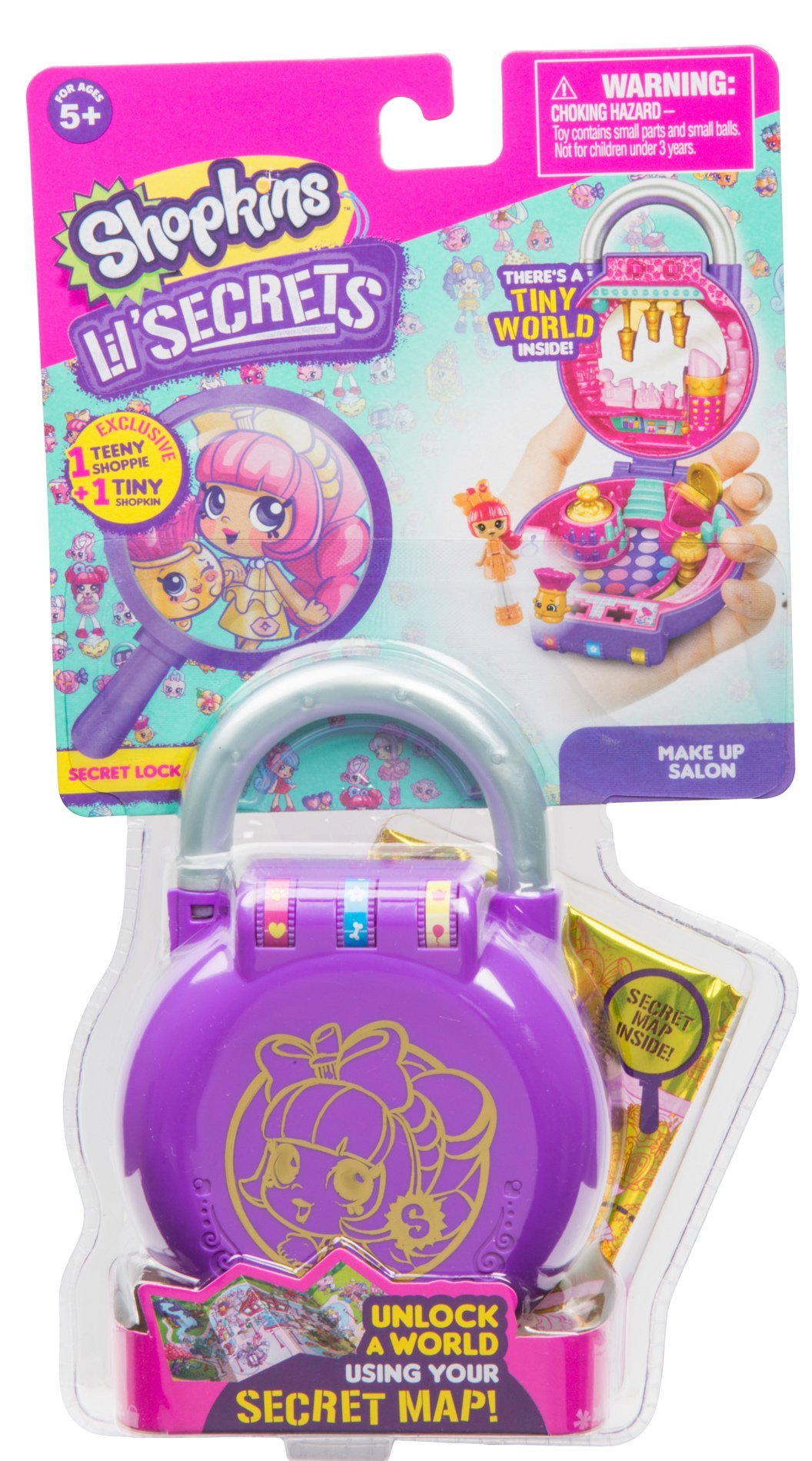 Shopkins Lil' Secrets is the world of Shopville that is small enough to fit in the palm of your hand. Collect all the Shoppies' and Shopkins' favorite shops from Shopville like Peppa-Mint's So Sweet Candy Shop, Lippy Lulu's Make Up Salon, and more! Unlock your Secret Lock by cracking the code, using the map of Shopville (included). Once unlocked, you may find an ultra rare, special finish playset! What's In the Box 1 x Secret Lock 1 x Teeny Shoppie 1 x Tiny Shopkin 1 x Secret Map