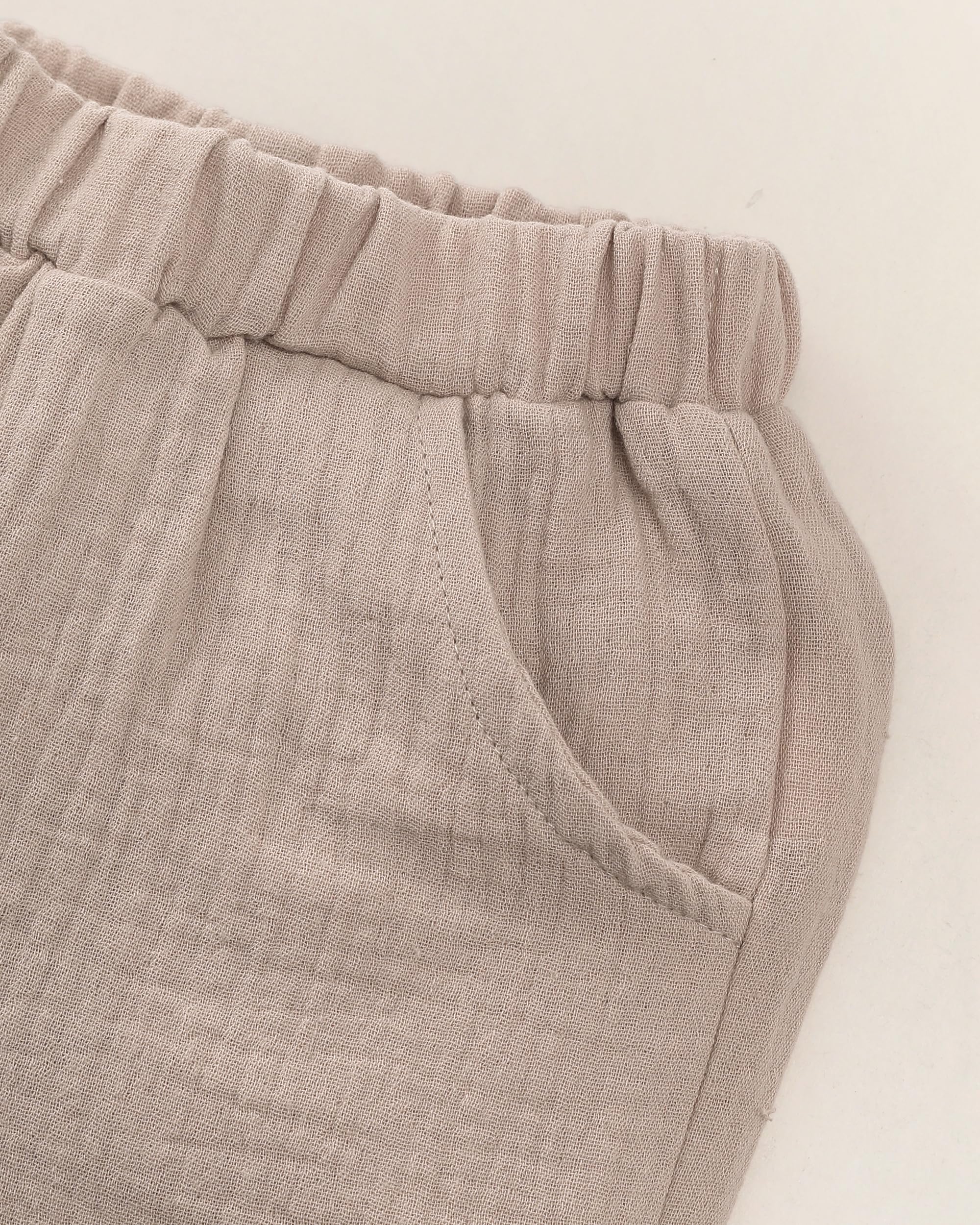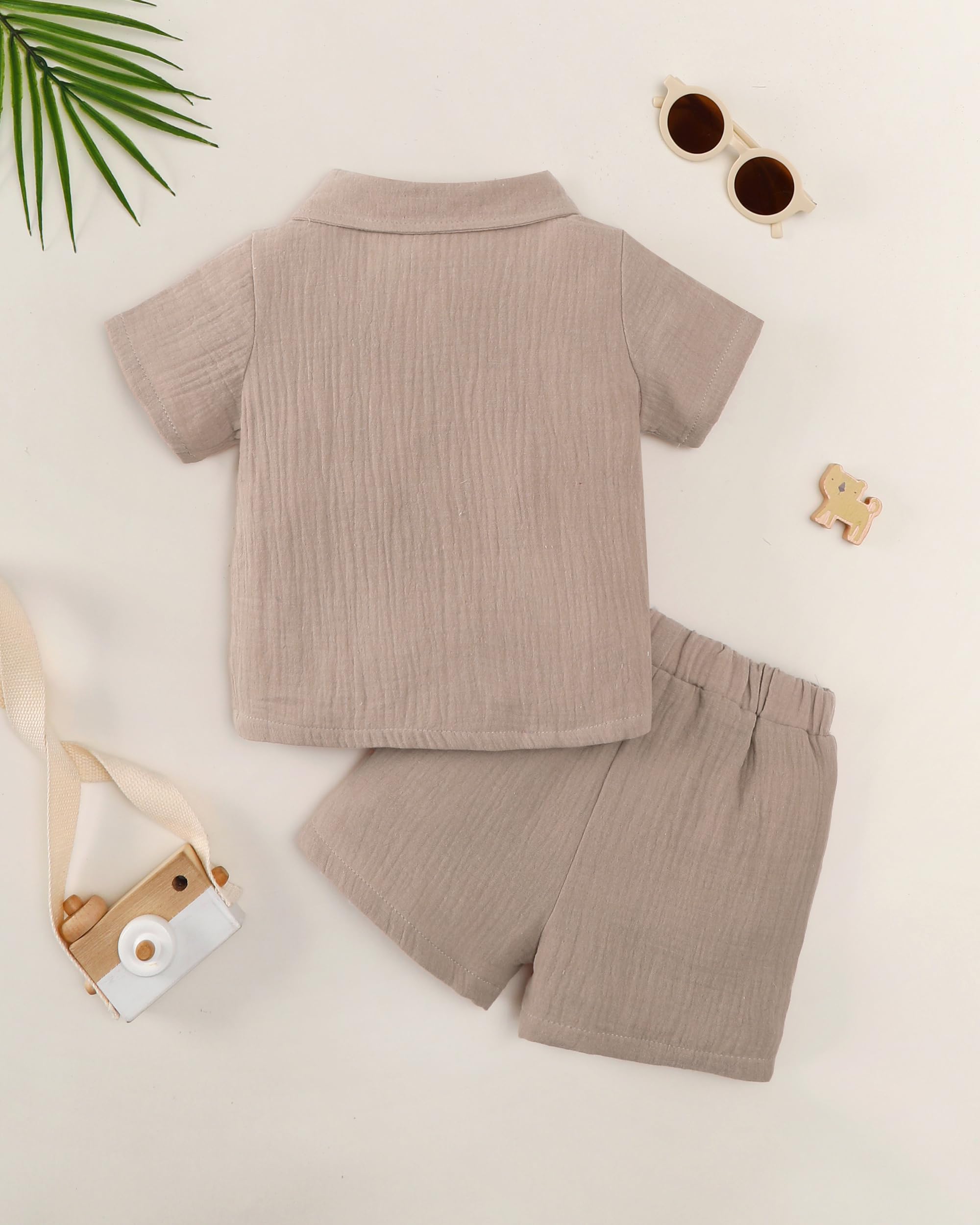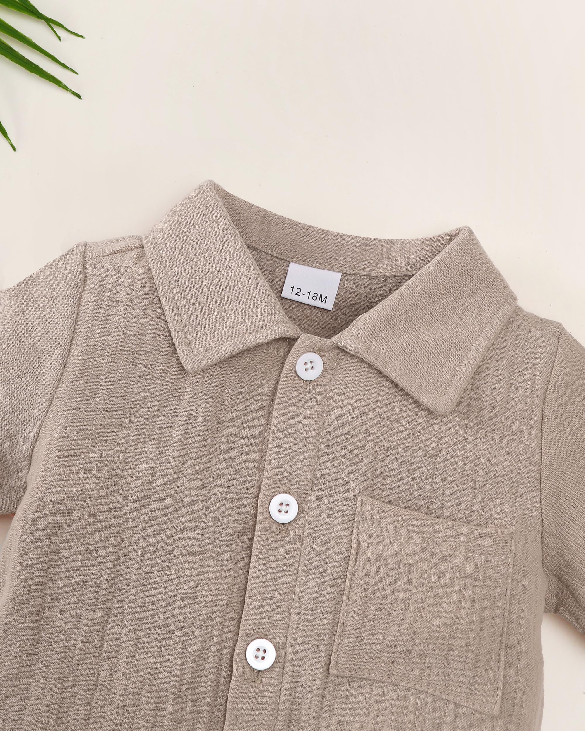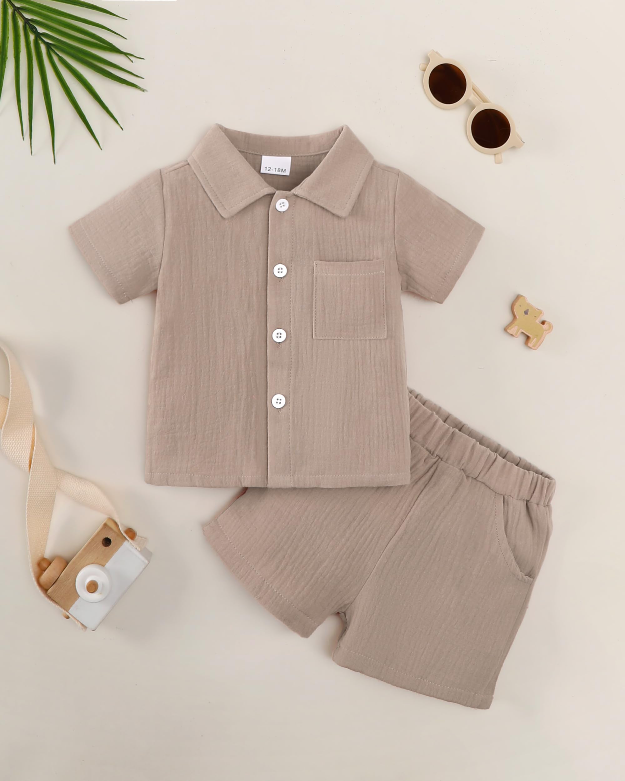 Minimalist Solid Design: Features a clean solid light khaki color with a white collar contrast and front pocket, offering a fresh, timeless summer style for little boys.