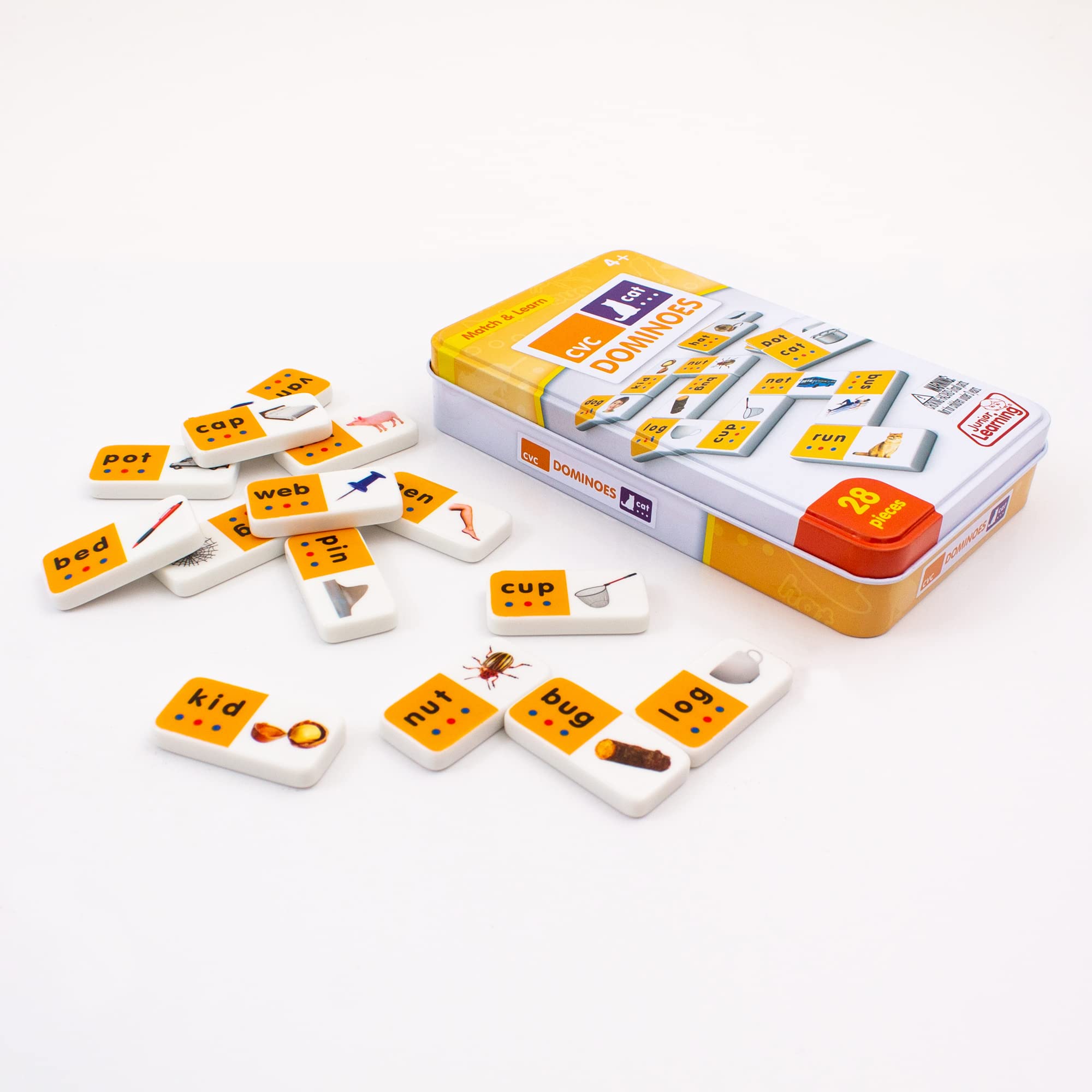 CVC dominoes include a 28 piece set on thick plastic dominoes. Dominoes come in a collectors tin for storage. Children will love the feel of real dominoes as they complete the consonant vowel consonant game.