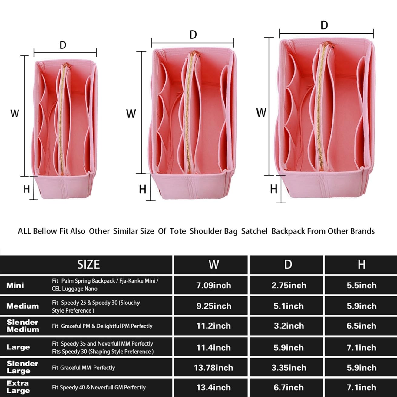 💗SIZE OF BAG ORGANIZER: Mini Purse Organizer: 7.09(W)*5.5(H)*2.75(D) inch Fits Alam BB and Fja-Kanke Mini ;onthego Pm and Montsouris BB. Small Purse Organizer: 8.66(W)*5.3(H)*4.5(D) inch Fits MJ Small Tote, Speedy 25, LC op Handle S and Book Tote New Small. Medium Purse Organizer:9.25(W)*5.9(H)*5.1(D)inch Fits 30 (Slouchy Style Preference). Slender Medium Purse Organizer: 11.2(W)*6.5(H)*3.2(D)inch Fits Graceful PM and Delightful PM