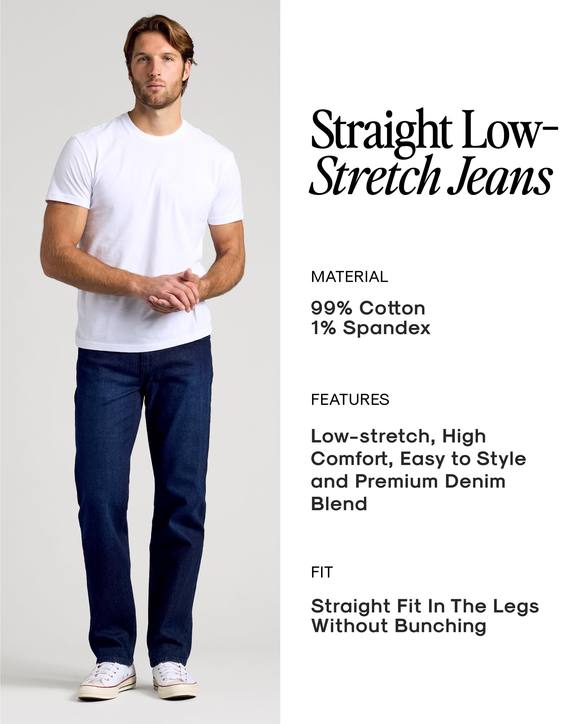 ALL-DAY COMFORT STRETCH: Our high stretch jeans are made with 4-way stretch fabric (54% Rayon, 24% Cotton, 20% Polyester, 2% Spandex), while the low stretch jeans have a heavier fabric (99% Cotton, 1% Spandex) with a hint of stretch.