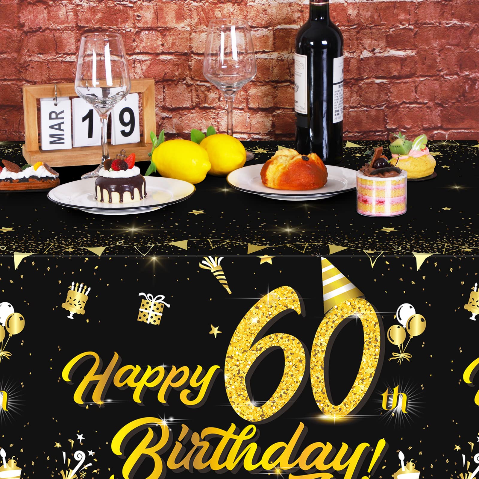 Special design: our plastic party tablecloths are designed with gradient gold words "Happy 60th Birthday", which are evenly printed on the black background of two sides, beautiful and magnificent; with rich elements like cute gift box, Christmas hat, cake, candle and fireworks, these tablecloths will add elegant festive atmosphere