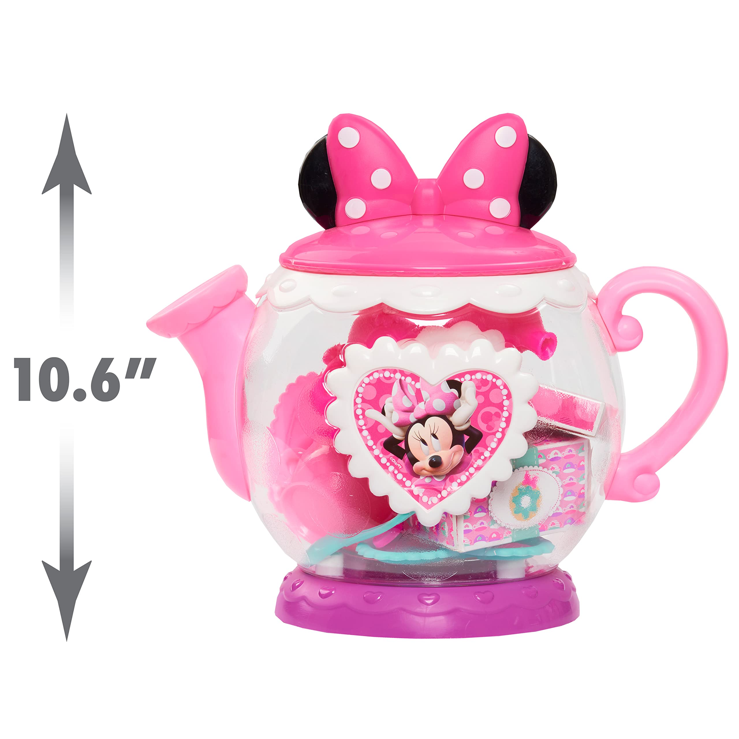 Roleplay with Minnie Mouse: This 10.6-inch-tall play teapot features a bold pink polka-dot bow and ears, a heart-shaped portrait of Disney’s Minnie Mouse, a pink base, and everything needed to host a tea party in style.