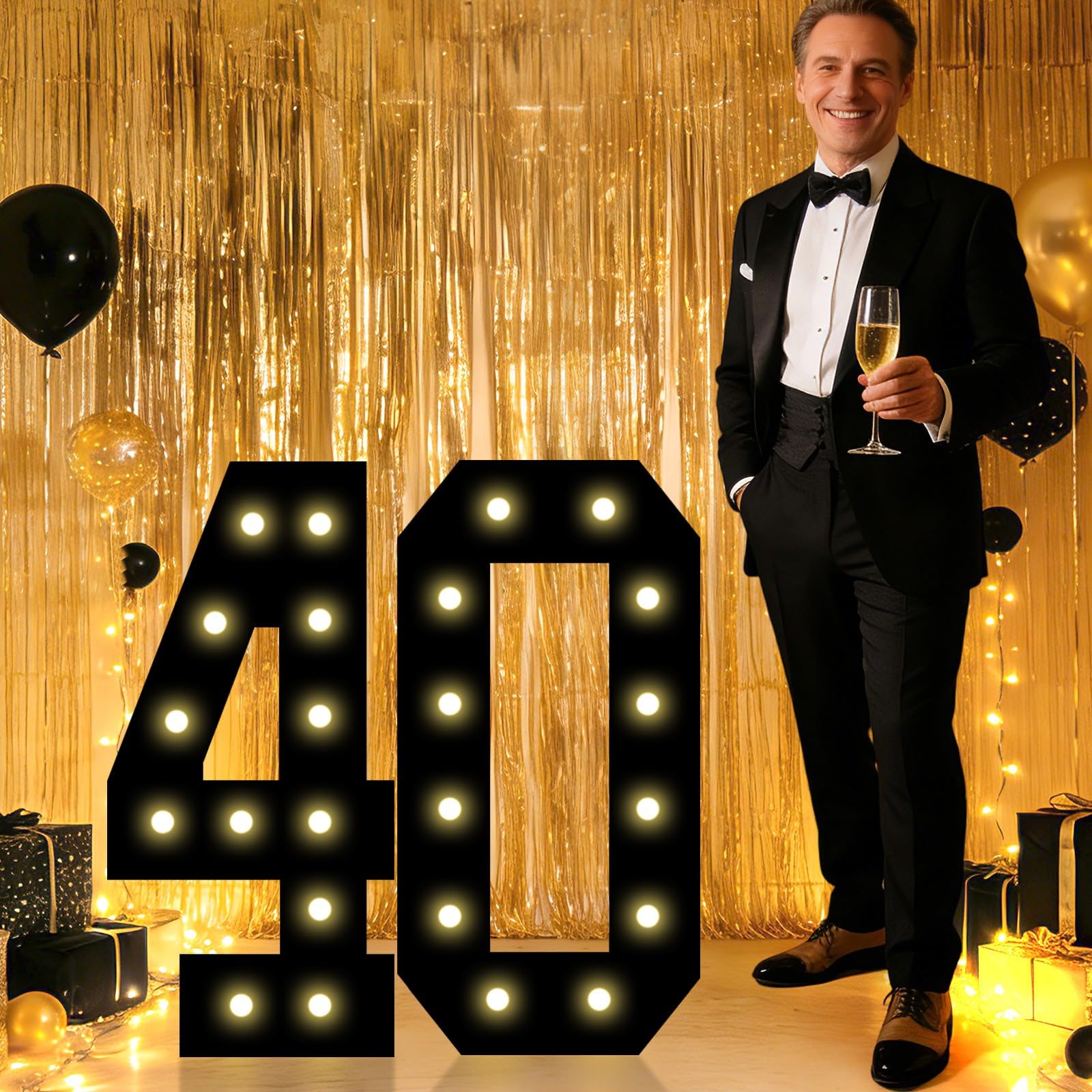 Giant Black 2.4 Feet Marquee Numbers with LED Lights: Mosaic numbers designed with warm white LED string lights. Giant LED numbers can be powered by 3 AA batteries (Not Included), convenient for all kinds of party decoration