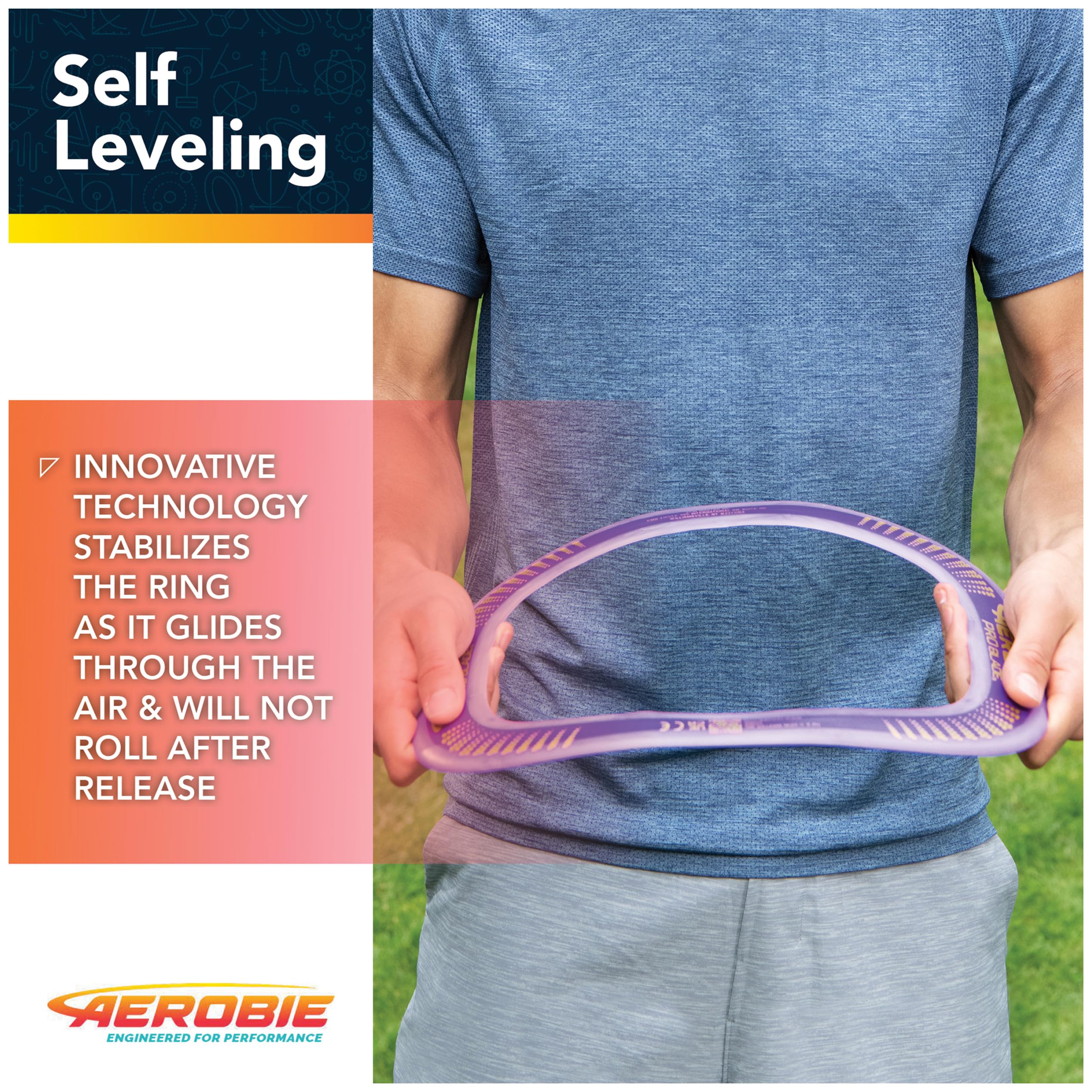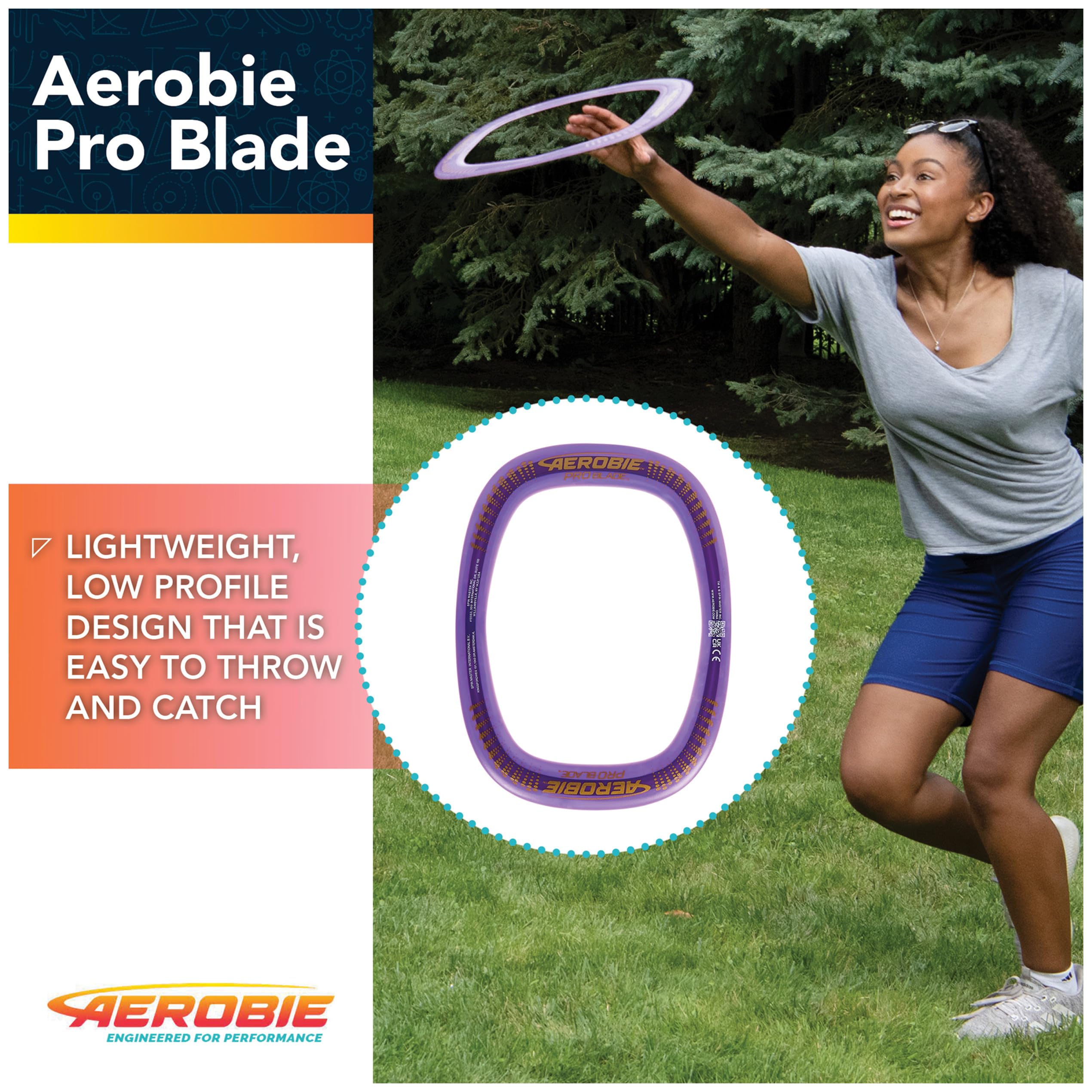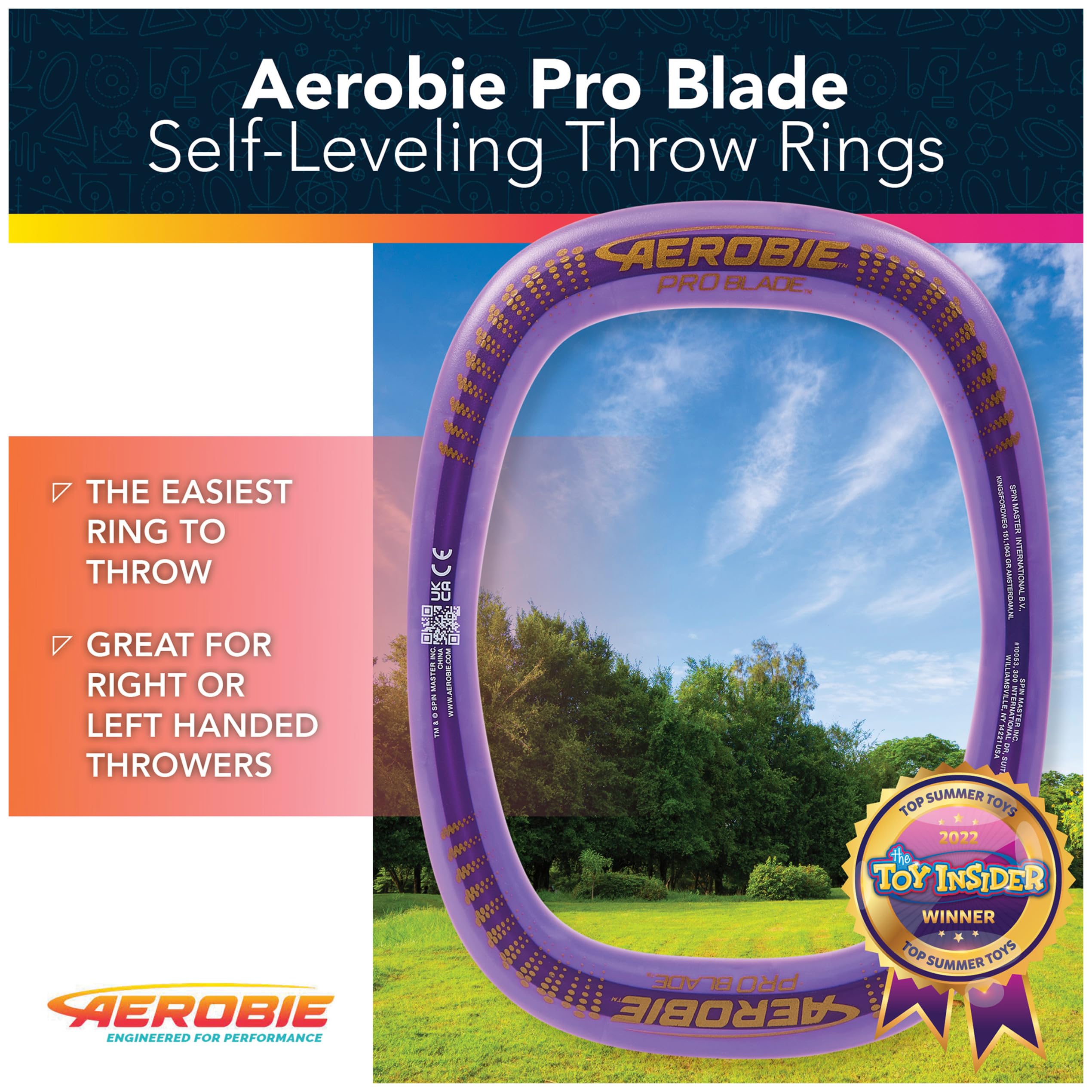 Get ready, get set, and throw for an incredible flying performance with the Aerobie Pro Blade Self Leveling Throw Ring. Made for both right and left-handed throwers, these are the easiest rings to throw and catch with innovative technology that allows the ring to self level as it rotates in the air. They are the perfect throwing toy for exhilarating flying disc games such as ultimate frisbee, disc golf, or basic outdoor freestyle play. Additionally, Pro Blades are easier and more comfortable to catch because of their easy to hold ring-like shape. The throw ring's open center provides players with the ability to experiment customizing their throwing and catching styles and create their own fun outdoor games to play with family and friends. This Pro Blade comes in the color purple, measures 14" x 10.5", and is recommended for ages five and up.