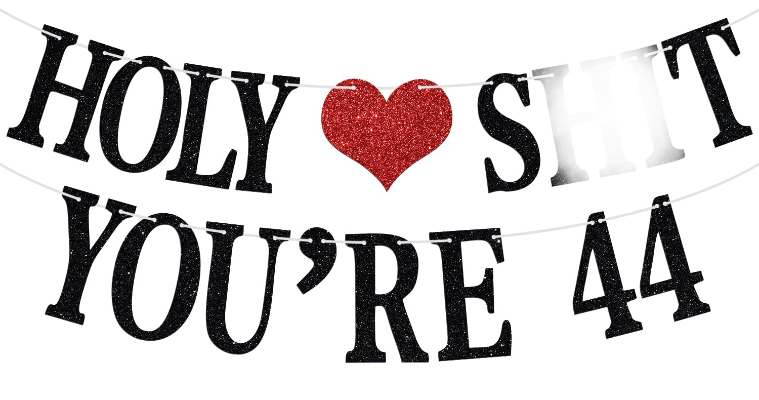 Celebrate that special 44th birthday or anniversary with this eye-catching "Holy You're 44" banner! Unique Design: Perfect for men women 44th Birthday Party. Crafted with a playful, irreverent design featuring bold black text and a glittering red heart, this festive bunting sign adds a touch of humor and personality to any party decor. Premium quality: Banners are made of premium cardpaper.They are rigid and reusable. At over 5 feet long, it's sure to grab attention and spark smiles from guests of all ages. Easy Assembly: You'll need to spend a little time threading the rope and card, but it's super easy. Your most intimate service: If our products are damaged or cannot satisfy you, please contact us in time, we will do our best to solve the problem for you! Liven up your 44-year celebration with this unique, one-of-a-kind decoration!
