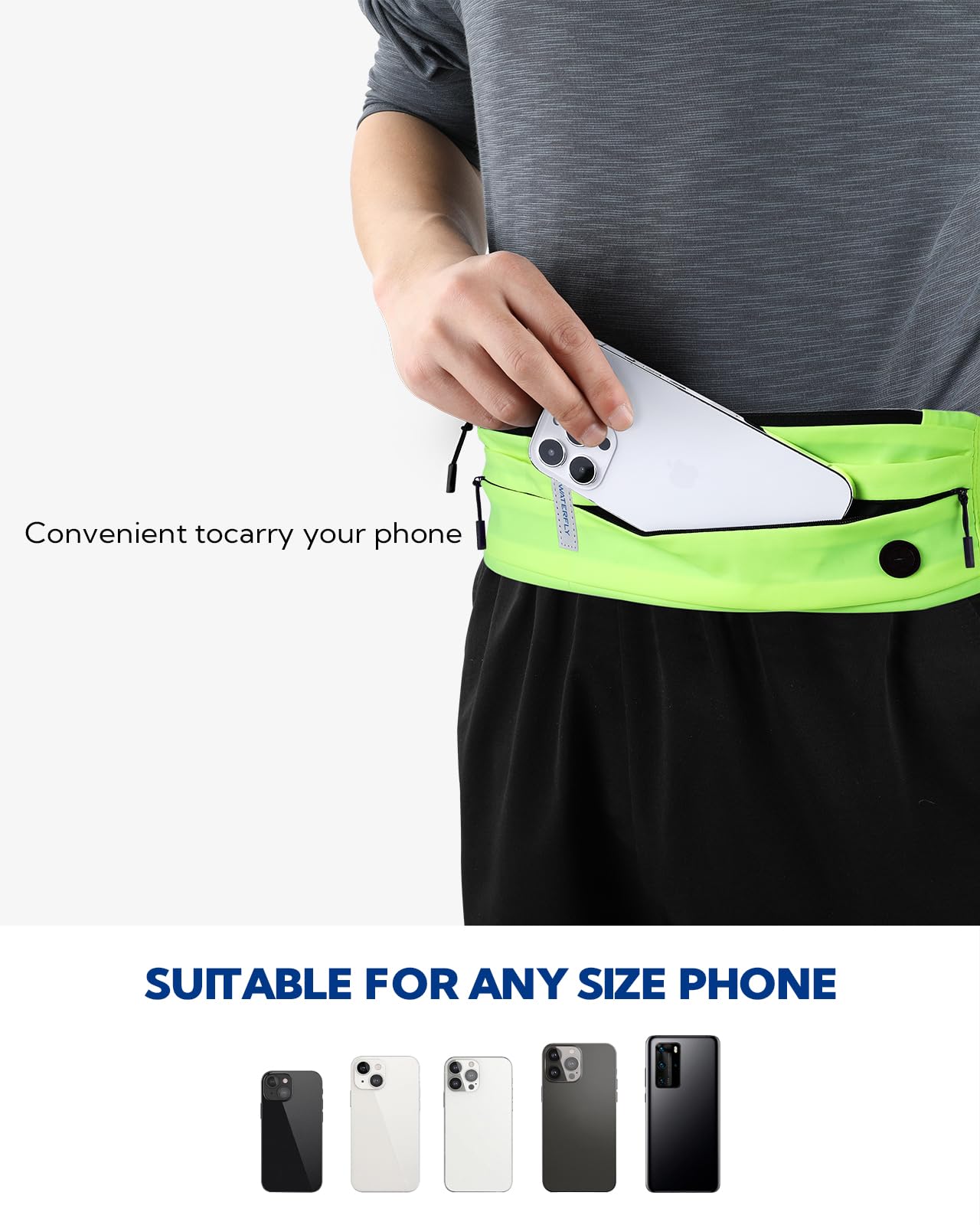 Adjust & Go: One-size fits waists 27"-48". Secure clip + stretch strap stays put during runs. Zero bounce, all comfort—mile after mile.