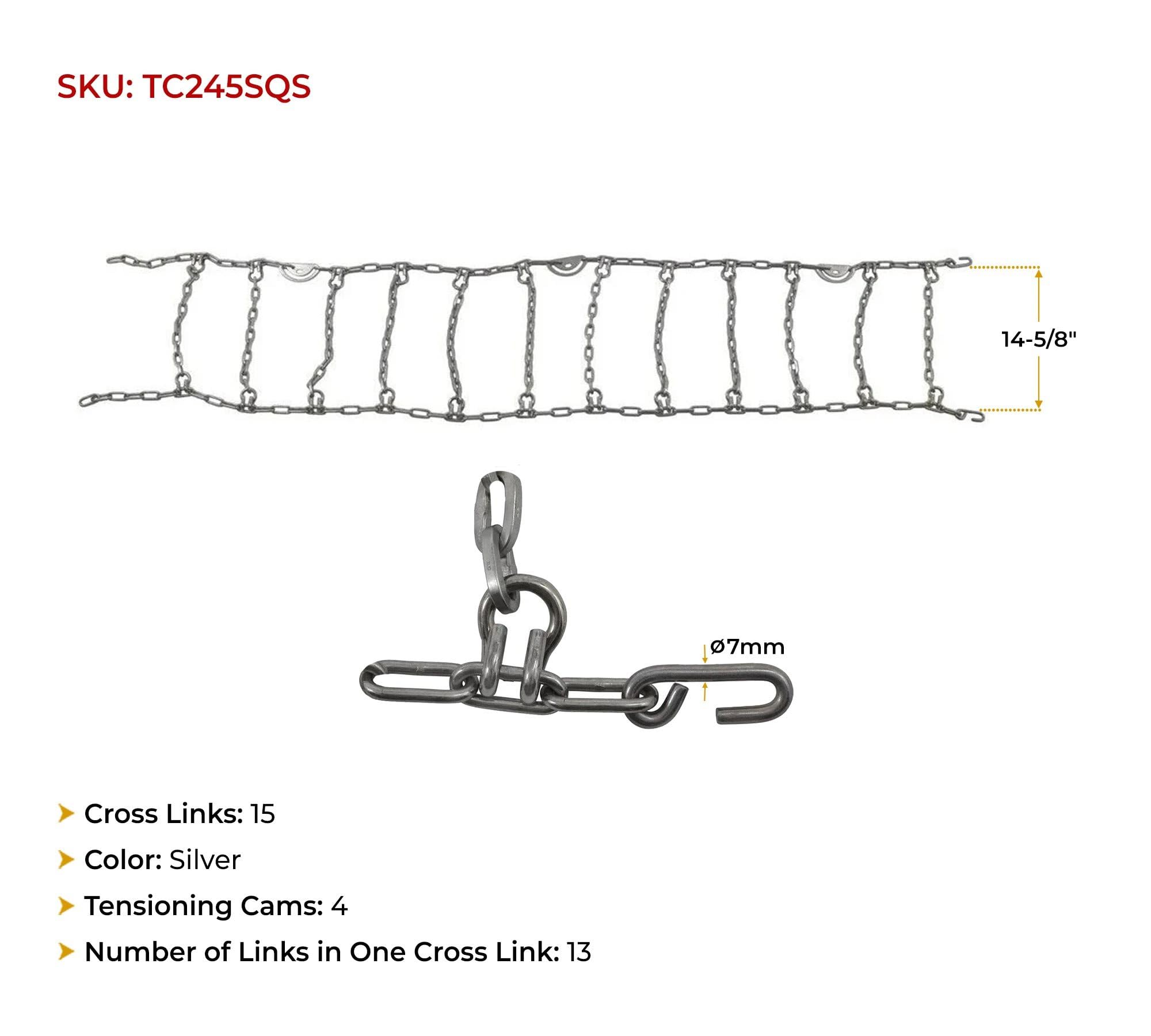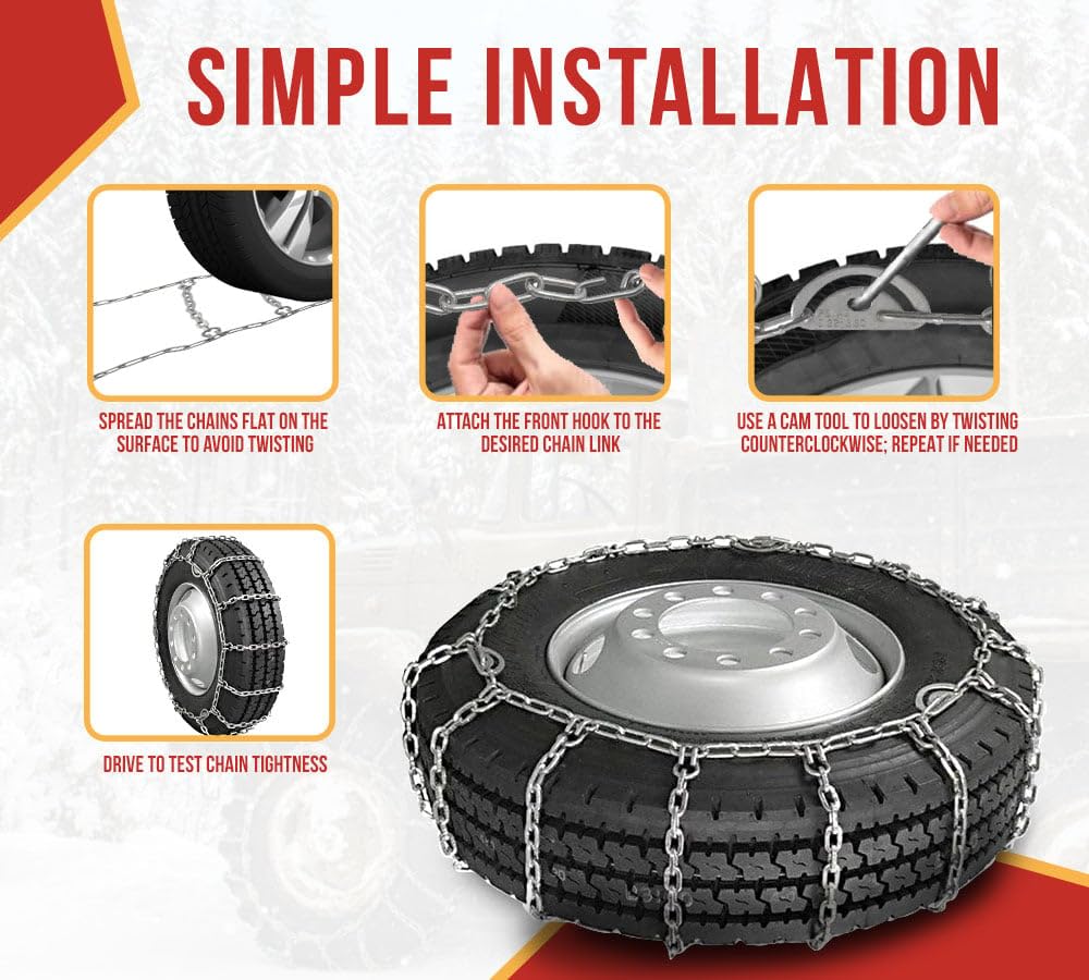 Want to be prepared before the winter season hits hard? Here’s Mytee Products’ Single Square Link Snow Tire Chains w/ Cam Fits 24.5" Rim Dia. Tires (Set of 2). This snow chain will provide a smoother ride, firm grip, and strong traction on snowy, icy, muddy surfaces. It will prevent tires from cuts, damage, and jarring. The design is ideal for SUVs and passenger vehicles of compatible sizes can also utilize these tire chains. Want to know how this product can save you from accidents and unforeseen situations? Scroll down below:- Durable Construction: We have engineered these chains from steel, following its durability and strength in different environments. It will ensure resistance to wear, maintain the shape of the material, and reduce the likelihood of stretching or deformation over time. It has a breaking strength of up to 27KN. Square Links: The uniformed links are for better traction and improved efficiency. It’s in ladder style for a smoother ride on icy and snowy surfaces. The square shape will seamlessly work on hard-packed ice, biting into the surface more effectively. It protects the tire from cuts and damages, ensuring a firm grip on the road. It has 5-link spacing for better traction and improved chain tension. Cam Tensioner: The square link tire chain features a cam tightening system for easy and secure tensioning. It will enable you to adjust the chain and ensure a snug fit around the tire, keeping it intact and preventing the chain from loosening during movement. You have to do it manually after completing the installation. Compatibility: These truck snow chains are designed to provide compatibility with a 24.5" rim diameter and 11" wide tire. It will seamlessly fit to vehicle sizes of 285/75R24.5 and 11R24.5. These are commonly used on SUVs, low-duty trucks, compact utility vehicles, and smaller trucks. Safety Tool: Our winter chains are suitable for off-road and icy terrains where your truck will need additional traction. It will prevent slipping or slacking during frequent stops. Truckers/drivers can carry these chains and secure them in tool boxes. Simple Installation: The process is simple, and it will not take much time. We are providing a single set of 2 chains for two tires (either front or rear). Follow the steps below:- Spread the chains flat on the surface to avoid twisting. Ensure to keep the cams on the accessible side for adjustments. Take the chain and drape them over the tire. Place it nice and even. For the first connection, attach the hook (behind the tires) to the other side of the desired link for the perfect fit. Attach the front hook to the desired chain link (the farthest one you feel is the best). Adjust a little slack with cams—utilize a cam tool and twist in the anti-clockwise direction. If needed, follow the process with other cams. Add a rubber spider bungee to keep your chain from slipping or coming loose. Usage Guidelines: Follow the specified speed limit of 30 mph for safety. Do not use on bare pavement to avoid damage to tires and the road. Clean and dry the chains to prevent rust. Also, store it in a dry place. It’s suggested that the chains be installed before driving. As it might get difficult amid heavy and deep snowy areas.