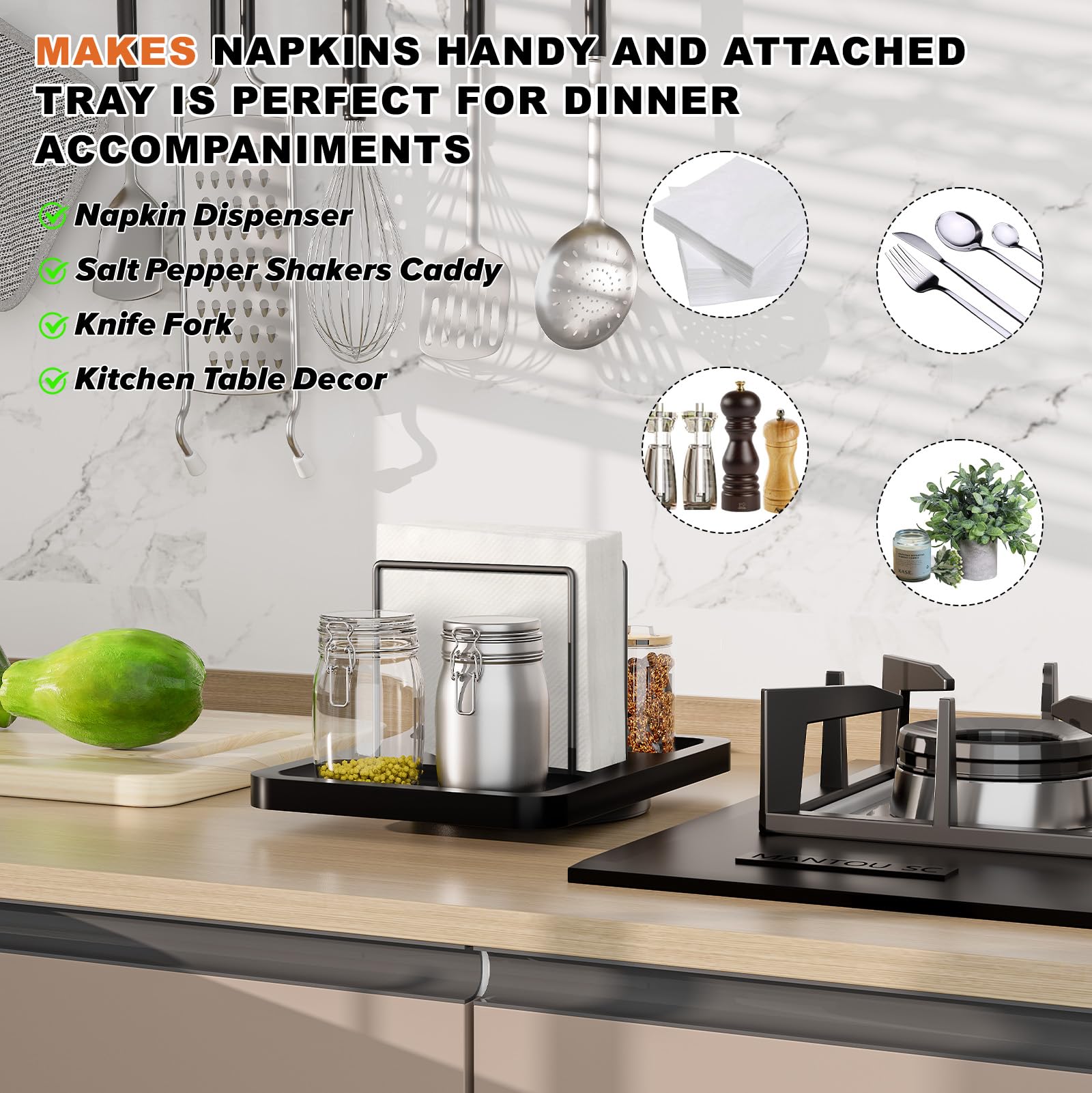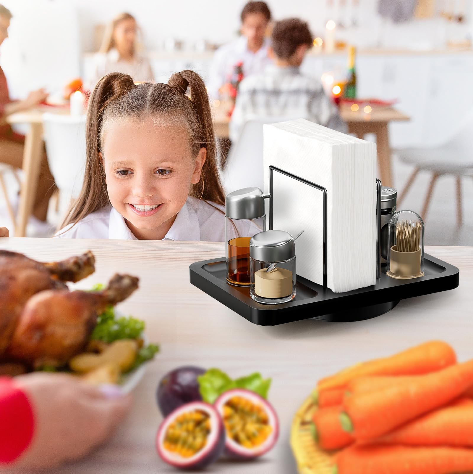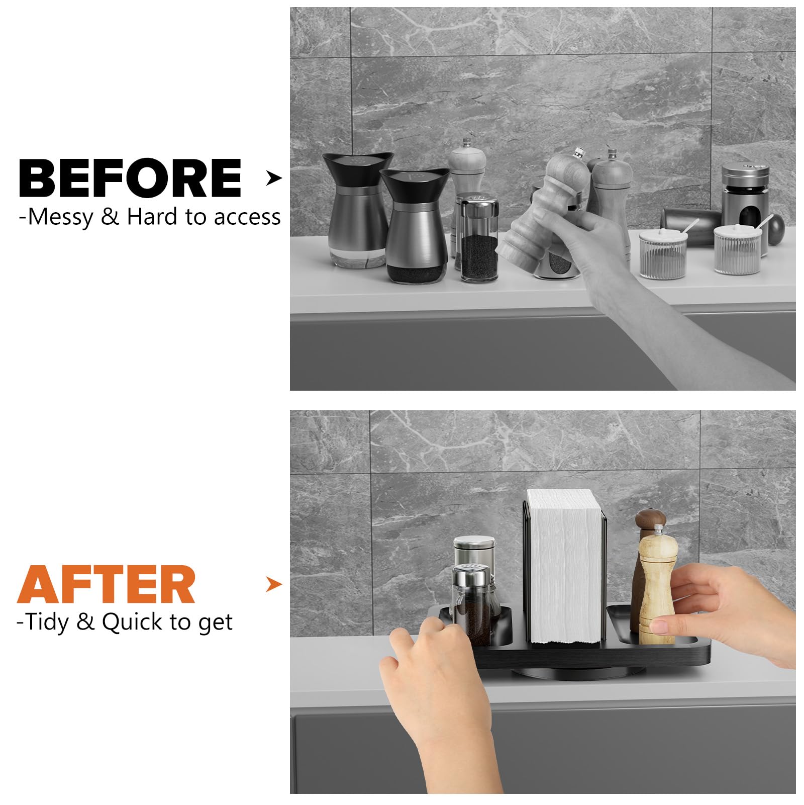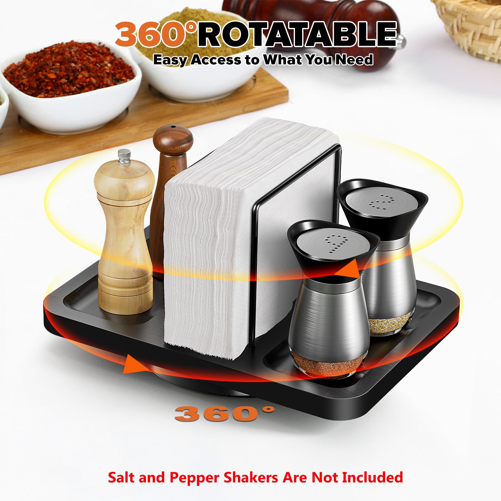 Smooth 360° Spinningļ¼Napkin Holder rotates in a circle for easy access to napkins, condiments, spices, seasonings. No more fumbling around; everything you need is just a spin away