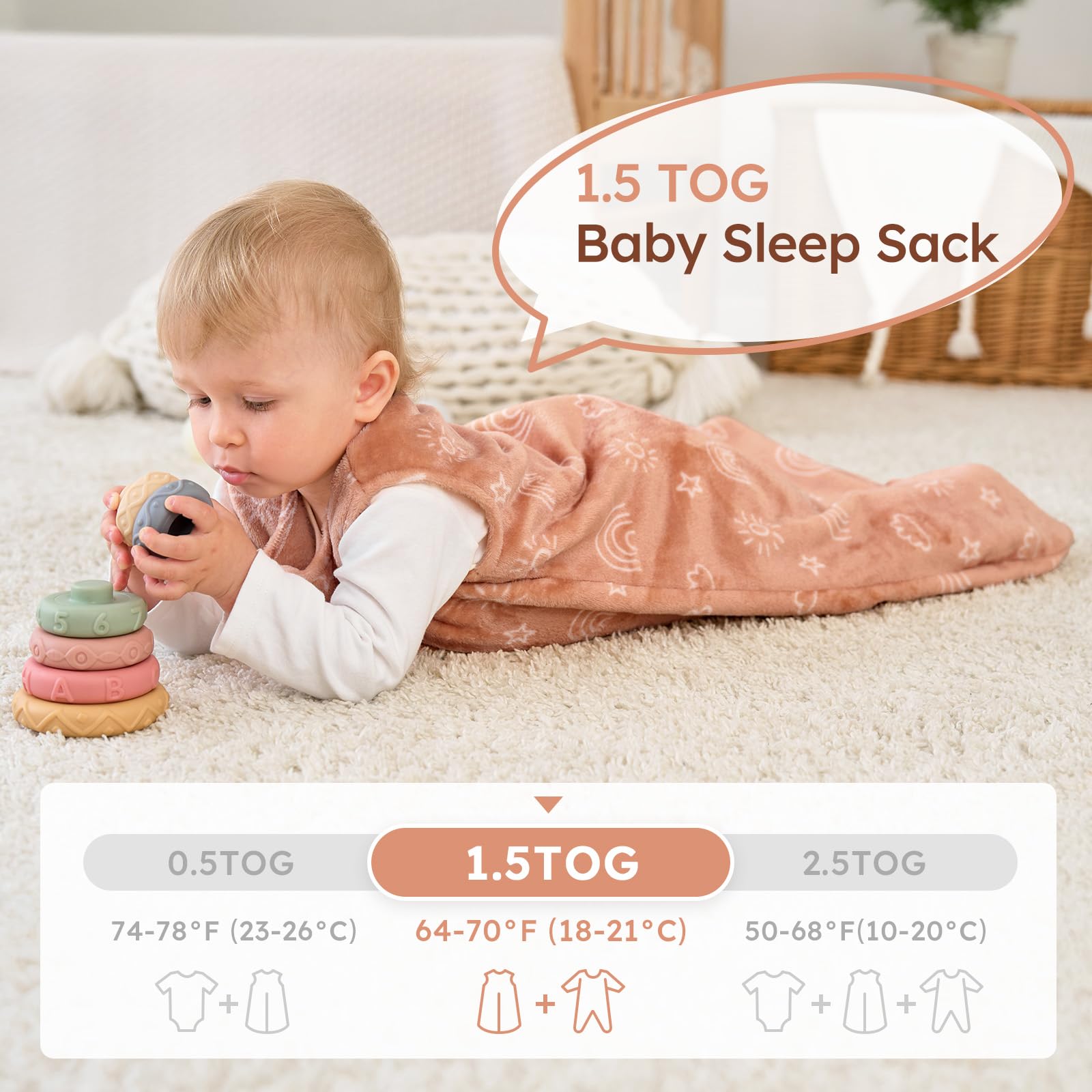 Soft and Warm - Made of 100% polyester, super soft, smooth and lightweight, creating warm and cozy embrace for baby. Fleece sleep sack 1.5 Tog is suiable for moderate temperatures from 69 to 73°F as an ideal option for autumn, early winter and spring or taking a nap in air-conditioned rooms during the summer.