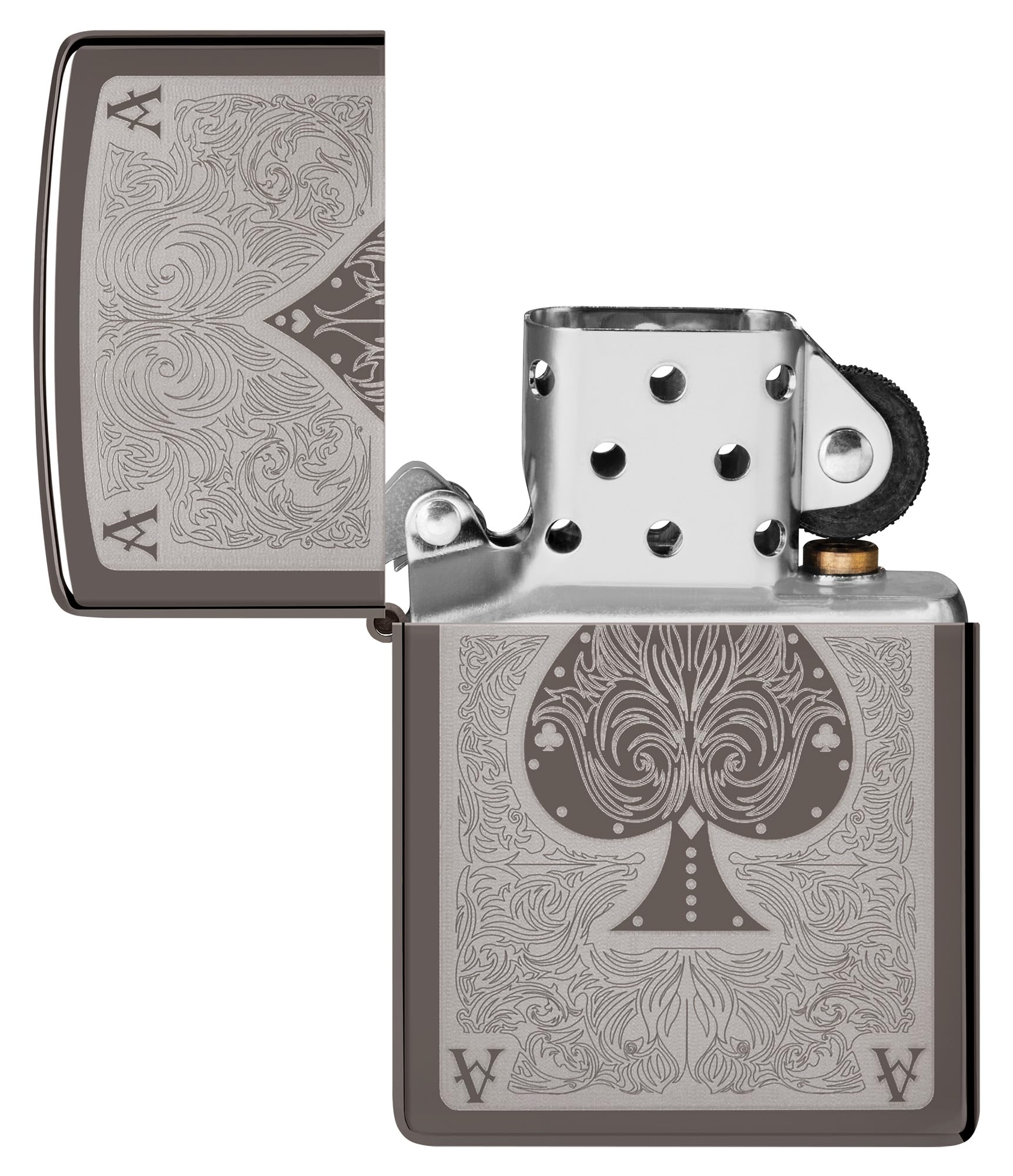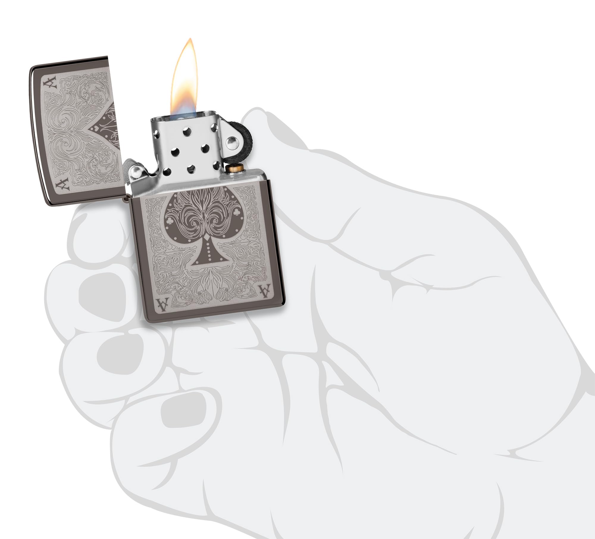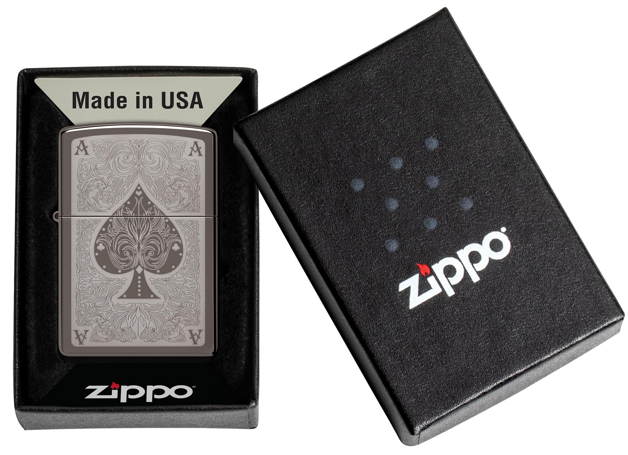 Description Get lucky with one of these Zippo windproof lighters. The ace lighters are created using Zippo's various imprint methods; color image, fusion, stamping, and engraving. These unique designs have been placed on five different lighter cases; High Polish Chrome, High Polish Brass, Black Matte, Black Ice, and Gray Dusk. Each lighter has a bottom stamp signifying the year it was made, is refillable, and is backed by Zippo’s famous lifetime guarantee. All windproof lighters are American made in our Bradford, PA factory and come packaged in a gift box.