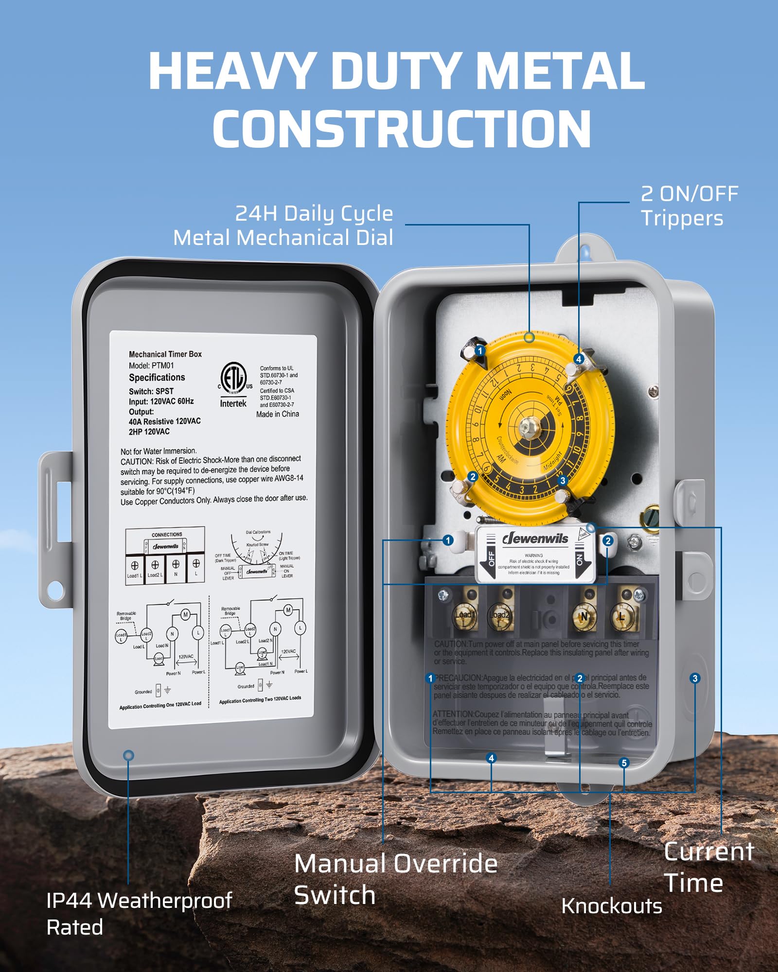 [Automatic 24-Hour Control] Equipped with a mechanical dial timer, this heavy duty switch supports 2 on/off programs within a 24-hour cycle; once set, it automatically repeats daily—ideal for controlling water heaters, AC units, pumps, signs, lights, and fans