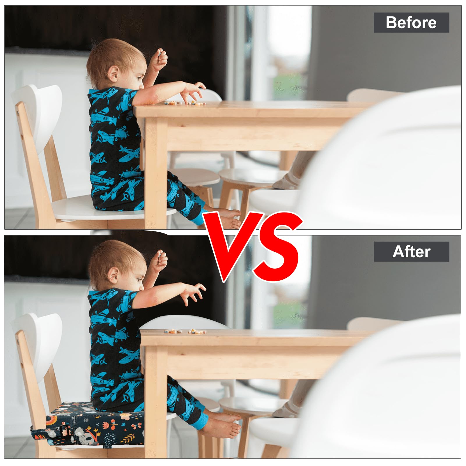 【WIDELY APPLICATION】Toddler booster seat can be used not only when eating and painting at home, but also when going out for a picnic. The adjustable straps can be carried out like a backpack for easy carrying. Whether at home or traveling, it takes up very little space. Since the manufacturer updated the product packaging to a compressed packaging, the high chair booster seat will return to its original height within 24 hours of opening