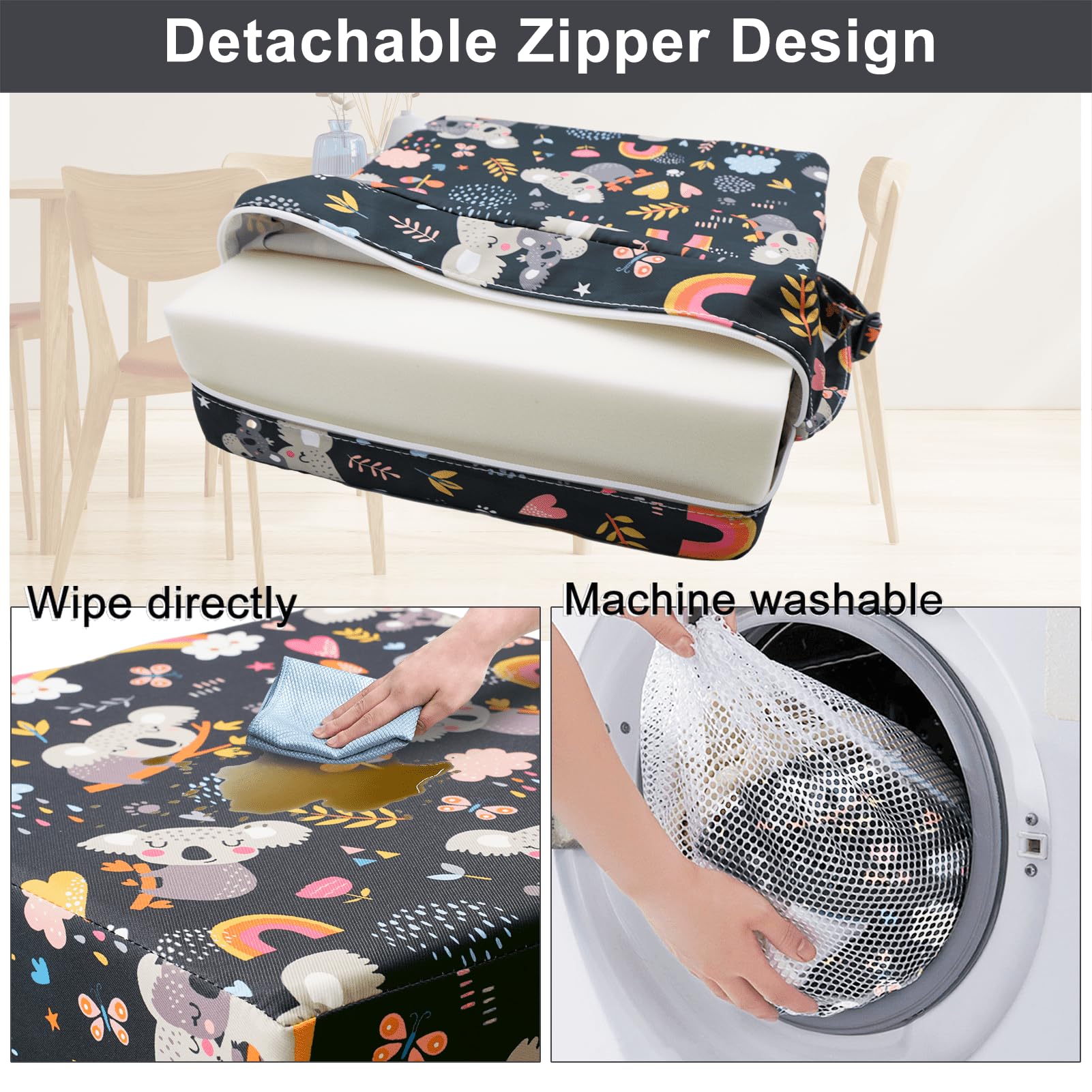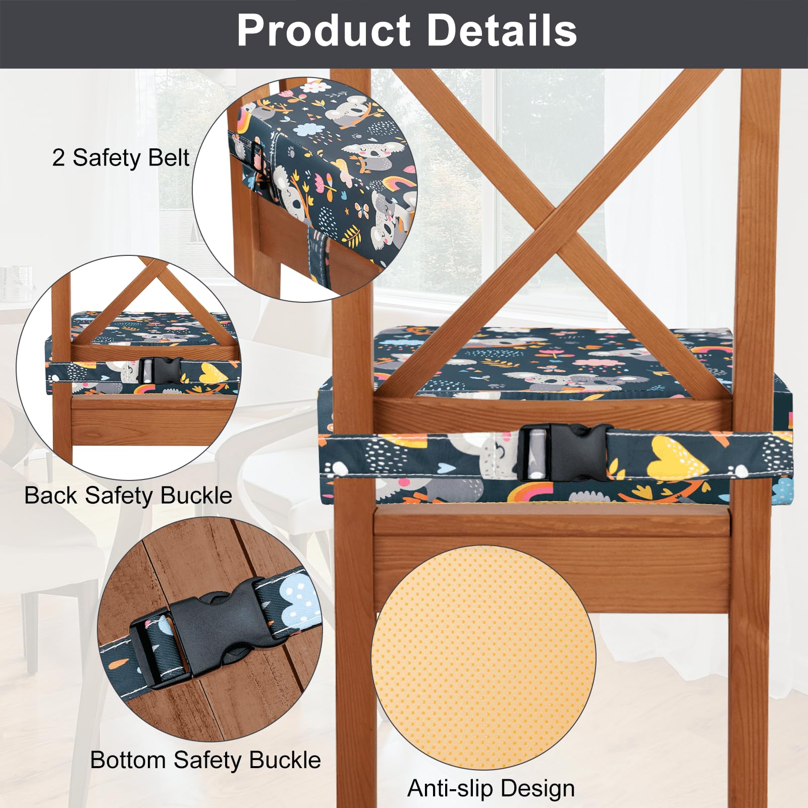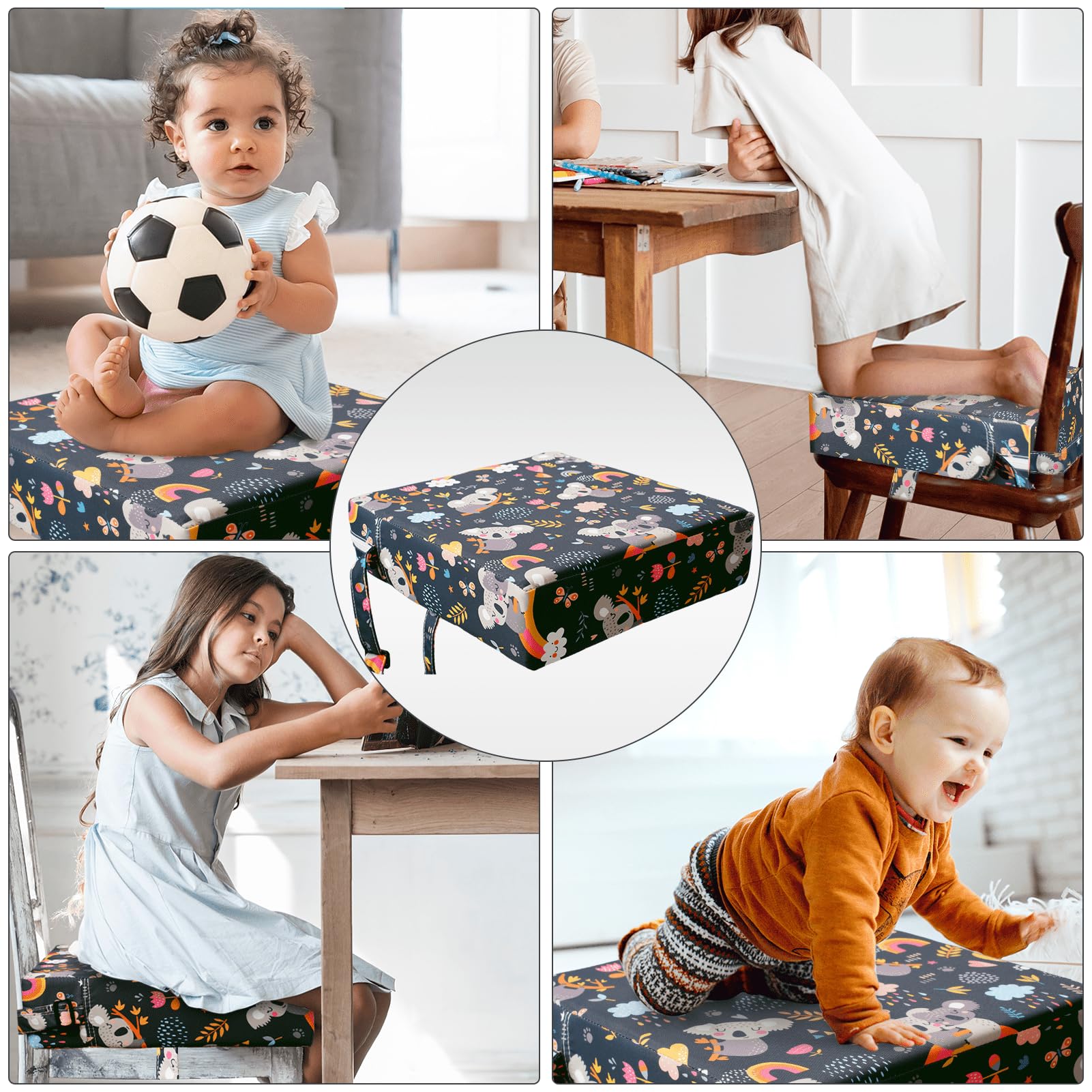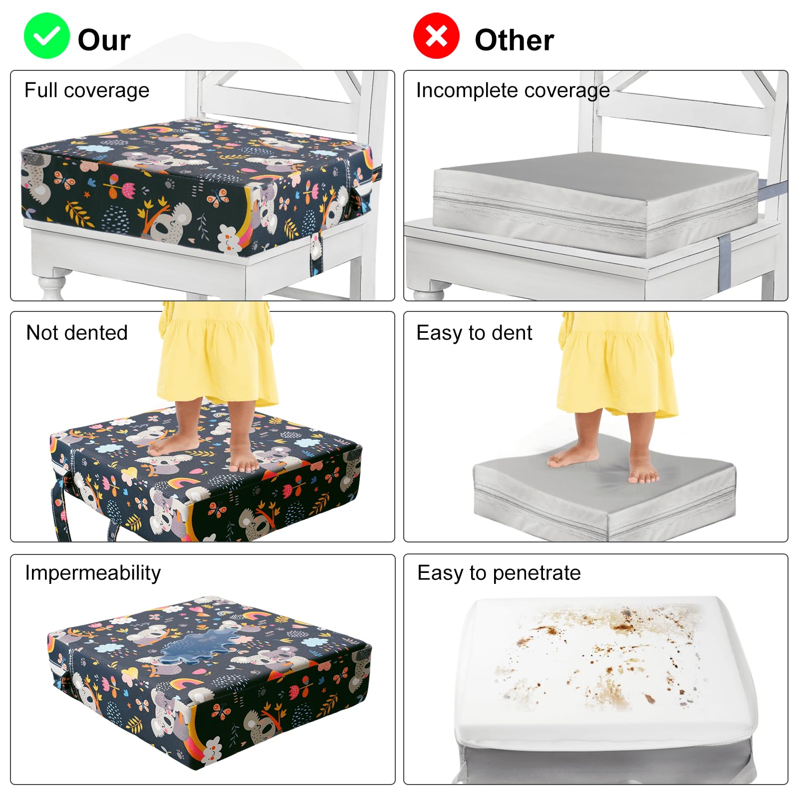 【IMPROVED DESIGN】Compared with other old models on the market, our toddler booster seat has thoughtfully increased the width on the seat cushion, covering the entire surface of the chair more comprehensively; Booster seat adopts a funny cartoon patterns--Colorful Koala on black cloth, which will meet Children's interests