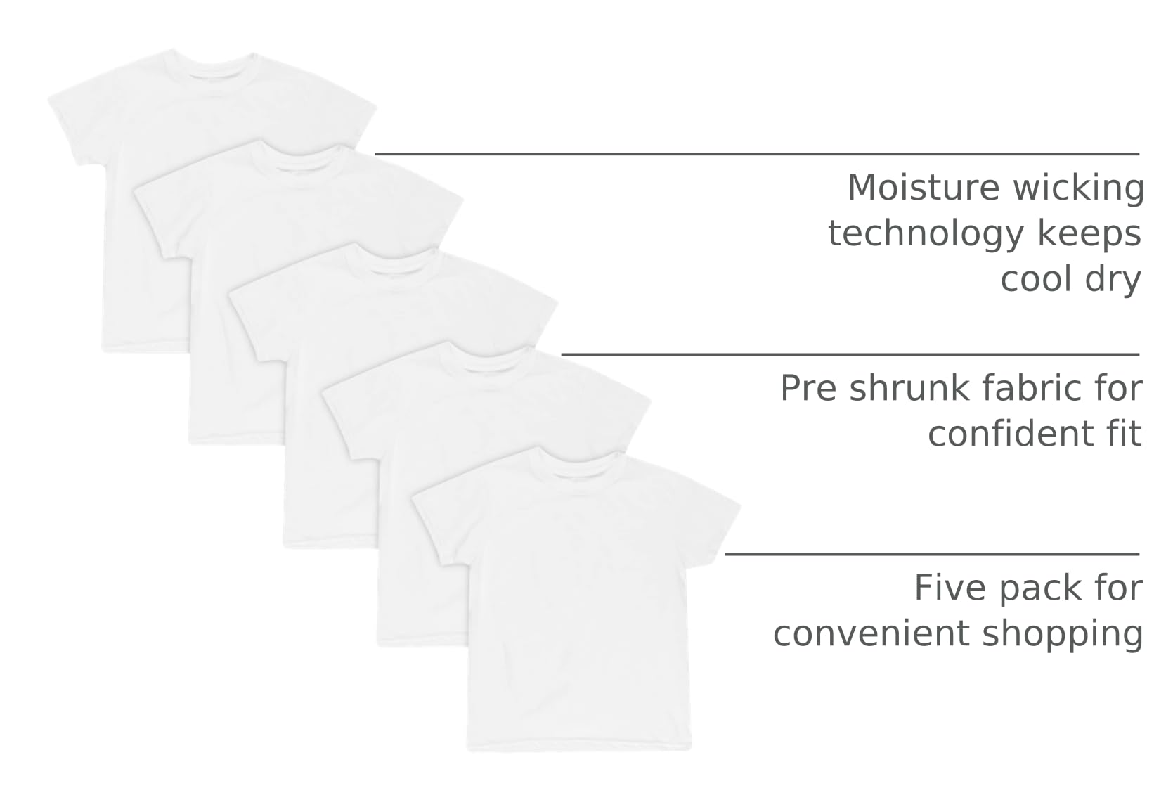 Description Hanesยฎ EcoSmartยฎ boys' undershirts are crafted from a lightweight 50/50 cotton polyester-blend fabric that features a portion of recycled fibers. The feel-good style of these white boys t-shirts offers moisture-wicking technology, keeping him cool and fresh no matter how hard he plays. Double-ply neckband is just one of the sturdy details in boys cotton shirts that are made to last. Even better, these boys' short sleeve shirts are preshrunk for a fit that stays true. This comfortable style is finished with a smooth Taglessยฎ interior for itch-free comfort. Hanesยฎ boys' undershirts come in a convenient 5-pack so you can stock up with ease.