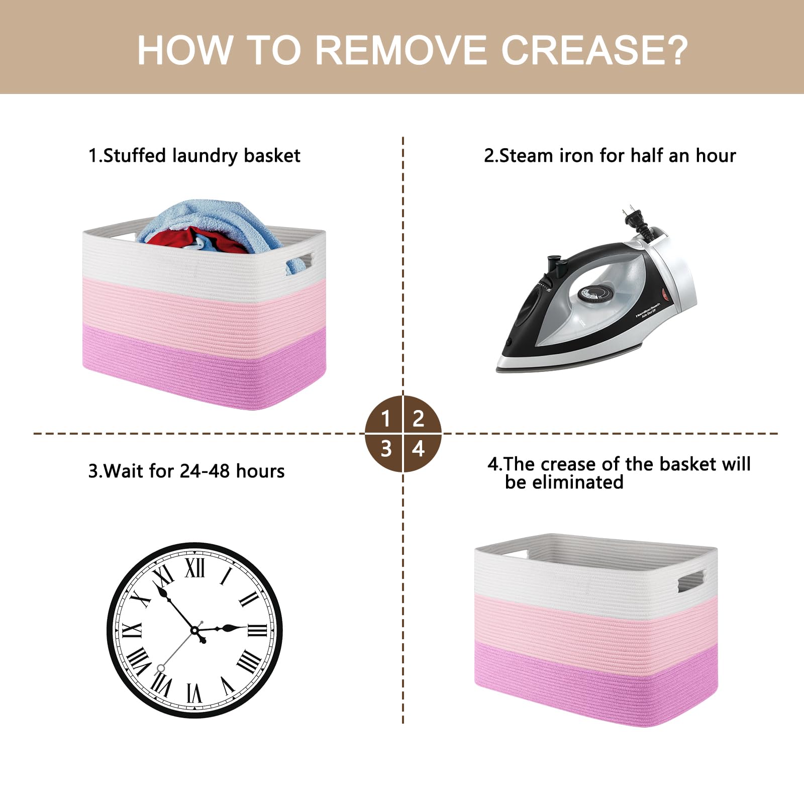 Washable Storage Basket: This large basket can be washed by hand or machine with gentle detergent. If machine washed, please put them into a laundry bag. NOTE: These cotton rope baskets are folded when shipping, but it will turn back to its elegant shape quickly if you fill it with some towels or clothing, and iron is great idea to remove the creases