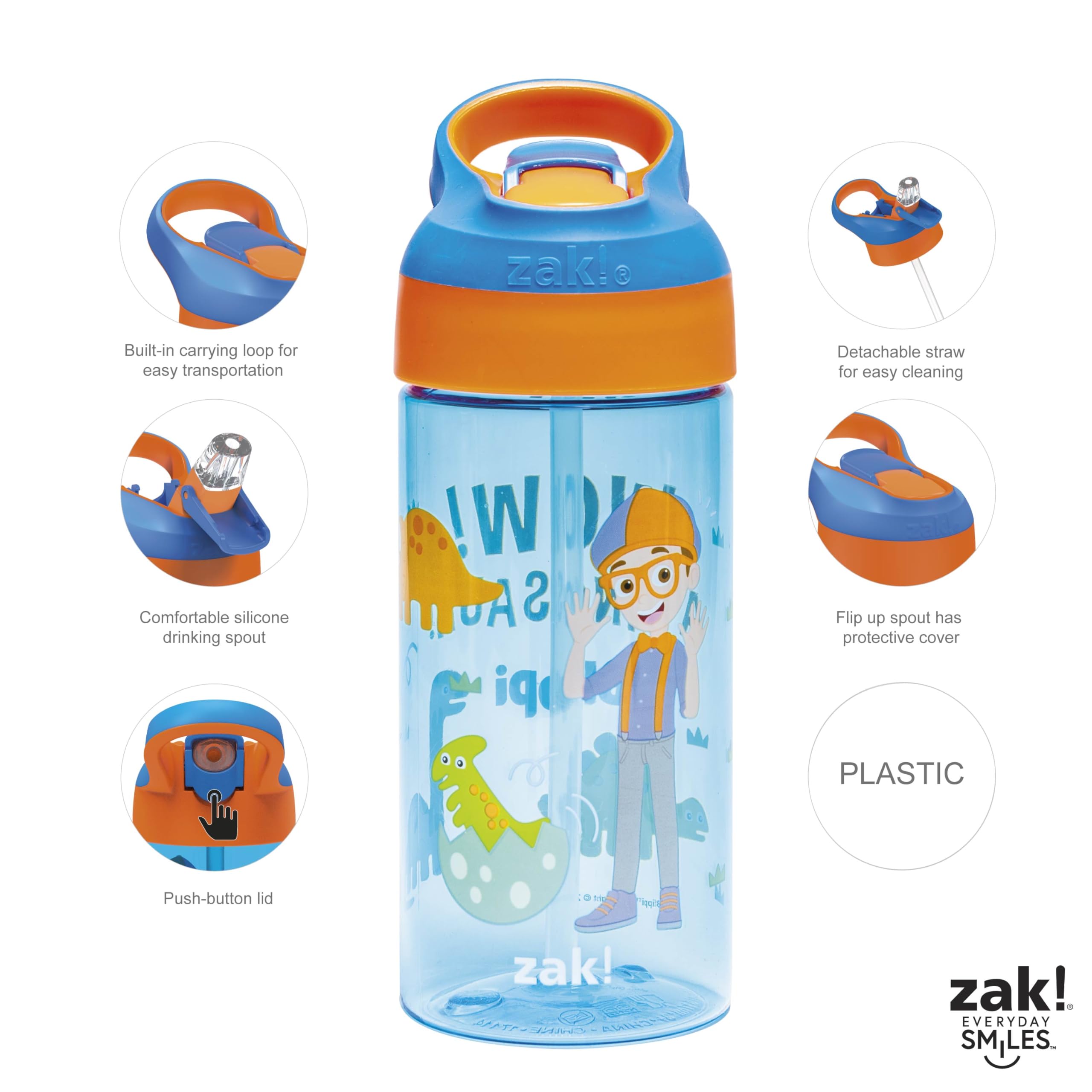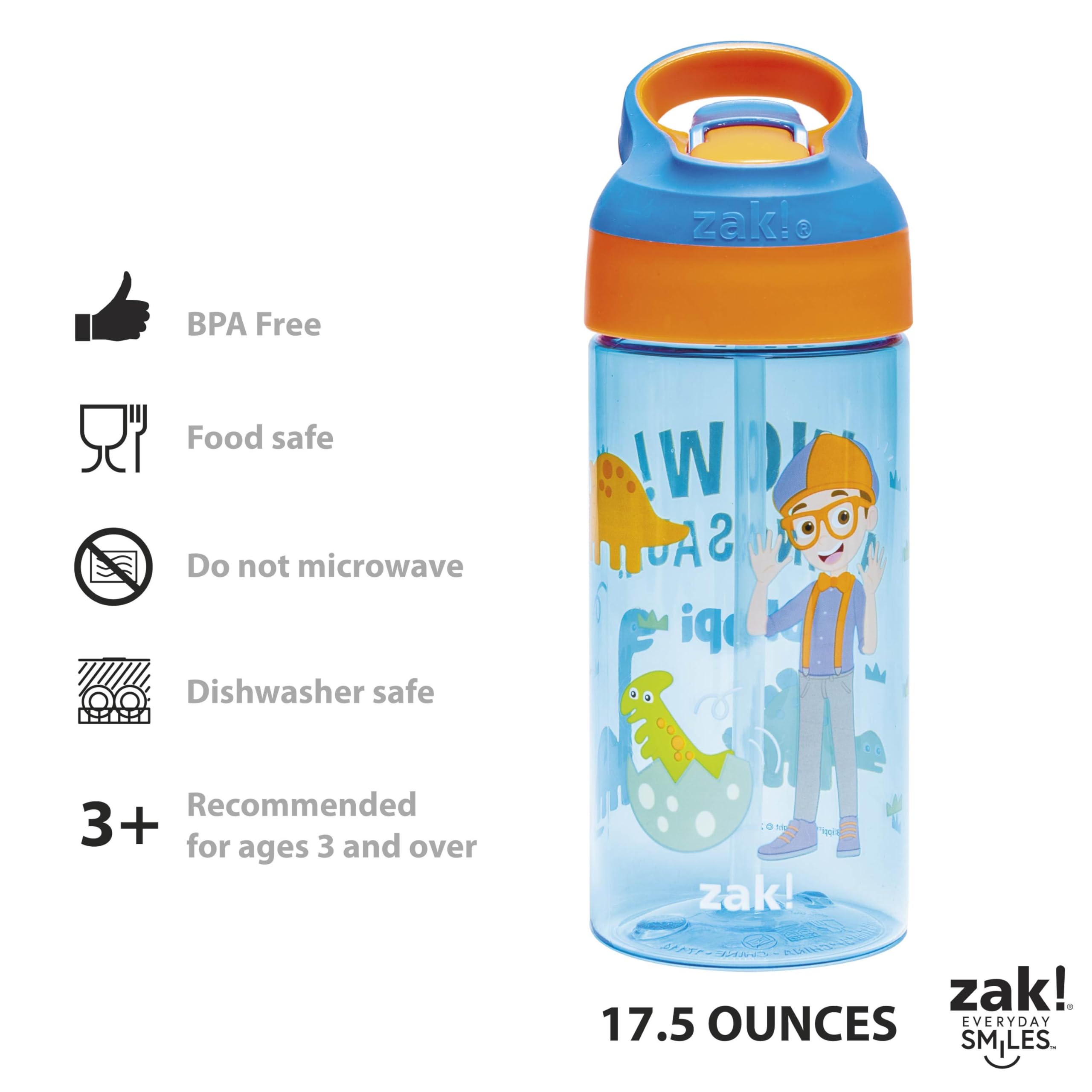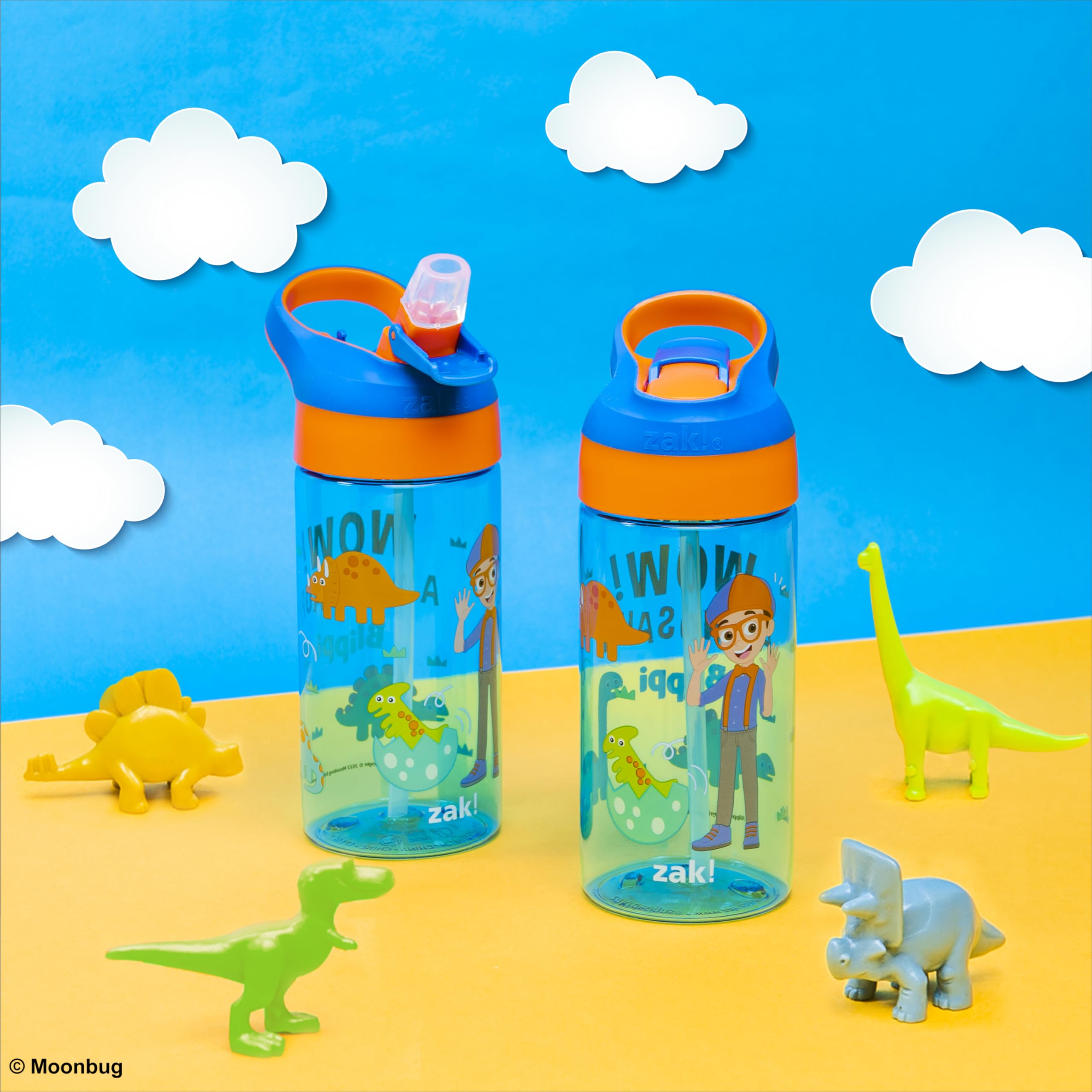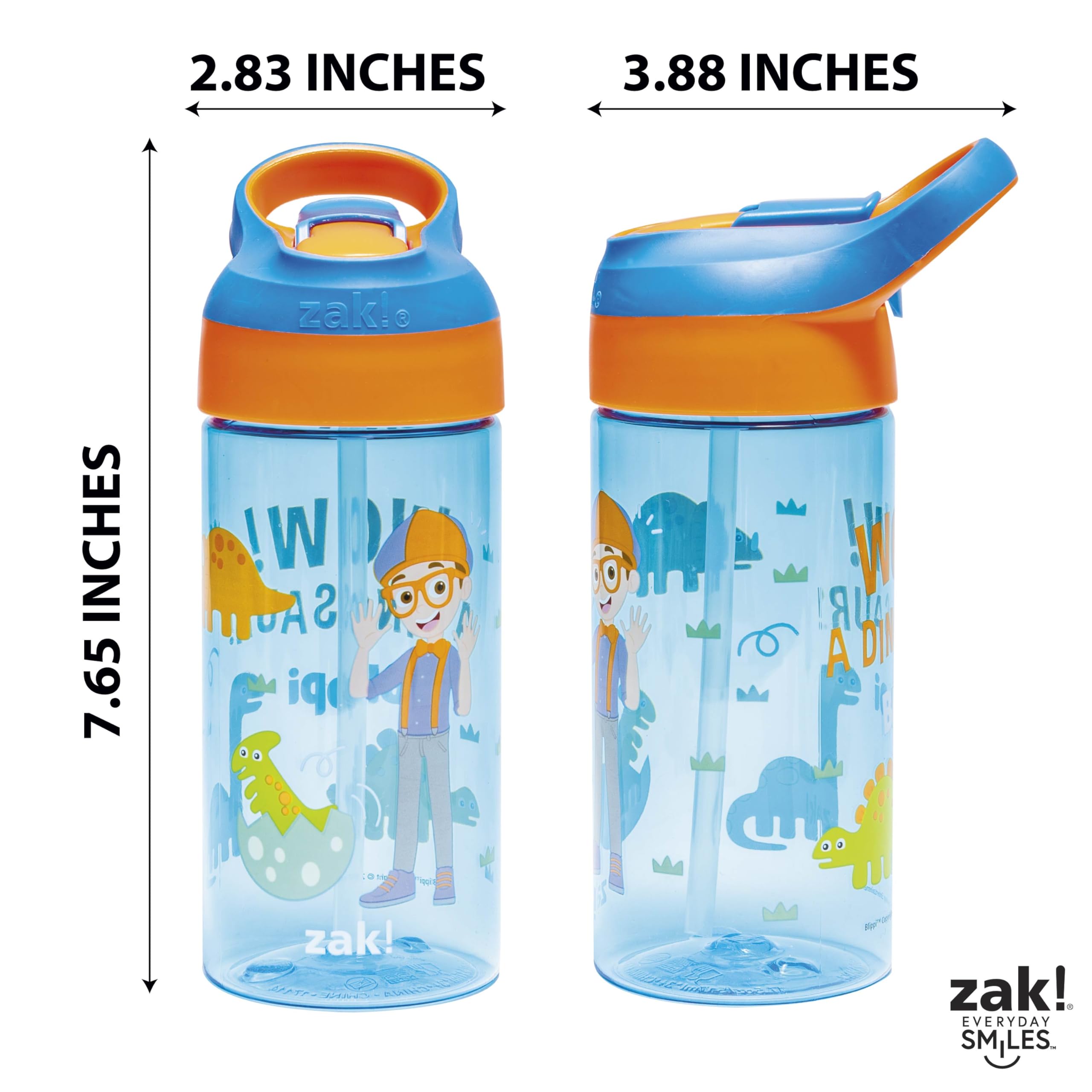 Let kids enjoy hydration with fun Blippi water bottles by Zak Designs! Reusable and Durable Material: Reusable water bottles will last wash after wash; good for you and good for the environment! The drinking bottle is made of plastic, which is dishwasher safe and durable enough for kids to use every day. Leak-Proof Lid: The lid screws on securely and won't leak when the spout is closed. A button release to flip up the spout keeps drinks easy to access, and when the spout is open, a vent allows liquid to flow freely so it's easy for kids to drink. On the Go: The water bottle has a built-in carrying loop on the lid for easy transportation and fits in most car cup holders, with a cover to help keep the spout clean. Specifications: Set includes 2 water bottles. 17.5 oz capacity. Made of durable plastic. Dishwasher safe, do not microwave. Length: 3.88-inch, Width: 2.83-inch, Height: 7.65-inch. Character: Blippi.