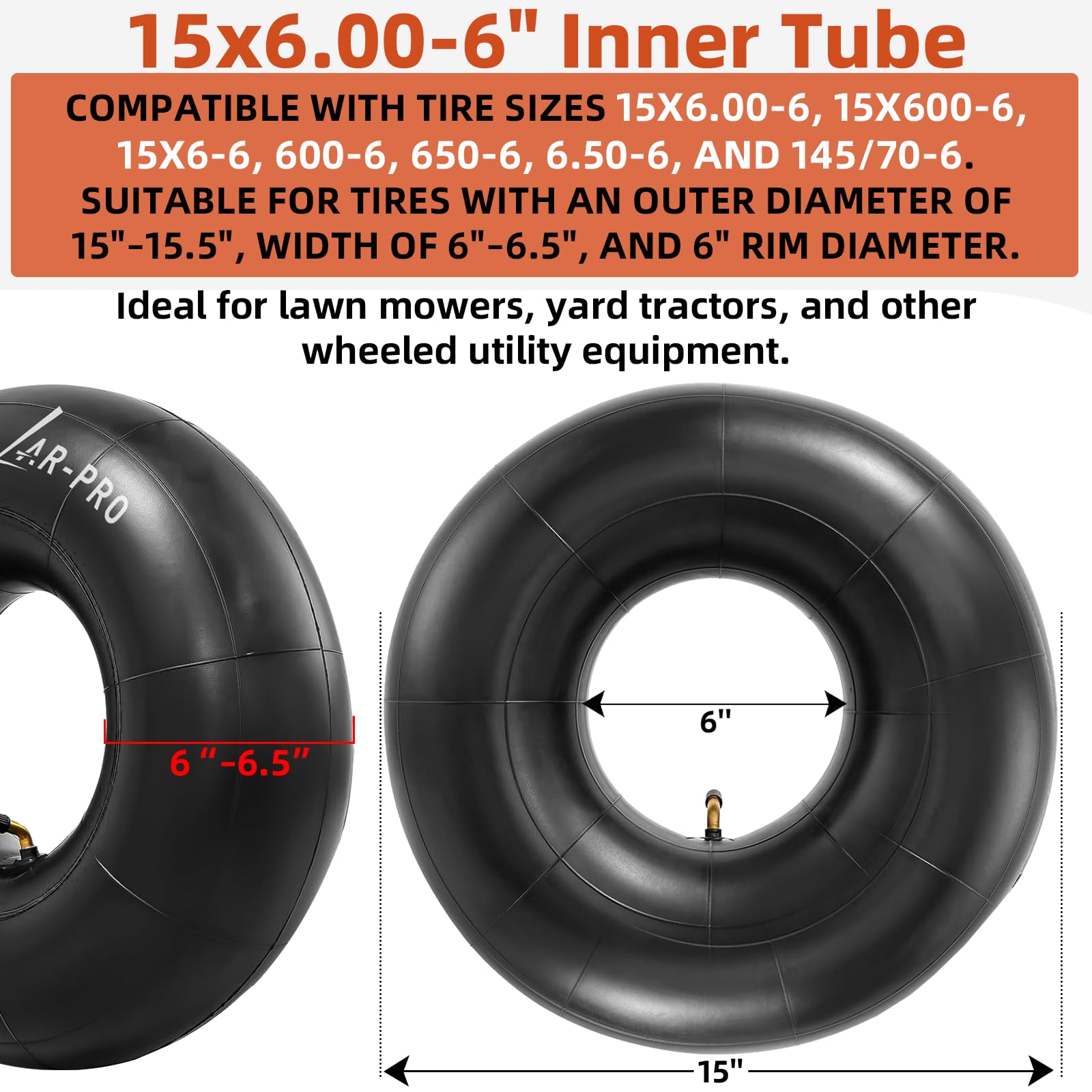 Precise Fit for 15x6.00-6 Tires - Compatible with tire sizes 15x6.00-6, 15x600-6, 15x6-6, 600-6, 650-6, 6.50-6, and 145/70-6. Suitable for tires with an outer diameter of 15"–15.5", width of 6"–6.5", and 6" rim diameter. Ideal for lawn mowers, yard tractors, and other wheeled utility equipment.