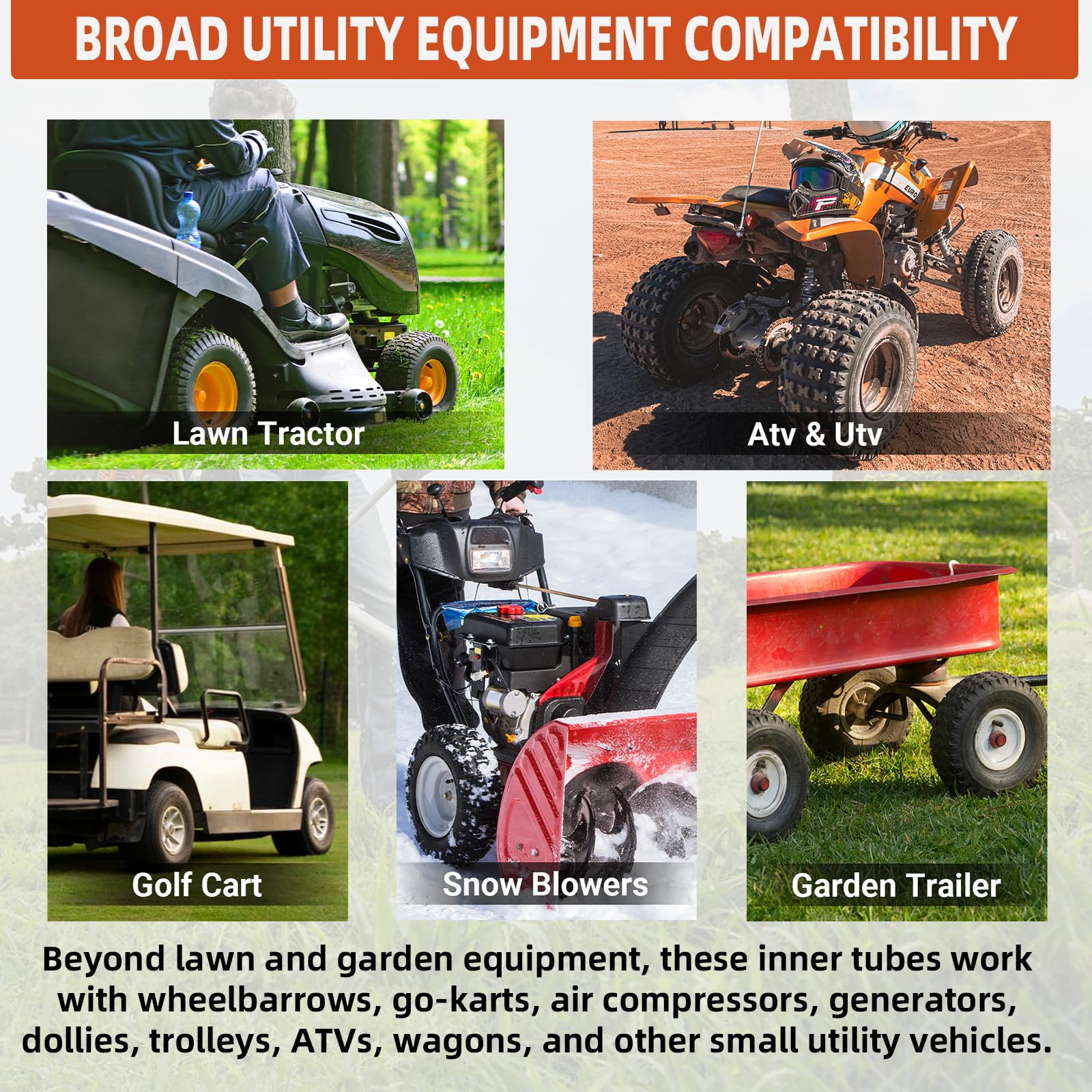Broad Utility Equipment Compatibility -Beyond lawn and garden equipment, these inner tubes work with wheelbarrows, go-karts, air compressors, generators, dollies, trolleys, ATVs, wagons, and other small utility vehicles. Supports multiple inflation needs across tools and terrain types.
