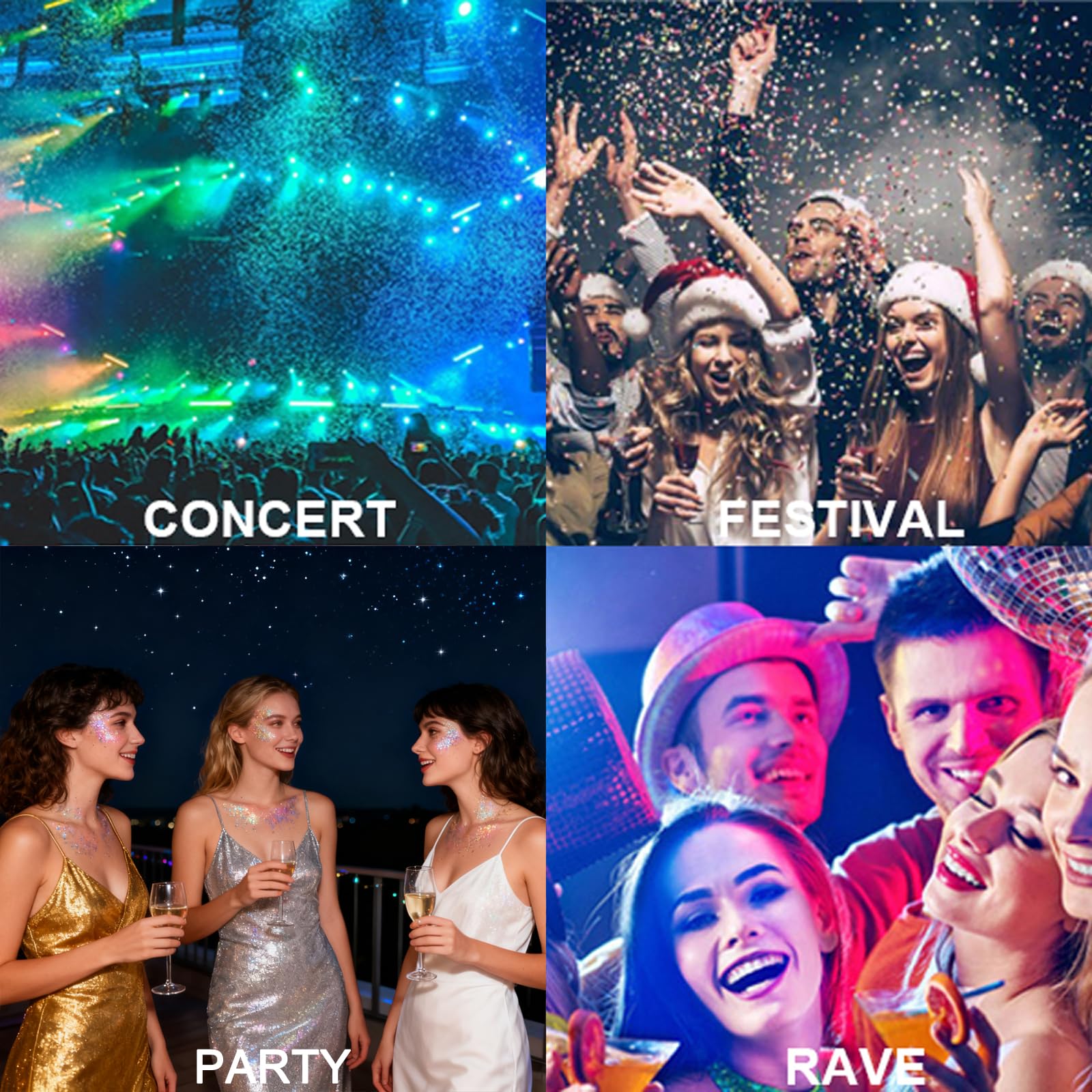 【Waterproof but Easy to Clean】 Face glitter is waterproof and long lasting, lasts through water and sweat. But also easy to remove when you want it to, just wash off with water and soap or shampoo, quick and clean.