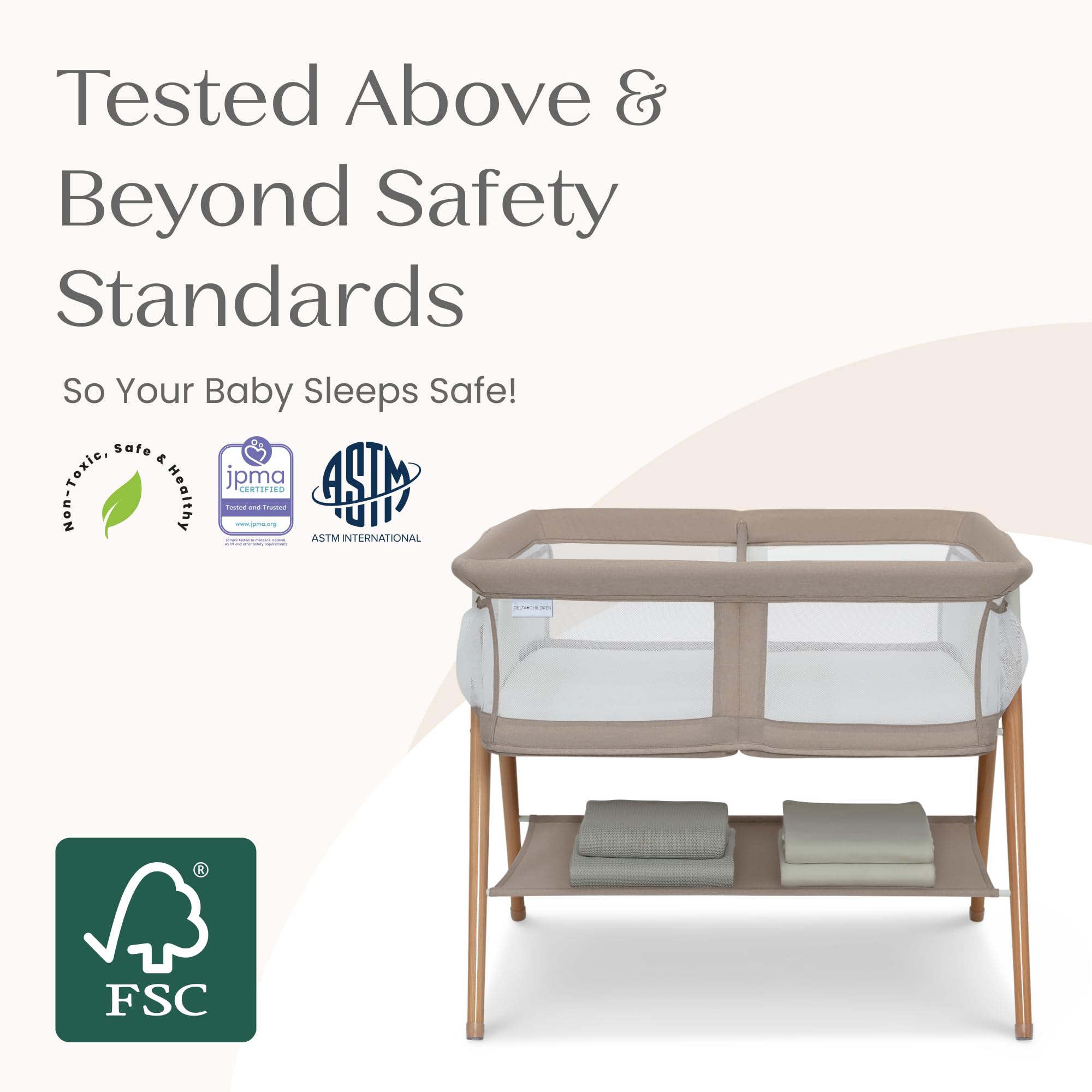 SAFE CHOICE: This bassinet JPMA certified to meet or exceed all safety standards set by the CPSC & ASTM | Non-skid feet keep the bassinet securely in place | Assembled dimensions: 34.5”L x 35.5”W x 30.5”H | Product weight: 22.9 lbs. | Bassinet includes 2 water-resistant mattress pads and 2 breathable fitted sheets