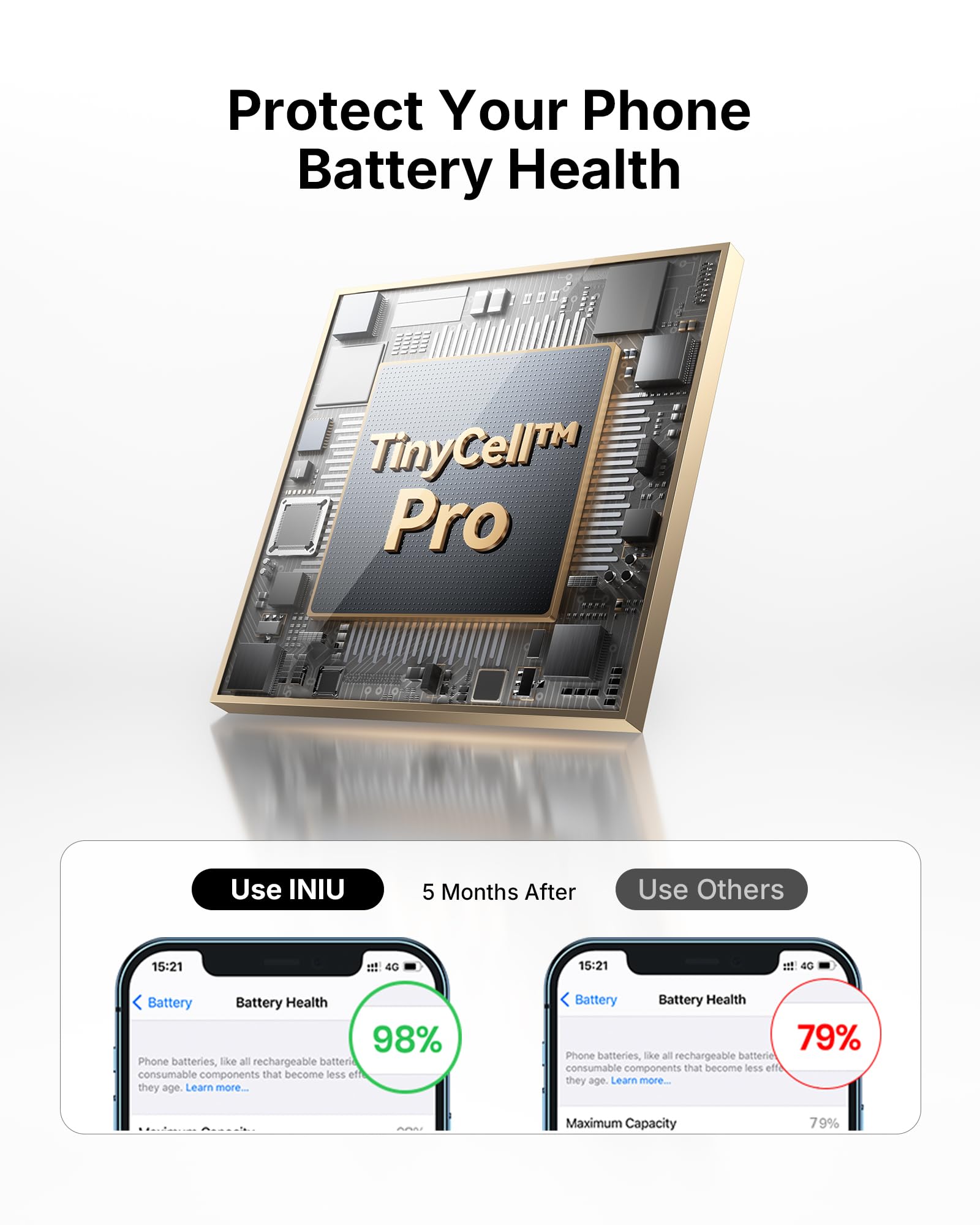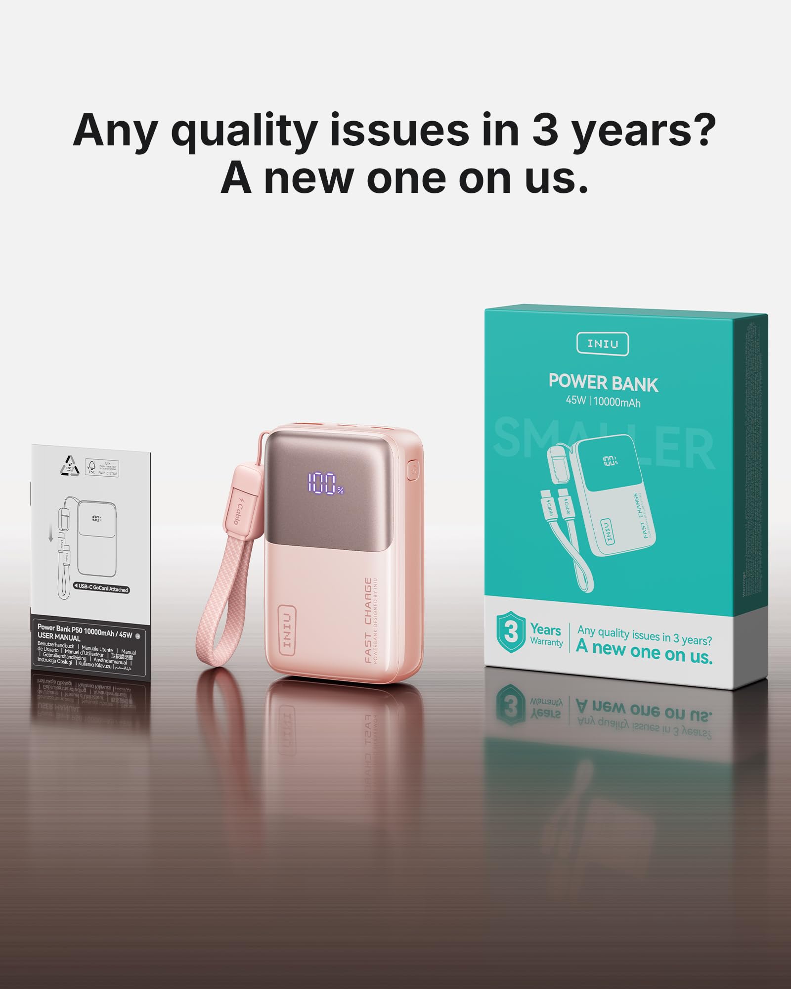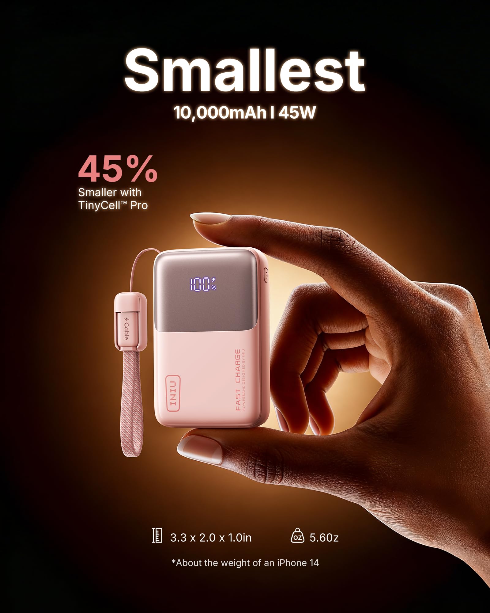 INIU Redefine Smallest 10000mAh: INIU’s latest 10,000mAh power bank, featuring the industry-first TinyCell Pro battery, redefines the industry standard for the smallest size. It's 45% smaller than the standard 10,000mAh—seeing is believing!