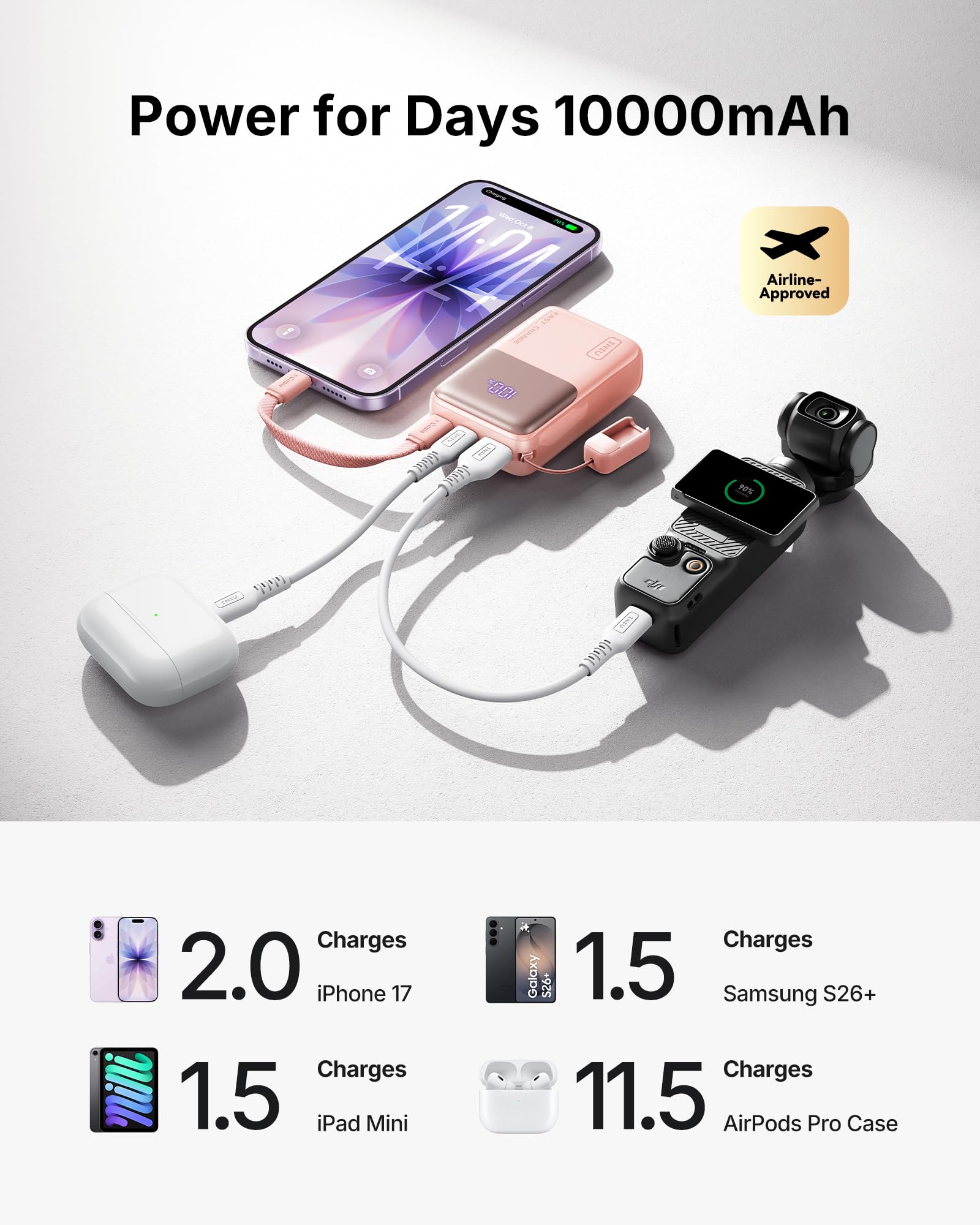 Power for Days 10000mAh: If you're looking for a power bank that covers daily use, short trips, and business travel, 10,000mAh is the perfect choice. It can charge your iPhone 16 twice, your Samsung S24 1.5 times, and your iPad mini 1.5 times.