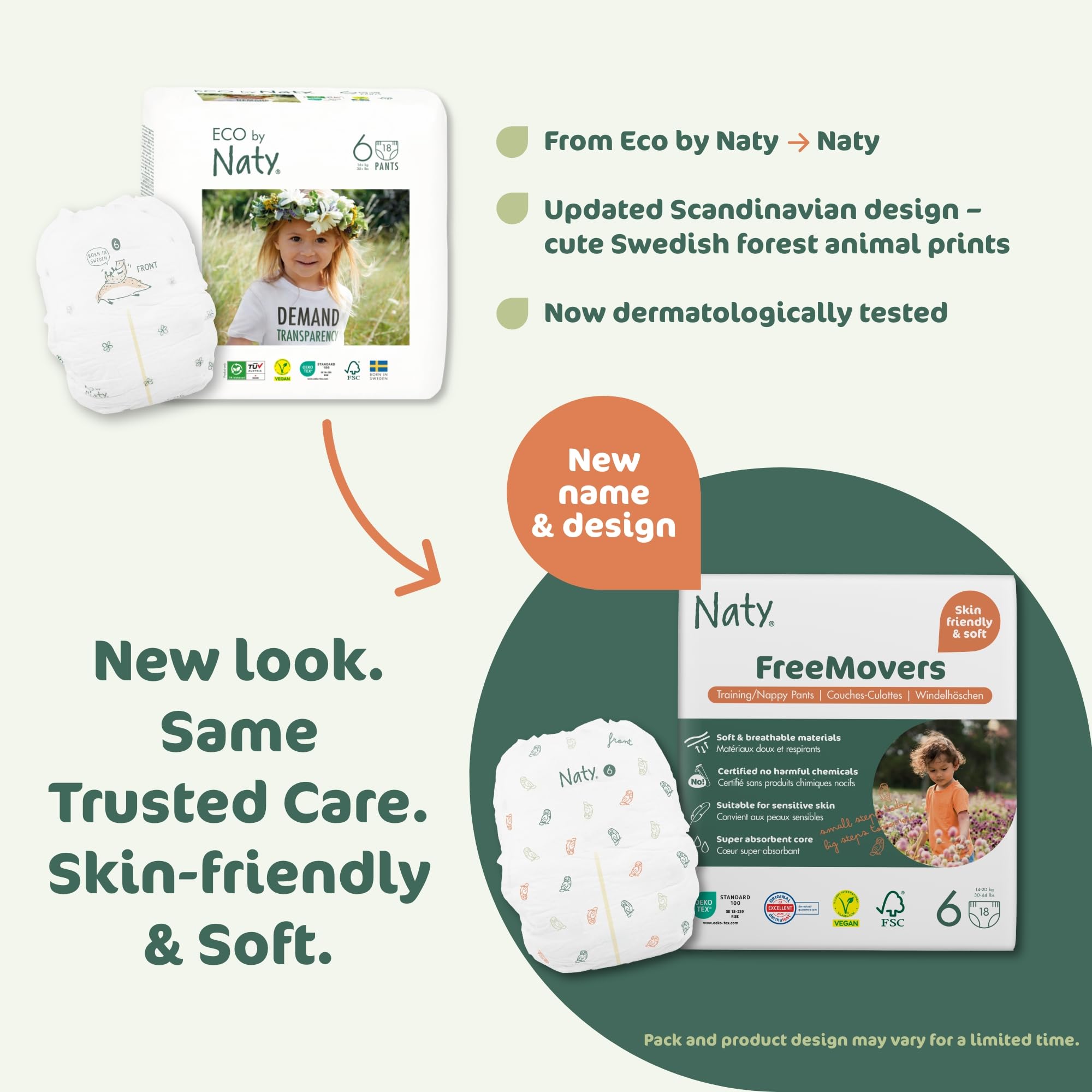 Product Description Naty FreeMovers Diaper Pants are designed for the crawling, cruising, and constantly-on-the-move stage of your babyβs development. These pull-on diaper pants combine soft, breathable materials with flexible, gentle construction to support active babies or toddlers during potty training or everyday wear. With an underwear-like feel and a comfortable, breathable waistband, FreeMovers deliver the independence kids love and the protection parents trust. Each training pant features a high-performance absorbent core made with FSC-certified pulp and supersabsorbents for fast absorption and reliable dryness helping reduce the risk of irritation for sensitive skin. The 360Β° stretchy fit moves naturally with your baby, while tear-away sides and a closing tab make quick changes easier at home or on the go. Certified skin-safe and made without fragrance, lotion, or latex, these toddler training diapers are ideal for babies with delicate skin. Scandinavian forest-animal prints add a playful touch inspired by Natyβs Swedish roots. With 30 years of expertise in certified skin-safe hygiene care, Naty delivers performance, comfort, and thoughtful design in every Freemovers diaper pant. Amazon.com Eco by Naty Premium Pull On Pants for Sensitive Skin