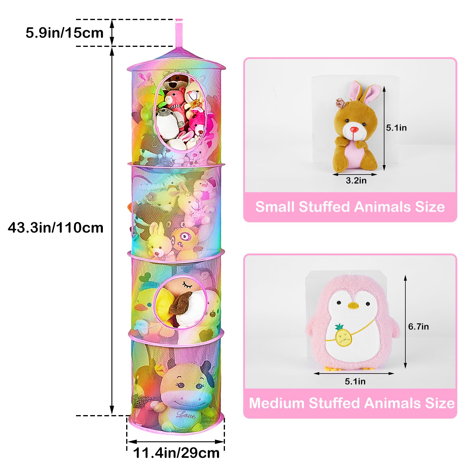 Size and Package: Stuffed animals organizer holder 3 tiers size is 11.4 " x 11.4 " x 32.6 ", 4 tiers size is 11.4 " x 11.4 " x 43.3 ", 5 tiers size is 11.4 " x 11.4 " x 55 ", top with wide loop, easy to open and close, for hanging; No special installation is required, and hanging it on a hook or a closet at will, the package contains 2 pcs of stuffed animals storage