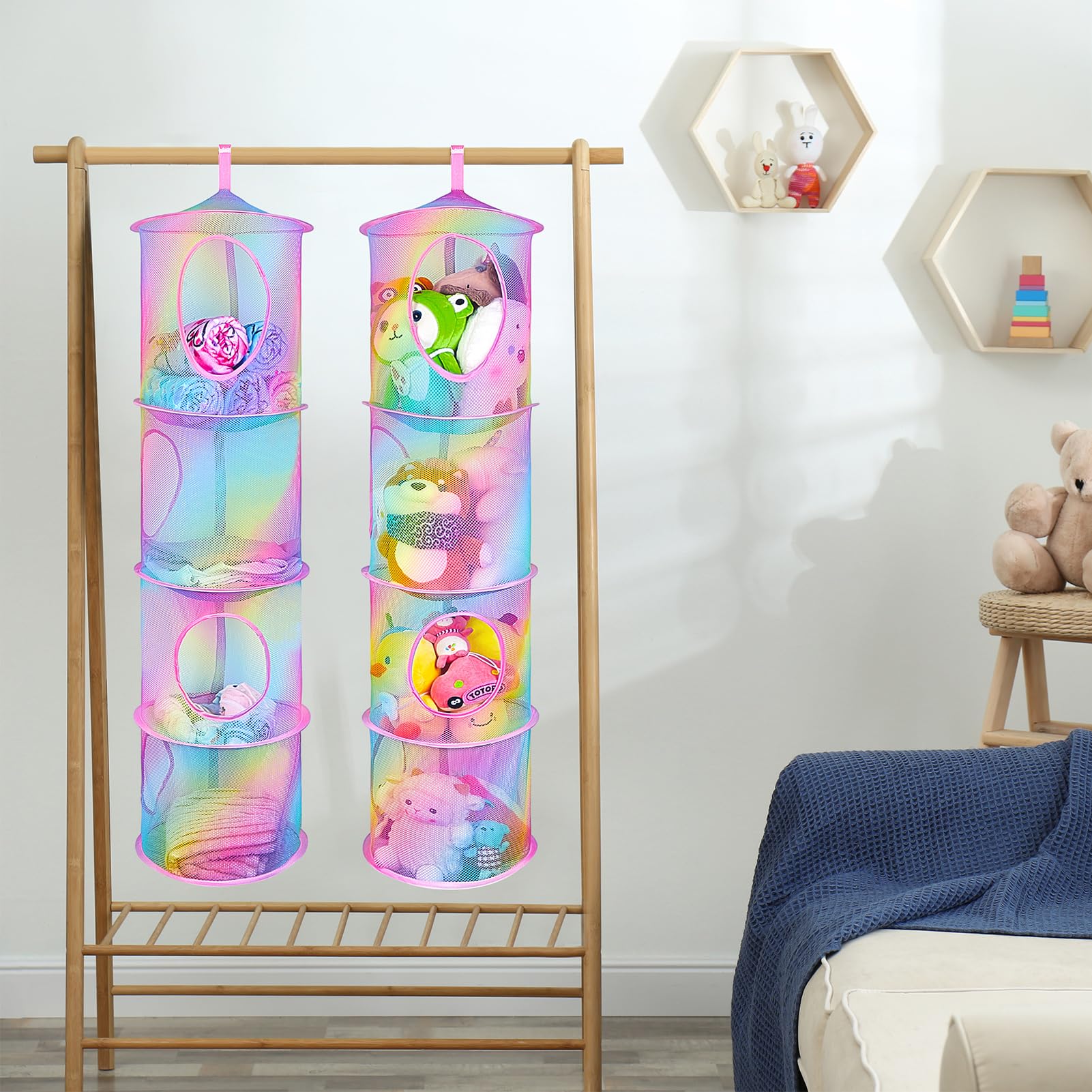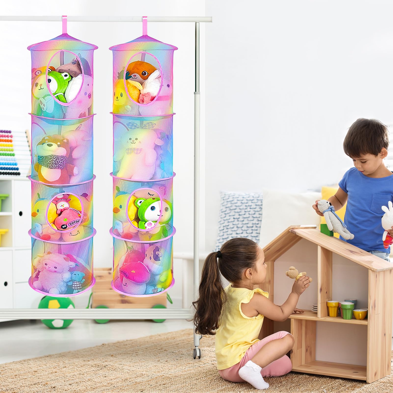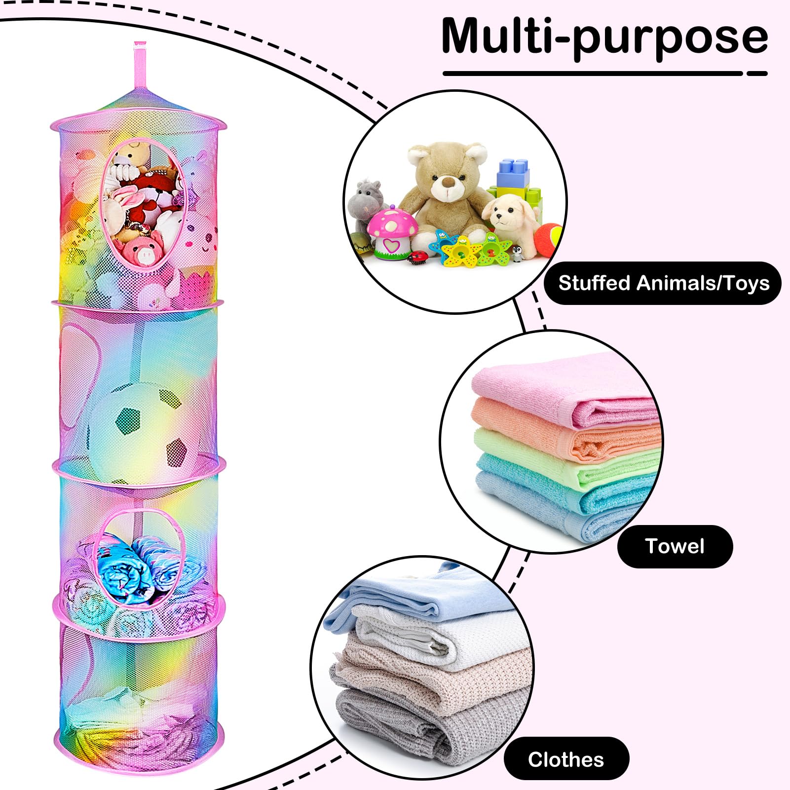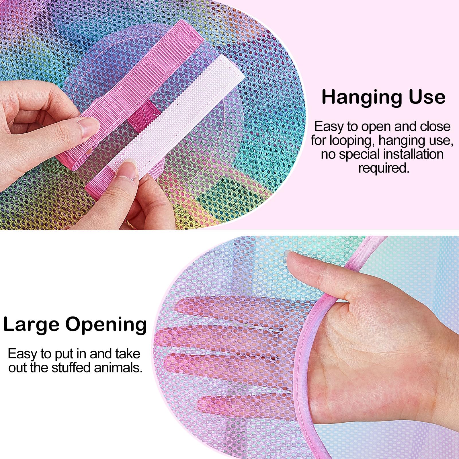 Stuffed Animals Storage: Creative collapsible design and customized unique colors, hanging use and maximizes utilization of standing space, different direction for putting items, convenient to use, easy fold when not use, saving space