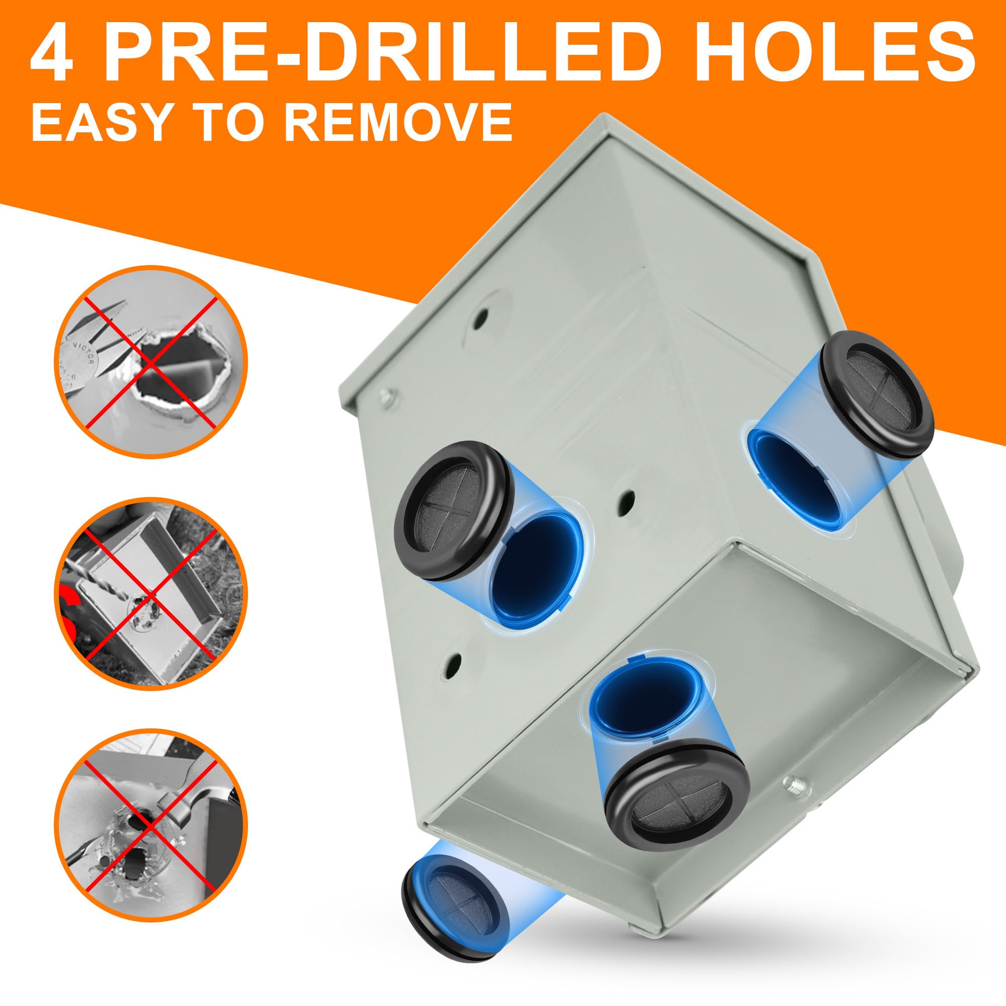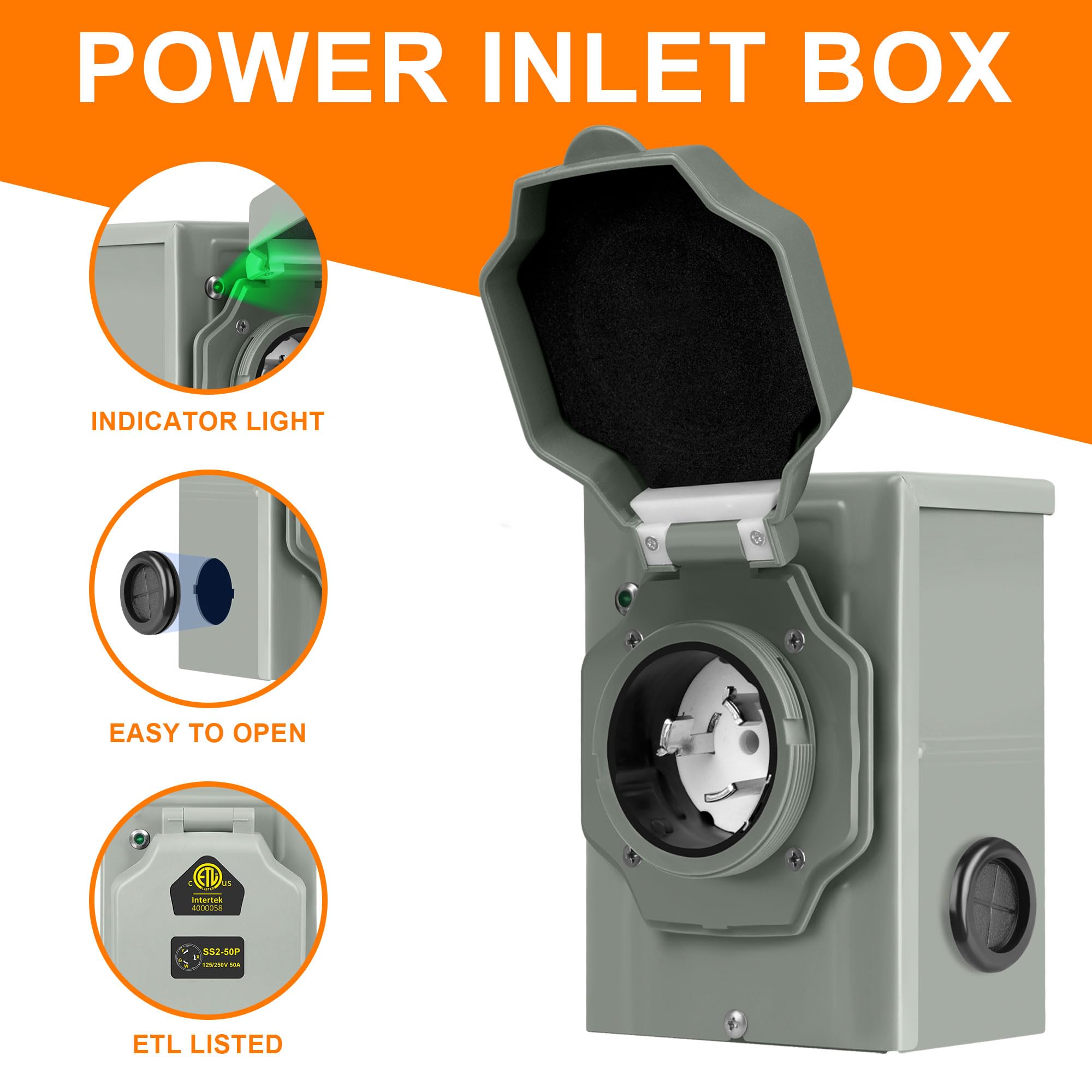【ETL-Listed Pre-drilled Generator Inlet Box】3 prong 50 amp generator inlet box: NEMA SS2-50P; Max Wattage: 12500 watts; Green indicator light; Power inlet box is designed with 4 pre-drilled holes distributing in 4 directions, which allows direct connection to switches and electrical panels from multiple directions
