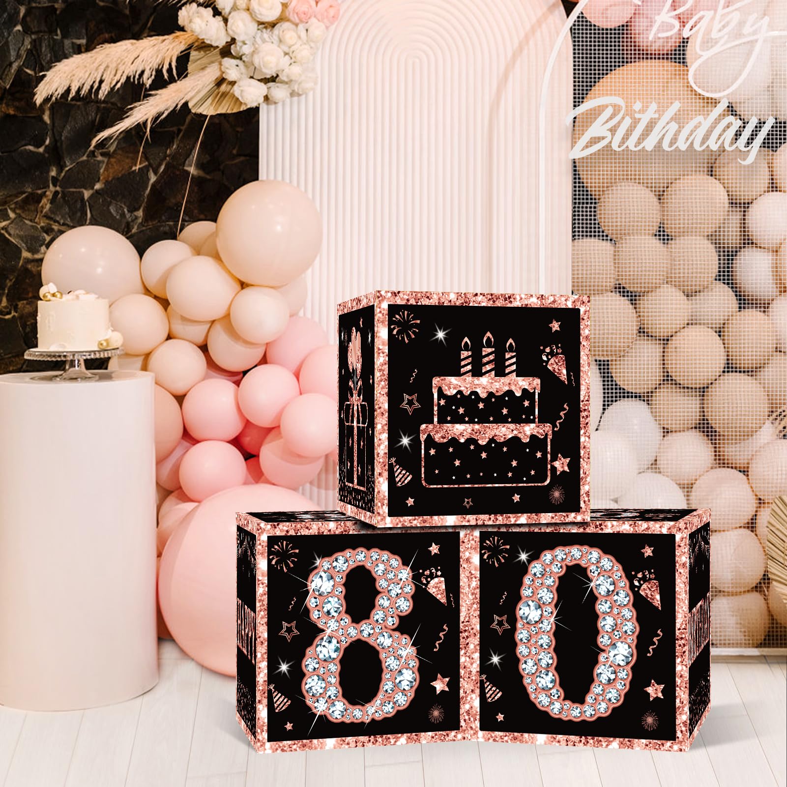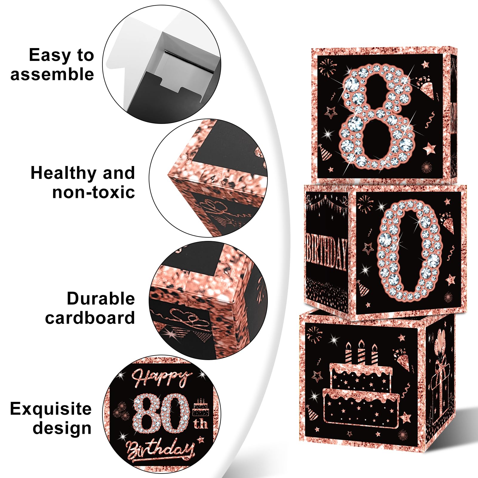 [You Will Receive] -3pcs rose gold 80th birthday balloon boxes decorations, the size of each box is 10.62×10.62×10.62inch. This set of great 80th birthday party display decorations. (Note: This set of decorations does not include balloons).