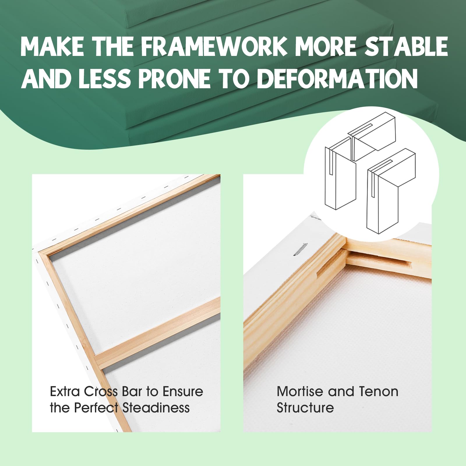 Wood Frame:The 18x24 large canvas for painting is nailed firmly to the pinewood frame, extra cross bar to ensure the perfect steadiness, 5/8 inch thick frame structure,It's sturdy and doesn't deform easily. The high quality will enhance your painting experience.
