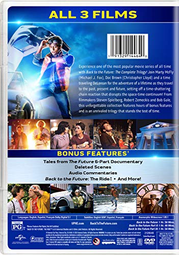 Experience one of the most popular movie series of all time with Back to the Future: The Complete Trilogy! Join Marty McFly (Michael J. Fox), Doc Brown (Christopher Lloyd) and a time traveling DeLorean for the adventure of a lifetime as they travel to the past, present and future, setting off a time-shattering chain reaction that disrupts the space-time continuum! From filmmakers Steven Spielberg, Robert Zemeckis and Bob Gale, this unforgettable collection features hours of bonus features and is an unrivaled trilogy that stands the test of time. Bonus Content: Disc 1 - Back to the Future: Deleted Scenes Tales from the Future: In the Beginning… Tales from the Future: Time to Go Tales from the Future: Keeping Time Q&A Commentary with Director Robert Zemeckis and Producer Bob Gale Feature Commentary with Producers Bob Gale and Neil Canton Disc 2 - Back to the Future Part II: Deleted Scene Tales from the Future: Time Flies The Physics of Back to the Future Q&A Commentary with Director Robert Zemeckis and Producer Bob Gale Feature Commentary with Producers Bob Gale and Neil Canton Disc 3 - Back to the Future Part III: Deleted Scene Tales from the Future: Third Time's the Charm Tales from the Future: The Test of Time Back to the Future: The Ride Q&A Commentary with Director Robert Zemeckis and Producer Bob Gale Feature Commentary with Producers Bob Gale and Neil Canton