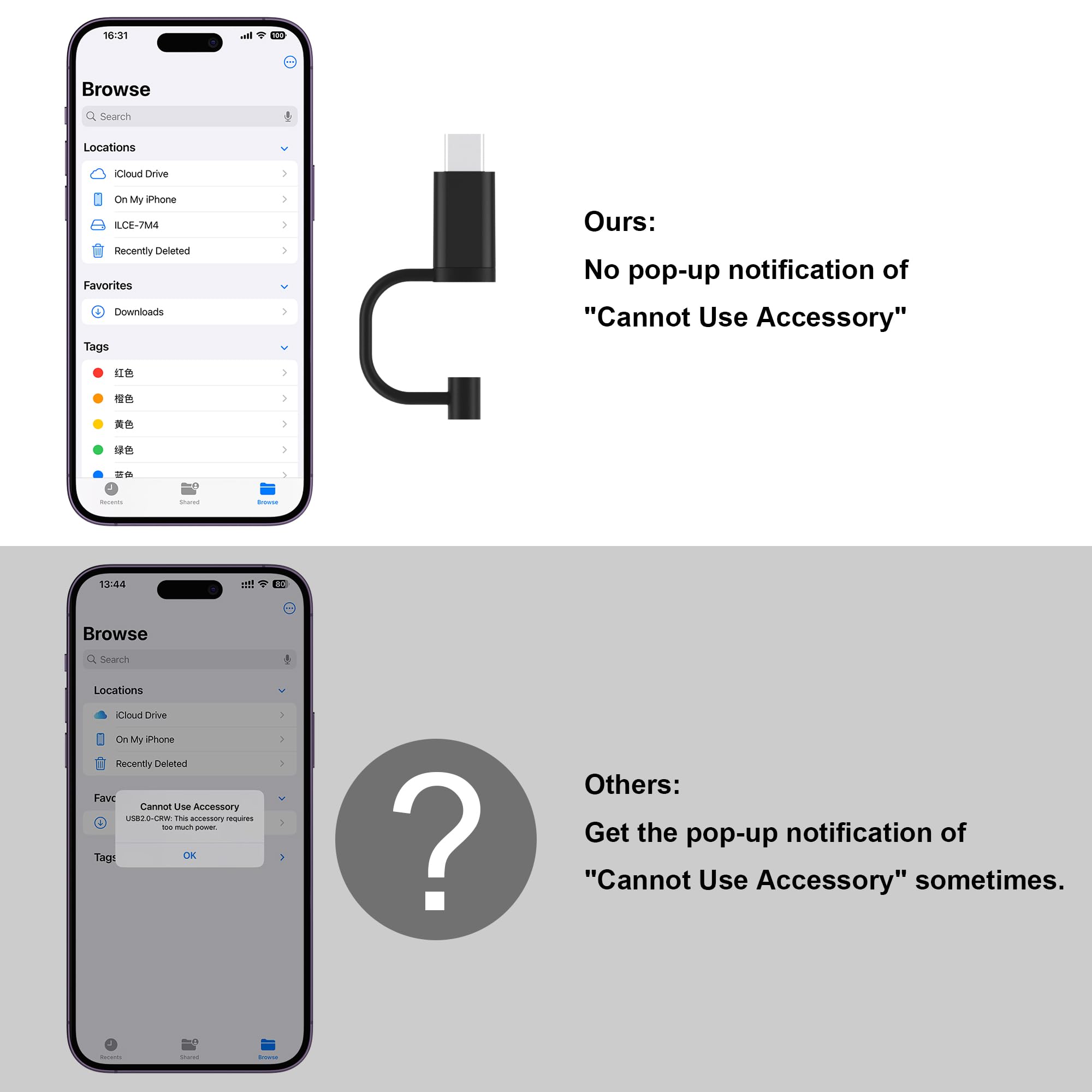 [The Female USB Interface]: Lightning to USB adapter has the Female USB Interface is a OTG Camera Adapter for iPhone &iPad, supports Digital camera, SLR Camera, The USB camera adapter does not require an application, and there is no need to remove the camera's memory card. You Can also plug the USB Flash Drive, Card reader, USB Headphone, Electric Guitar, MIDI keyboard, etc. (The maximum current of the peripherals does not exceed 500 mA). Not Support the Printer and Hard disk drive.