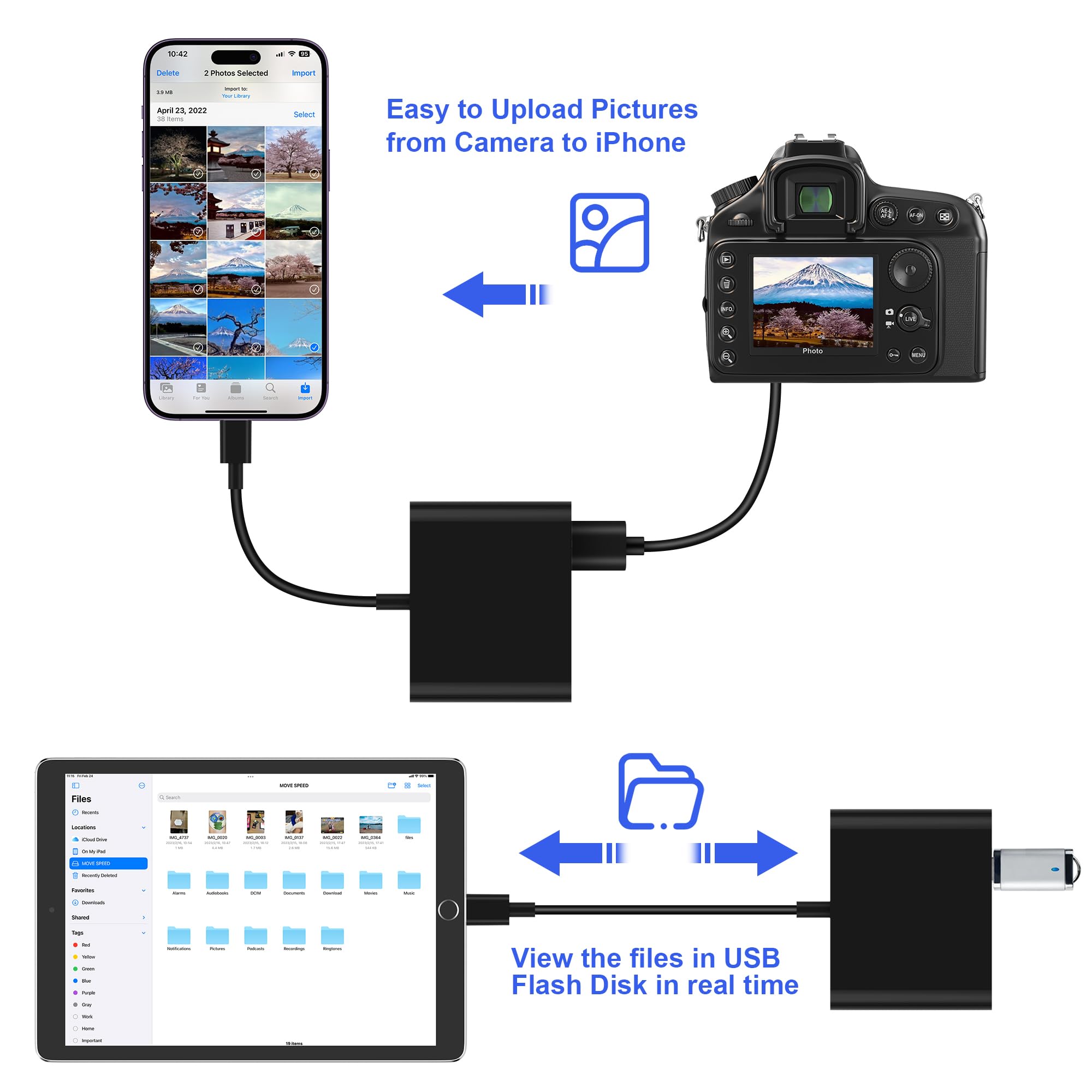 [High Speed Data Transfer]: Support fast transfers standard photo formats, including JPEG, RAW, along with SD and HD video formats, including H.264 and MPEG-4. Easily and quickly transfer photos/videos to device and share images/videos of your camera to social media anywhere.