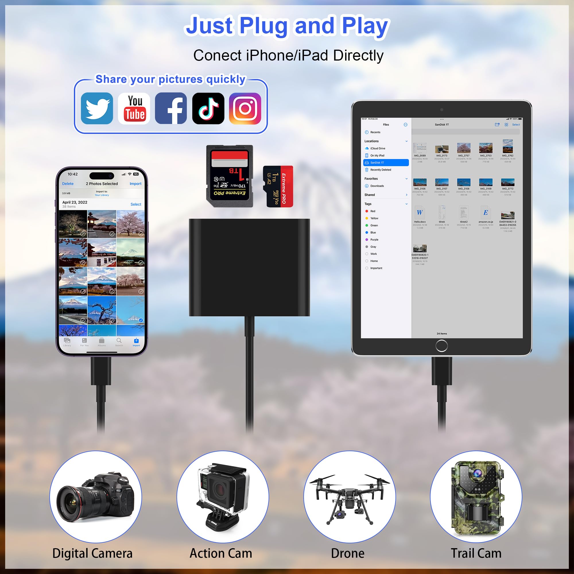 [Two-way Transfer]: Two-way transfer suitable for iOS 13 -18 device. Import data from SD/TF card to iPhone/iPad, or export the file from iPhone/iPad to SD/TF card. Include Movies, Music, Word, Power point, Excel, PDF, etc.