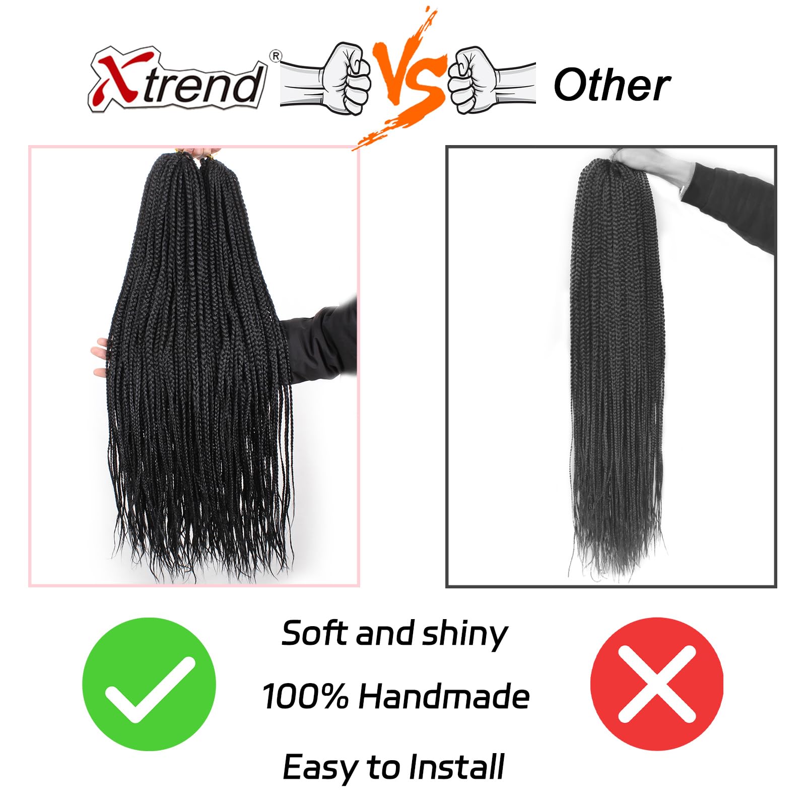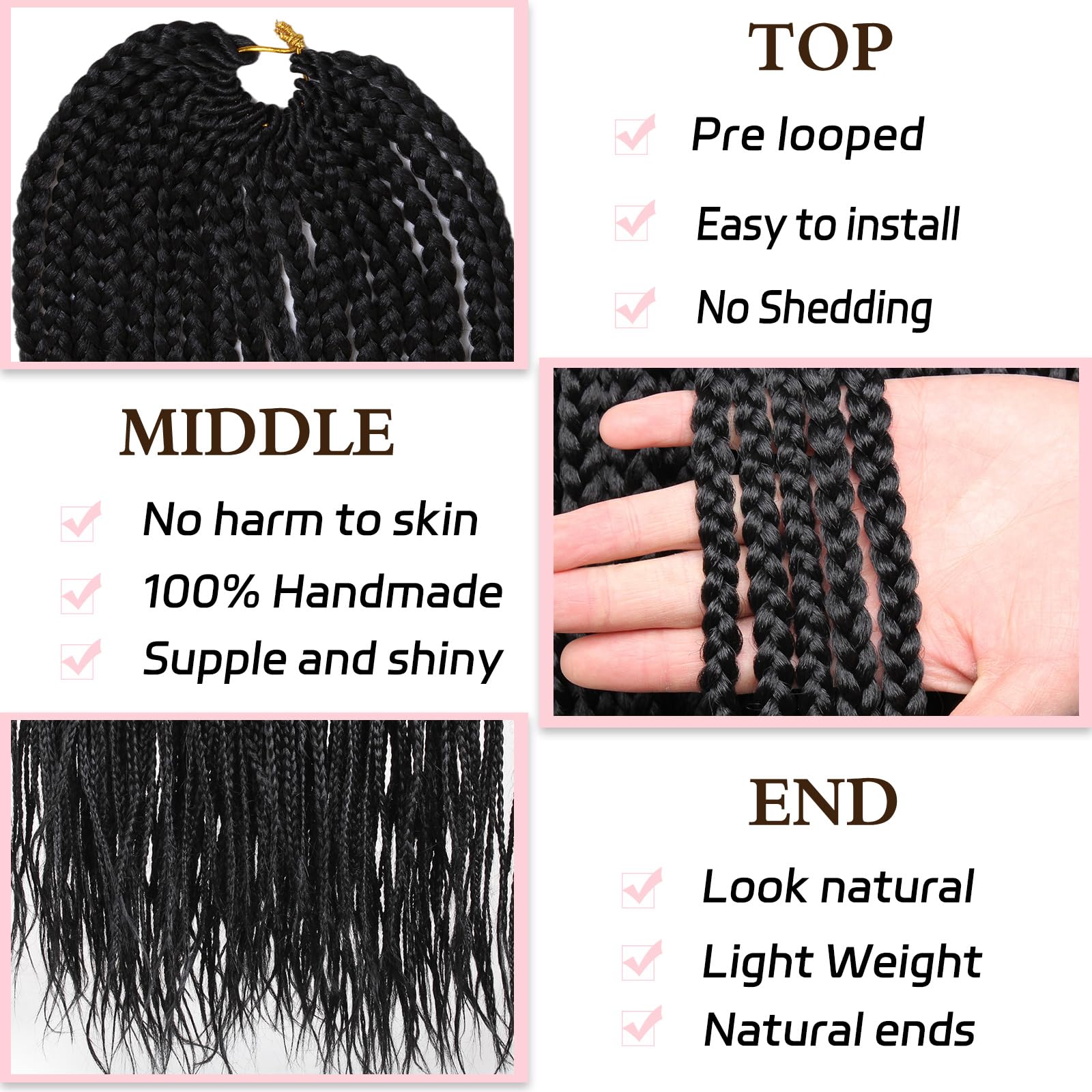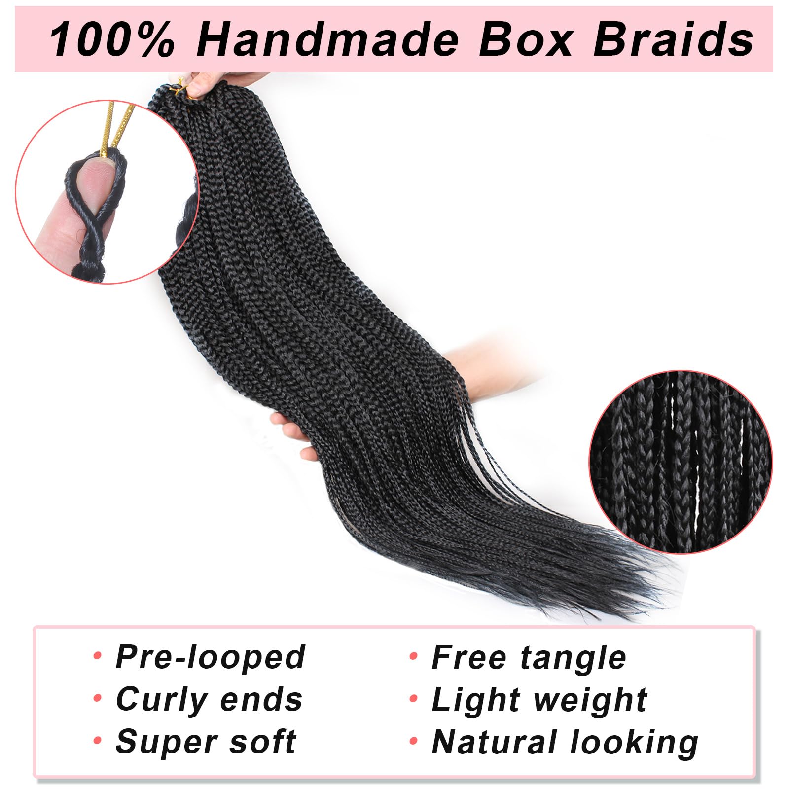 Features:Box braids crochet hair is 100% handmade, light weight, easy to install, because they have been pre-looped in advance, especially for beginners, it can save more time to make hairstyles.