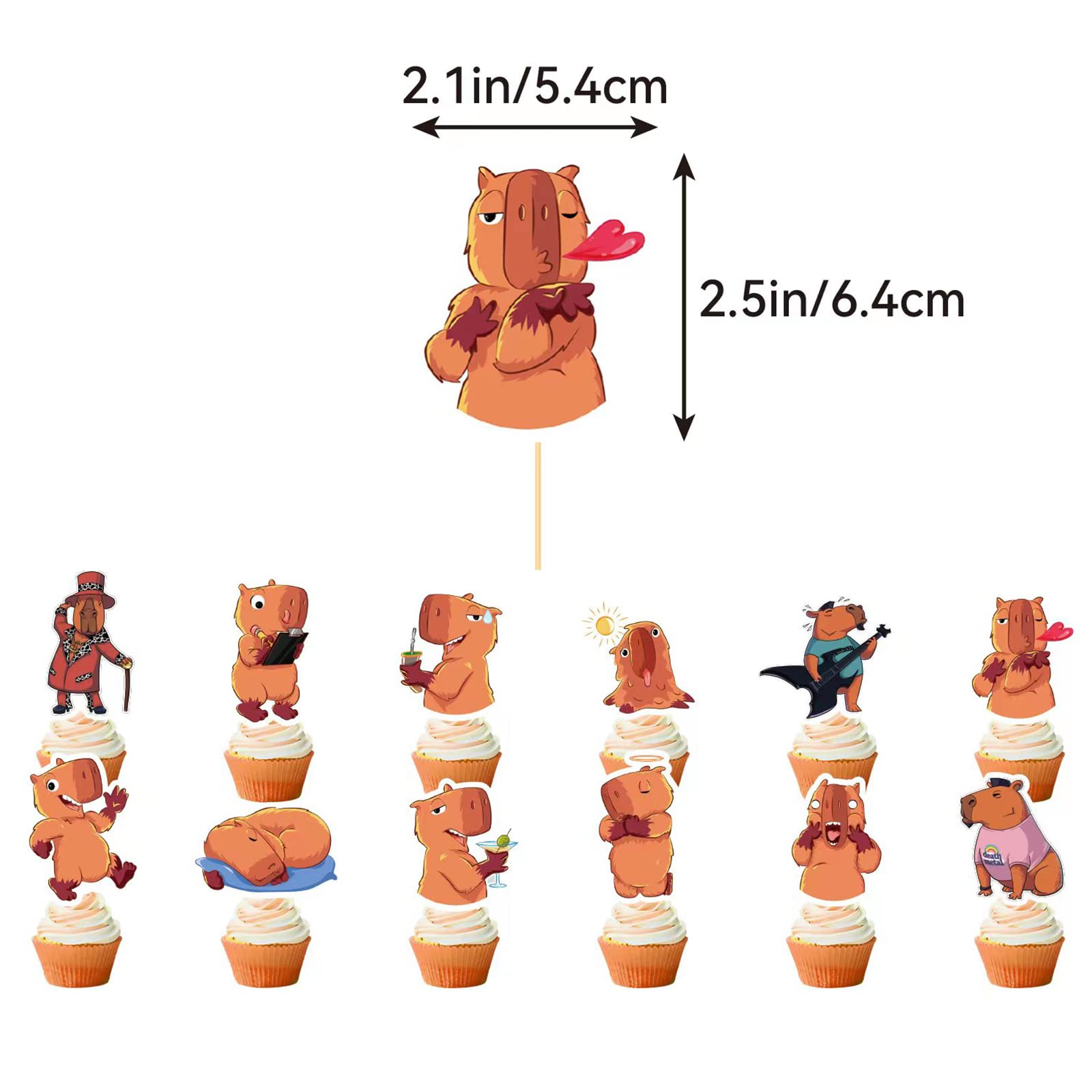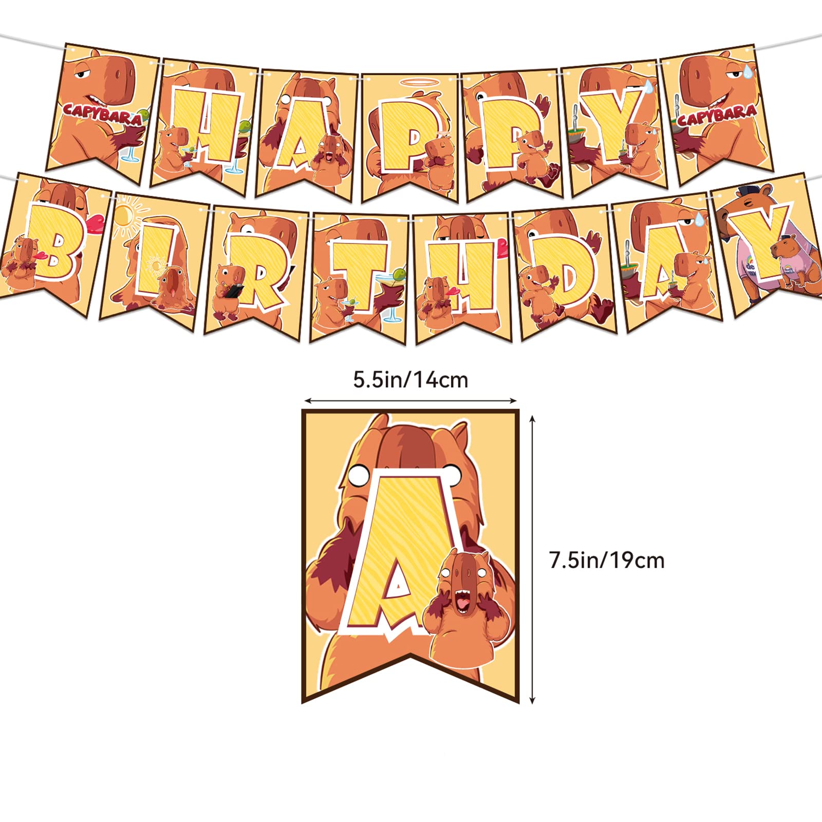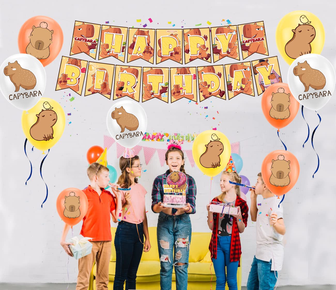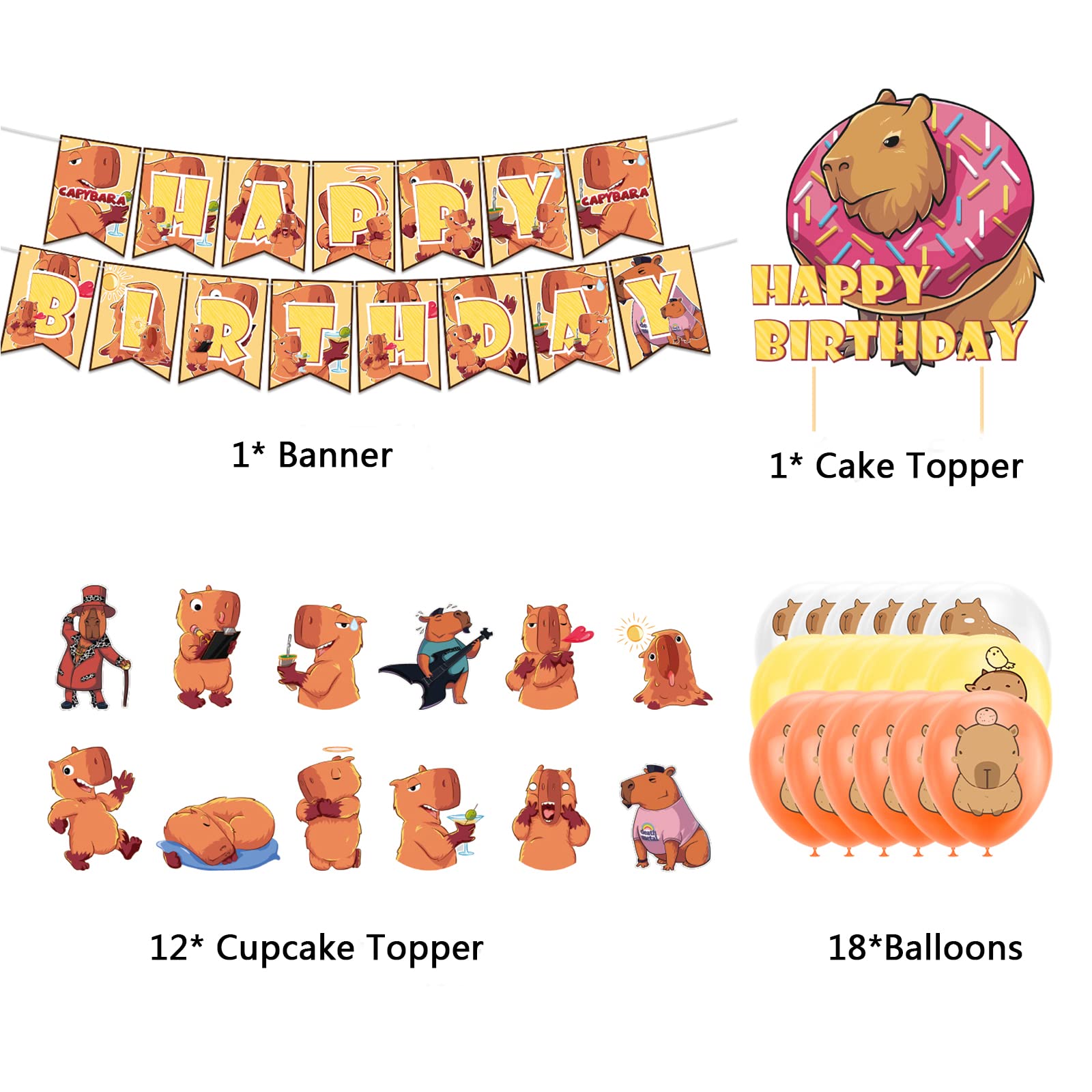 Capybara Party Decorations: Package includes 1* capybara HAPPY BIRTHDAY banner, 1*capybara HAPPY BIRTHDAY cake topper, 12* capybara cupcake toppers, 18* capybara balloons