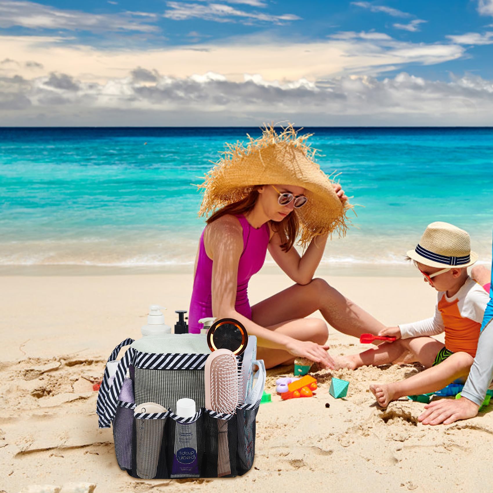 Ample Storage Space : Shower bag has eight outer pockects and a large center one, the main pockets can keep bigger stuffs easily accessible like shampoo,towel, toiletries, hair dryer. Side pockets can contain toothbrush, shaver and keeps them organized